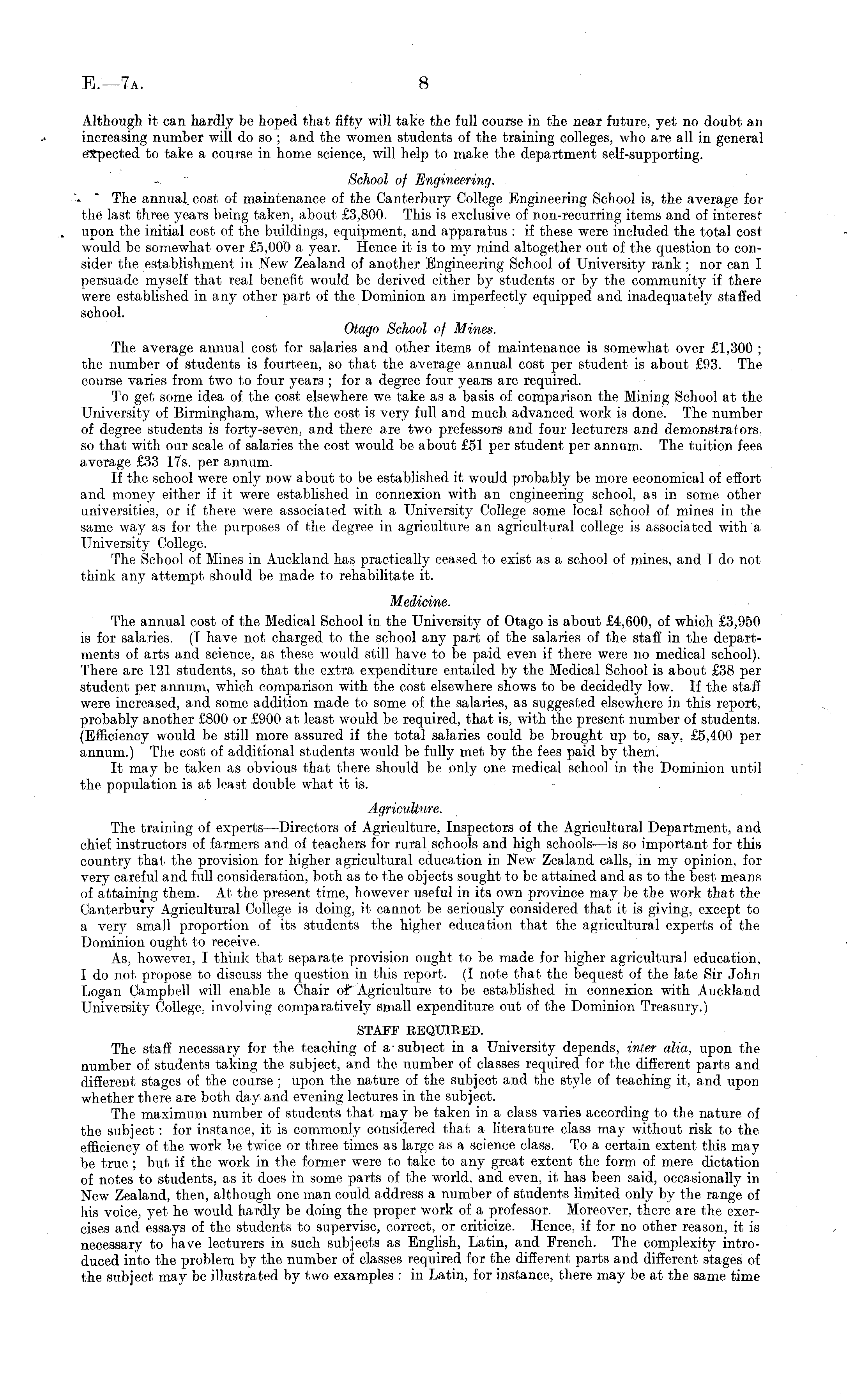 Although it can hardly be hoped that fifty will take the full course in the near future, yet no doubt an increasing number will do so ; and the women students of the training colleges, who are all in general expected to take a course in home science, will help to make the department self-supporting. School of Engineering. - ' The annual, cost of maintenance of the Canterbury College Engineering School is, the average for the last three years being taken, about £3,800. This is exclusive of non-recurring items and of interest upon the initial cost of the buildings, equipment, and apparatus : if these were included the total cost would be somewhat over £5,000 a year. Hence it is to my mind altogether out of the question to consider the establishment in New Zealand of another Engineering School of University rank ; nor can I persuade myself that real benefit would be derived either by students or by the community if there were established in any other part of the Dominion an imperfectly equipped and inadequately staffed school. Otago School of Mines. The average annual cost for salaries and other items of maintenance is somewhat over £1,300 ; the number of students is fourteen, so that the average annual cost per student is about £93. The course varies from two to four years ; for a degree four years are required. To get some idea of the cost elsewhere we take as a basis of comparison the Mining School at the University of Birmingham, where the cost is very full and much advanced work is done. The number of degree students is forty-seven, and there are two prefessors and four lecturers and demonstrators : so that with our scale of salaries the cost would be about £51 per student per annum. The tuition fees average £33 17s. per annum. If the school were only now about to be established it would probably be more economical of effort and money either if it were established in connexion with an engineering school, as in some other universities, or if there were associated with a University College some local school of mines in the same way as for the purposes of the degree in agriculture an agricultural college is associated with a University College. The School of Mines in Auckland has practically ceased to exist as a school of mines, and I do not think any attempt should be made to rehabilitate it. Medicine. The annual cost of the Medical School in the University of Otago is about £4,600, of which £3,950 is for salaries. (I have not charged to the school any part of the salaries of the staff in the departments of arts and science, as these would still have to be paid even if there were no medical school). There are 121 students, so that the extra expenditure entailed by the Medical School is about £38 per student per annum, which comparison with the cost elsewhere shows to be decidedly low. If the staff were increased, and some addition made to some of the salaries, as suggested elsewhere in this report, probably another £800 or £900 at least would be required, that is, with the present number of students. (Efficiency would be still more assured if the total salaries could be brought up to, say, £5,400 per annum.) The cost of additional students would be fully met by the fees paid by them. It may be taken as obvious that there should be only one medical school in the Dominion until the population is at least double what it is. Agriculture. The training of experts —Directors of Agriculture, Inspectors of the Agricultural Department, and chief instructors of farmers and of teachers for rural schools and high schools—is so important for this country that the provision for higher agricultural education in New Zealand calls, in my opinion, for very careful and full consideration, both as to the objects sought to be attained and as to the best means of attaining them. At the present time, however useful in its own province may be the work that the Canterbury Agricultural College is doing, it cannot be seriously considered that it is giving, except to a very small proportion of its students the higher education that the agricultural experts of the Dominion ought to receive. As, howevei, I think that separate provision ought to be made for higher agricultural education, Tdo not propose to discuss the question in this report. (I note that the bequest of the late Sir John Logan Campbell will enable a Chair of Agriculture to be established in connexion with Auckland University College, involving comparatively small expenditure out of the Dominion Treasury.) STAFF REQUIRED. The staff necessary for the teaching of a- subiect in a University depends, inter alia, upon the number of students taking the subject, and the number of classes required for the different parts and different stages of the course ; upon the nature of the subject and the style of teaching it, and upon whether there are both day and evening lectures in the subject. The maximum number of students that may be taken in a class varies according to the nature of the subject : for instance, it is commonly considered that a literature class may without risk to the efficiency of the work be twice or three times as large as a science class. To a certain extent this may be true ; but if the work in the former were to take to any great extent the form of mere dictation of notes to students, as it does in some parts of the world, and even, it has been said, occasionally in New Zealand, then, although one man could address a number of students limited only by the range of his voice, yet he would hardly be doing the proper work of a professor. Moreover, there are the exercises and essays of the students to supervise, correct, or criticize. Hence, if for no other reason, it is necessary to have lecturers in such subjects as English, Latin, and French. The complexity introduced into the problem by the number of classes required for the different parts and different stages of the subject may be illustrated by two examples : in Latin, for 