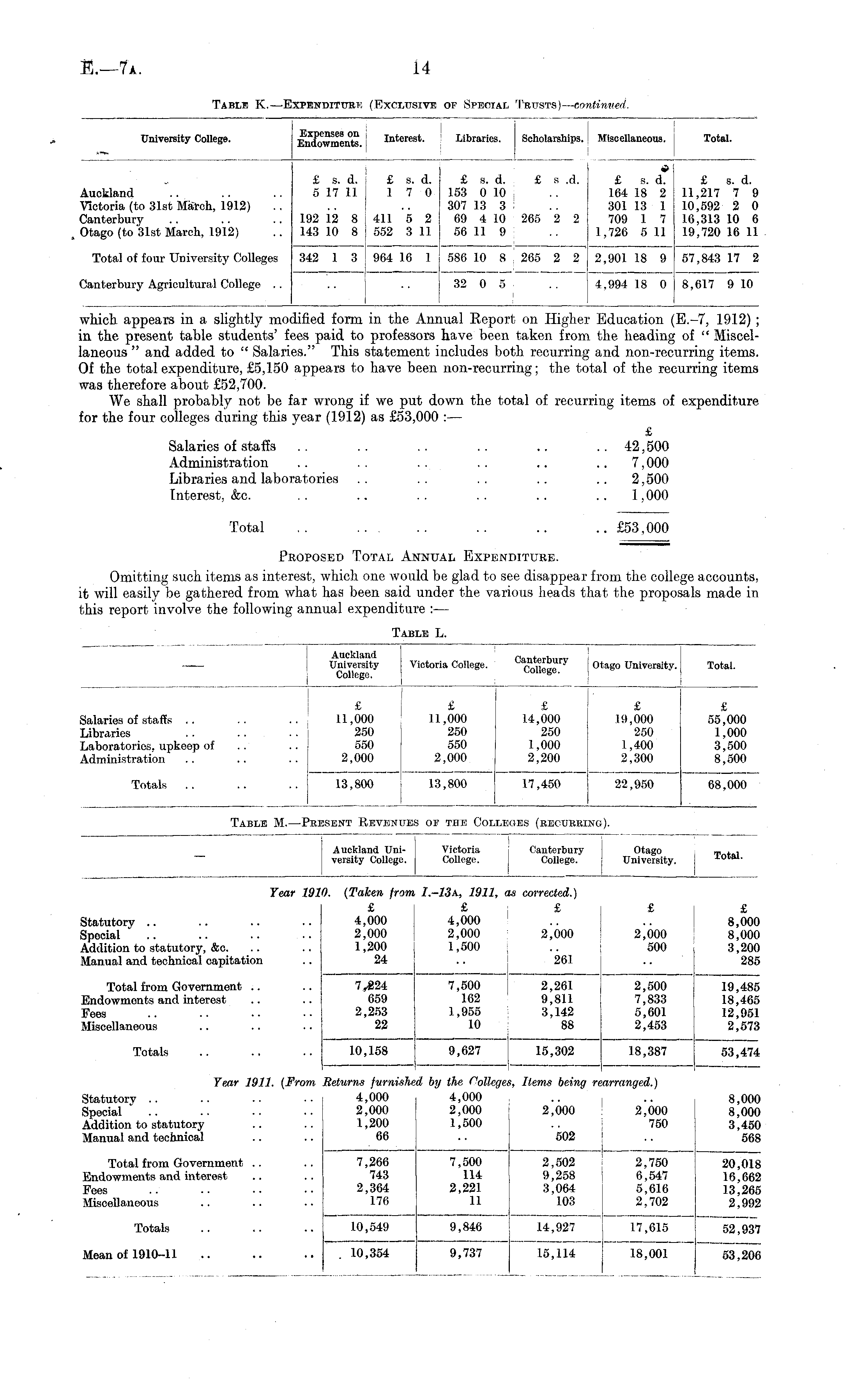 which appears in a slightly modified form in the Annual Eeport on Higher Education (E.-7, 1912) ; in the present table students' fees paid to professors have been taken from the heading of " Miscellaneous " and added to " Salaries." This statement includes both recurring and non-recurring items. Of the total expenditure, £5,150 appears to have been non-recurring; the total of the recurring items was therefore about £52,700. We shall probably not be far wrong if we put down the total of recurring items of expenditure for the four colleges during this year (1912) as £53,000 : — £ Salaries of staffs .. .. .. .. .. .. 42,500 Administration .. .. .. .. .. 7,000 Libraries and laboratories .. .. .. .. .. 2,500 Interest, &c. .. .. .. .. .. .. 1,000 Total .. .. .. .. £53,000 Proposed Total Annual Expenditure. Omitting such items as interest, which one would be glad to see disappear from the college accounts, it will easily be gathered from what has been said under the various heads that the proposals made in this report involve the following annual expenditure : —