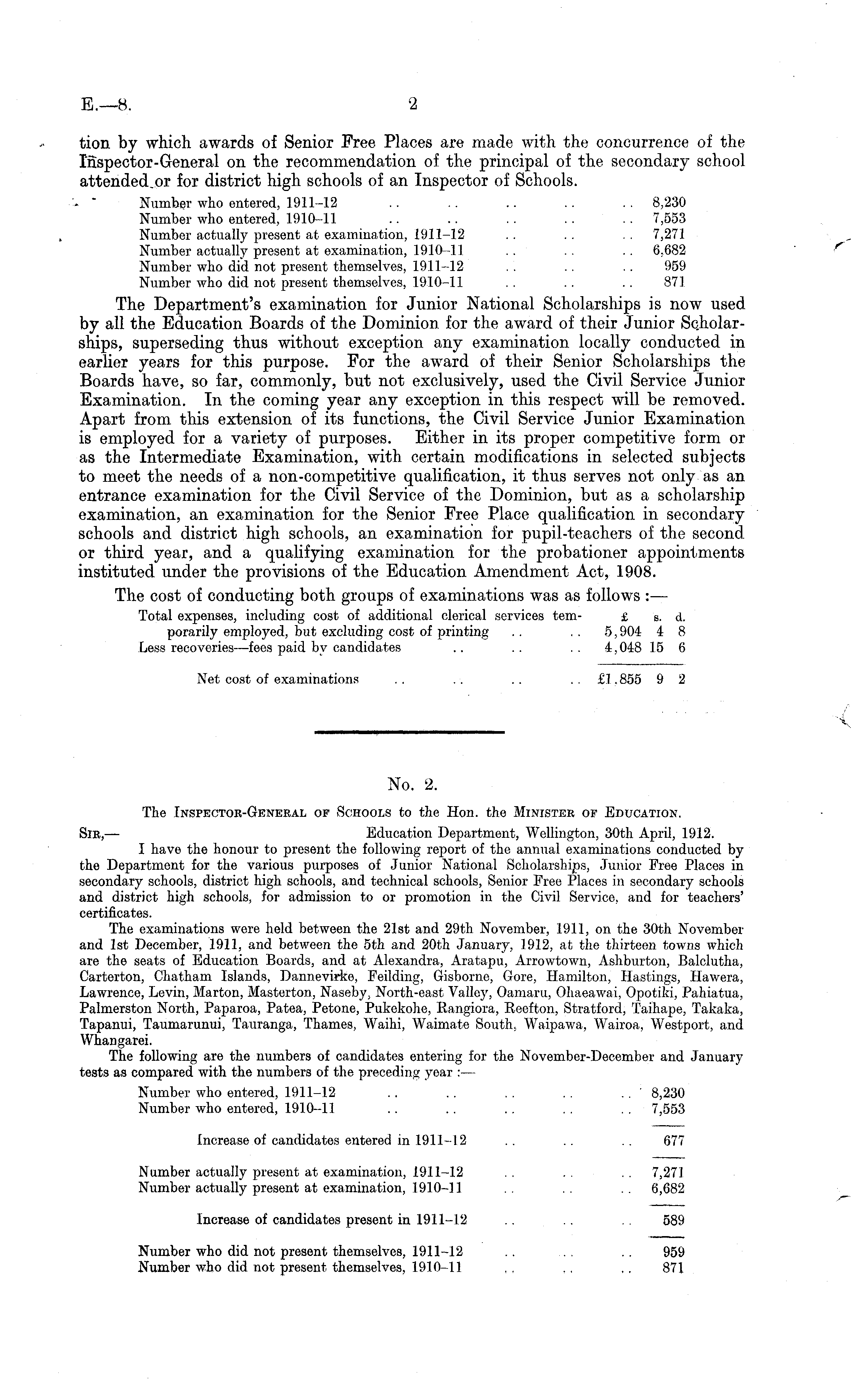 No. 2. The Inspectok-Genekal of Schools to the Hon. the Minister of Education. Sir, — Education Department, Wellington, 30th April, 1912. I have the honour to present the following report of the annual examinations conducted by the Department for the various purposes of Junior National Scholarships, Junior Free Places in secondary schools, district high schools, and technical schools, Senior Free Places in secondary schools and district high schools, for admission to or promotion in the Civil Service, and for teachers' certificates. The examinations were held between the 21st and 29th November, 1911, on the 30th November and Ist December, 1911, and between the sth and 20th January, 1912, at the thirteen towns which are the seats of Education Boards, and at Alexandra, Aratapu, Arrowtown, Ashburton, Balclutha, Carterton, Chatham Islands, Dannevirke, Feilding, Gisborne, Gore, Hamilton, Hastings, Hawera, Lawrence, Levin, Marton, Masterton, Naseby, North-east Valley, Oamaru, Ohaeawai, Opotiki, Pahiatua, Palmerston North, Paparoa, Patea, Petone, Pukekohe, Rangiora, Reefton, Stratford, Taihape, Takaka, Tapanui, Taumarunui, Tauranga, Thames, Waihi, Waimate South. Waipawa, Wairoa, Westport, and Whangarei. The following are the numbers of candidates entering for the November-December and January tests as compared with the numbers of the preceding year : — Number who entered, 1911-12 .. .. .. .. .. 8,230 Number who entered, 1910-11 .. .. .. .. .. 7,553 Increase of candidates entered in 1911-12 .. .. .. 677 Number actually present at examination, 1911-12 .. .. .. 7,271 Number actually present at examination, 1910- ] 1 . . . . . . 6,682 Increase of candidates present in 1911-12 .. .. .. 589 Number who did not present themselves, 1911-12 .. .. .. 959 Number who did not present themselves, 1910-11 ~ ~ ~ 871