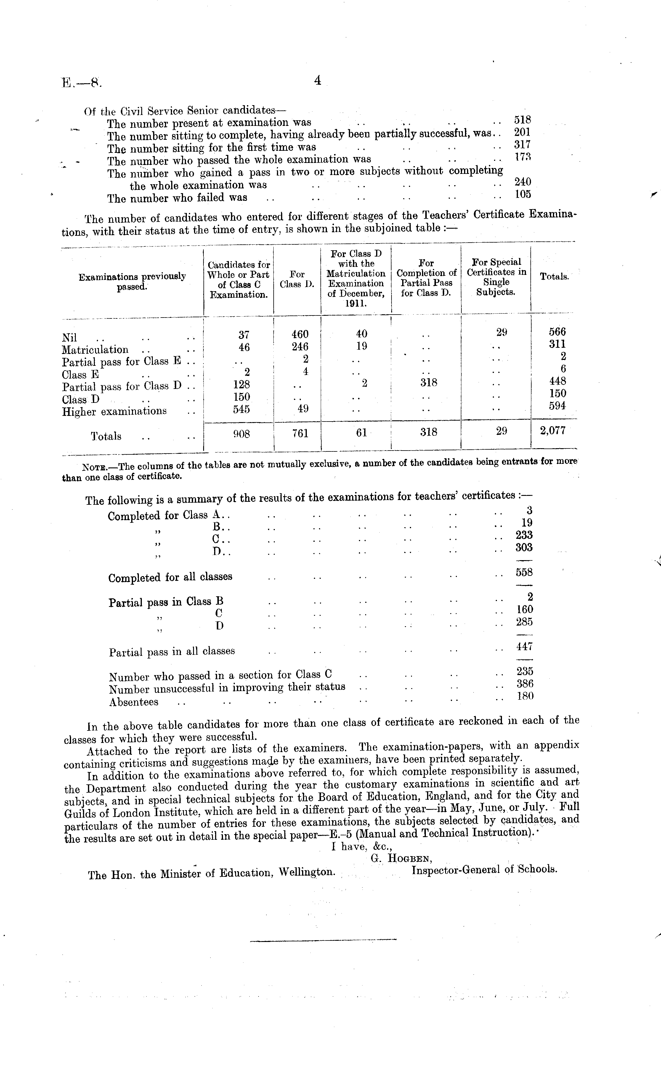 Examinations previously passed. Candidates for Whole or Part of Class C Examination. For Class D. For Class D with the l f or Matriculation Completion of Examination Partial Pass of "December, for Class t>. 1911. For Special Certificates in Single Subjects. Totals. I 29 566 311 2 6 448 150 594 Til latricuktioij 'artial pass for Class B . . llass E 'artial pass for Glass D .. )lass D ligher examinations 37 46 460 246 2 4 40 19 i 2 128 150 545 2 318 49 Totals 908 761 61 i 318 29 2,077 I