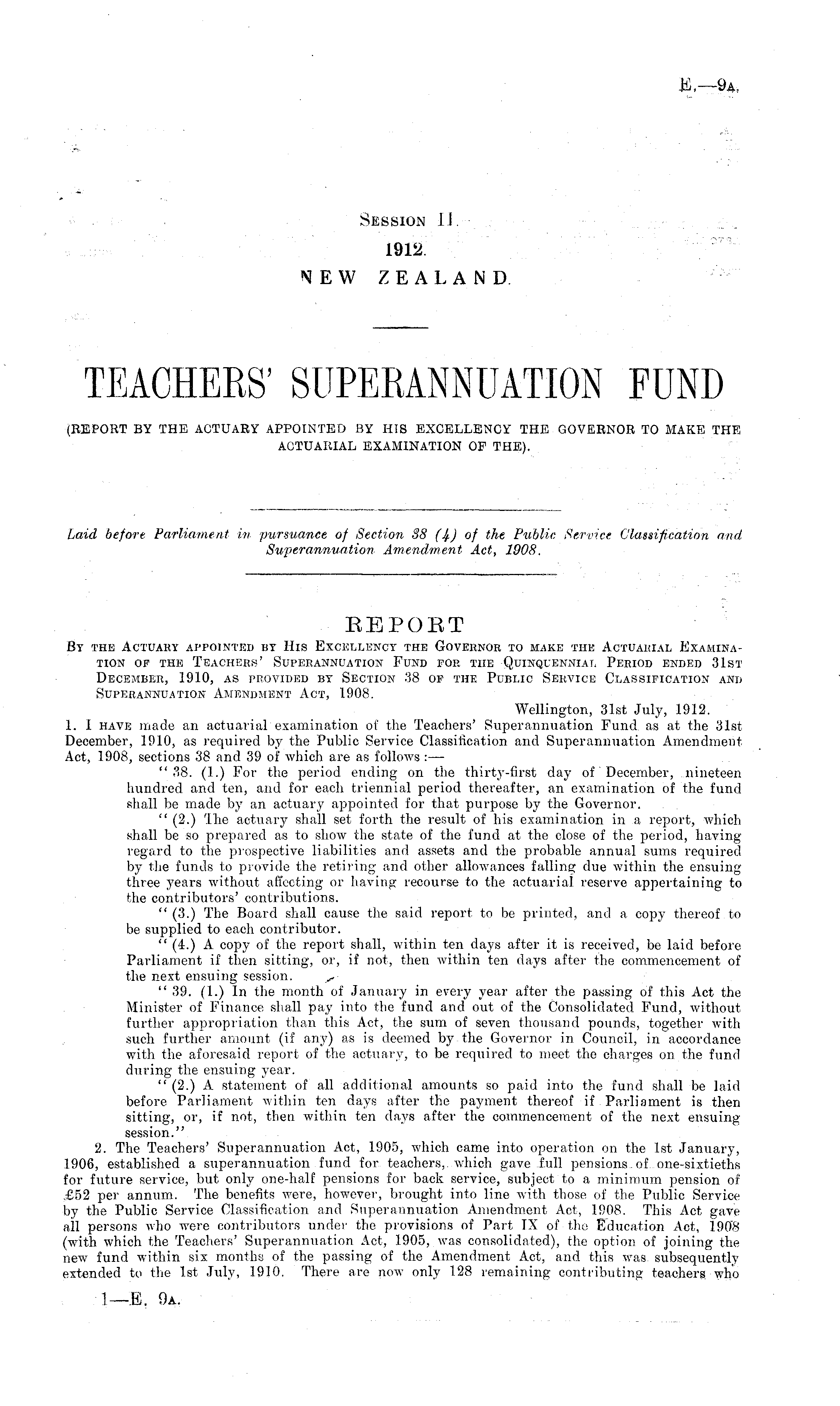 REPORT By the Actuary appointed by His Excellency the Goveenoe to make thk Actuarial Examination of the Teachers' Superannuation Fund pop. the Quinquennial Period ended 31st December, 1910, as provided by Section 38 of the Public Service Classification and Superannuation Amendment Act, 1908. Wellington, 31st July, 1912. 1. 1 have made an actuarial examination of the Teachers' Superannuation Fund as at the 31st December, 1910, as required by the Public Service Classification and Superannuation Amendment Act, 1908, sections 38 and 39 of which are as follows : — "38. (1.) For the period ending on the thirty-first day of December, nineteen hundred and ten, and for each triennial period thereafter, an examination of the fund shall be made by an actuary appointed for that purpose by the Governor. " (2.) Ihe actuary shall set forth the result of his examination in a report, which shall be so prepared as to show the state of the fund at the close of the period, having regard to the prospective liabilities and assets and the probable annual sums required by the funds to provide the retiring and other allowances falling due within the ensuing three years without affecting or having recourse to the actuarial reserve appertaining to the contributors' contributions. " (3.) The Board shall cause the said report to be printed, and a copy thereof to be supplied to each contributor. " (4.) A copy of the report shall, within ten days after it is received, be laid before Parliament if then sitting, or, if not, then within ten days after the commencement of the next ensuing session. " 39. (1.) In the month of January in every year after the passing of this Act the Minister of Finance shall pay into the fund and out of the Consolidated Fund, without further appropriation than this Act, the sum of seven thousand pounds, together with such further amount (if any) as is deemed by the Governor in Council, in accordance with the aforesaid report of the actuary, to be required to meet the charges on the fund during the ensuing year. " (2.) A statement of all additional amounts so paid into the fund shall be laid before Parliament within ten days after the payment thereof if Parliament is then sitting, or, if not, then within ten days after the commencement of the next ensuing session." 2. The Teachers' Superannuation Act, 1905, which came into operation on the Ist January, 1906, established a superannuation fund for teachers,, which gave full pensions. of. one-sixtieths for future service, but only one-half pensions for back service, subject to a minimum pension of .£52 per annum. The benefits were, however, brought into line with those of the Public Service by the Public Service Classification and Superannuation Amendment Act, 1908. This Act gave all persons who were contributors under the provisions of Part TX of tin- Education Act, 1908 (with which the Teachers' Superannuation Act, 1905, was consolidated), the option of joining the new fund within six months of the passing of the Amendment Act, and this was subsequently extended to the Ist July, 1910, There are now only 128 remaining contributing teachers, who