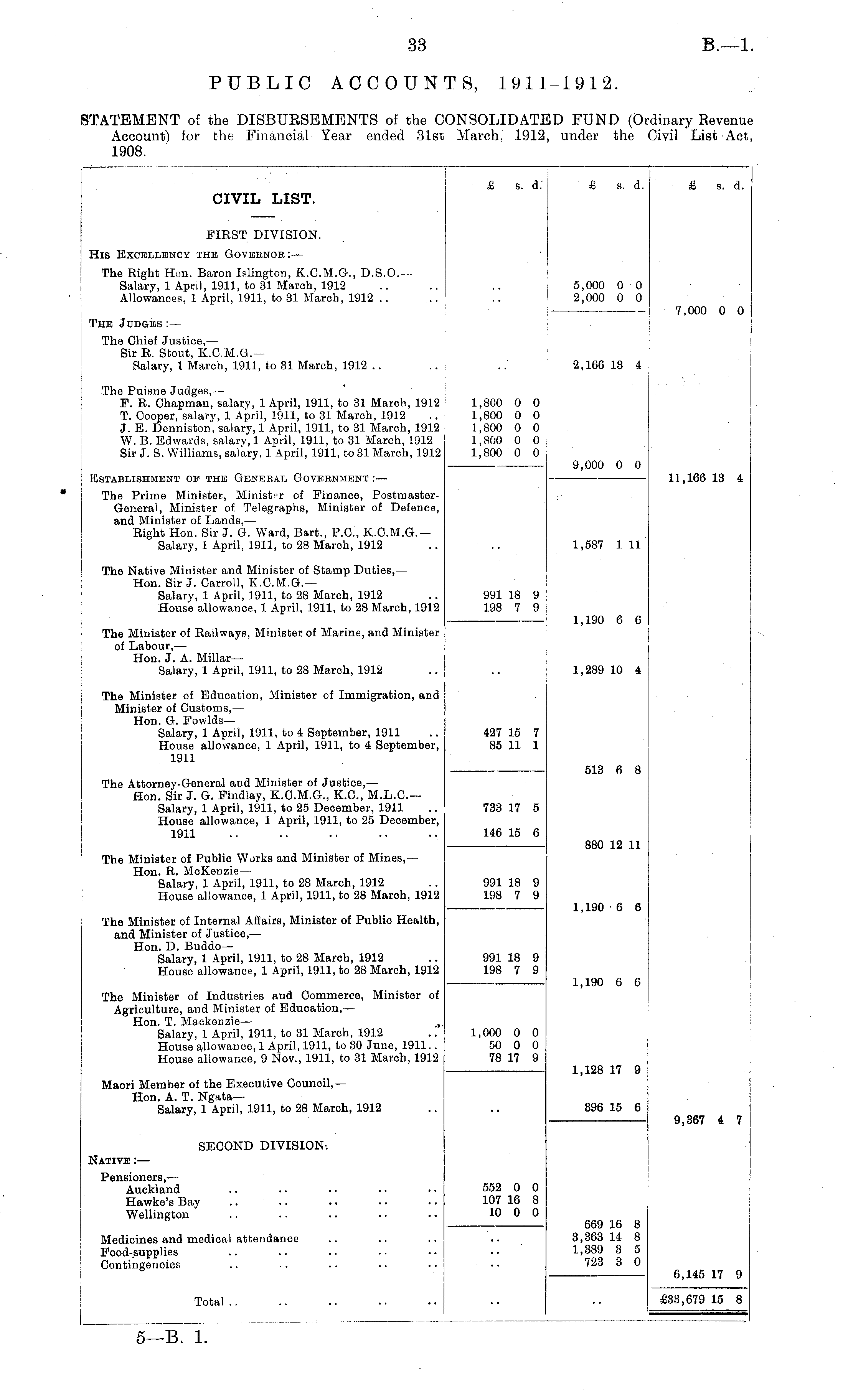 £ s. d. £ s. d. £ s. d. CIVIL LIST. FIRST DIVISION. His Excellency the Governor :— The Right Hon. Baron Islington, K.C.M.G., D.S.O.— Salary, 1 April, 1911, to 31 March, 1912 Allowances, 1 April, 1911, to 31 March, 1912 5,000 0 0 2,000 0 0 The Judges:— 7,000 0 0 The Chief Justice, — Sir R. Stout, K.C.M.G.Salary, I March, 1911, to 31 March, 1912 The Puisne Judges,— F. R. Chapman, salary, 1 April, 1911, to 31 March, 1912 T. Cooper, salary, 1 April, 1911, to 31 March, 1912 J. E. Denniston, salary, 1 April, 1911, to 31 March, 1912 W. B. Eawaras, salary, 1 April, 1911, to 31 March, 1912 Sir J. S. Williams, salary, 1 April, 1911, to 31 March, 1912 1,800 0 0 1,800 0 0 1,800 0 0 1,800 0 0 1,800 0 0 2,166 13 4 9,000 0 0 11,166 13 4 Establishment of the General Government :— The Prime Minister, Minist-T of Finance, PostmasterGeneral, Minister of Telegraphs, Minister of Defence, and Minister of Lands, — Right Hon. Sir J. G. Wara, Bart., P.O., K.C.M.G.— Salary, 1 April, 1911, to 28 March, 1912 The Native Minister and Minister of Stamp Duties, — Hon. Sir J. Carroll, K.C.M.G.— Salary, 1 April, 1911, to 28 March, 1912 House allowance, 1 April, 1911, to 28 March, 1912 1,587 1 11 991 18 9 198 7 9 1,190 6 6 The Minister of Railways, Minister of Marine, and Minister of Labour, — Hon. J. A. MillarSalary, 1 April, 1911, to 28 March, 1912 1,289 10 4 The Minister of Education, Minister of Immigration, and Minister of Customs, — Hon. G. Fowlds— Salary, 1 April, 1911, to 4 September, 1911 House allowance, 1 April, 1911, to 4 September, 1911 427 15 7 85 11 1 513 6 8 The Attorney-General and Minister of Justice, — Hon. Sir J. G. Findlay, K.C.M.G., K.C., M.L.C.— Salary, 1 April, 1911, to 25 December, 1911 House allowance, 1 April, 1911, to 25 December, 1911 733 17 5 880 12 11 146 15 6 The Minister of Publio Works and Minister of Mines, — Hon. R. McKenzie — Salary, 1 April, 1911, to 28 March, 1912 House allowance, 1 April, 1911, to 28 Maroh, 1912 1,190-6 6 991 18 9 198 7 9 The Minister of Internal Affairs, Minister of Public Health, and Minister of Justice, — Hon. D. Buddo— Salary, 1 April, 1911, to 28 March, 1912 House allowance, 1 April, 1911, to 28 March, 1912 1,190 6 6 991 18 9 198 7 9 The Minister of Inaustries and Commerce, Minister of Agrioulture, and Minister of Education, — Hon. T. Mackenzie — Salary, 1 April, 1911, to 31 March, 1912 House allowance, 1 April, 1911, to 30 June, 1911.. House allowance, 9 Nov., 1911, to 31 March, 1912 1,128 17 9 1,000 0 0 50 0 0 78 17 9 Maori Member of the Executive Council,— Hon. A. T. Ngata— Salary, 1 April, 1911, to 28 March, 1912 396 15 6 9,367 4 7 SECOND DIVISION-. Native :— Pensioners, — Auckland Hawke's Bay Wellington 552 0 0 107 16 8 10 0 0 Medicines and medical attendance Food-supplies Contingencies 669 16 8 3,363 14 8 1,389 3 5 723 3 0 6,145 17 9 Total £33,679 15 8