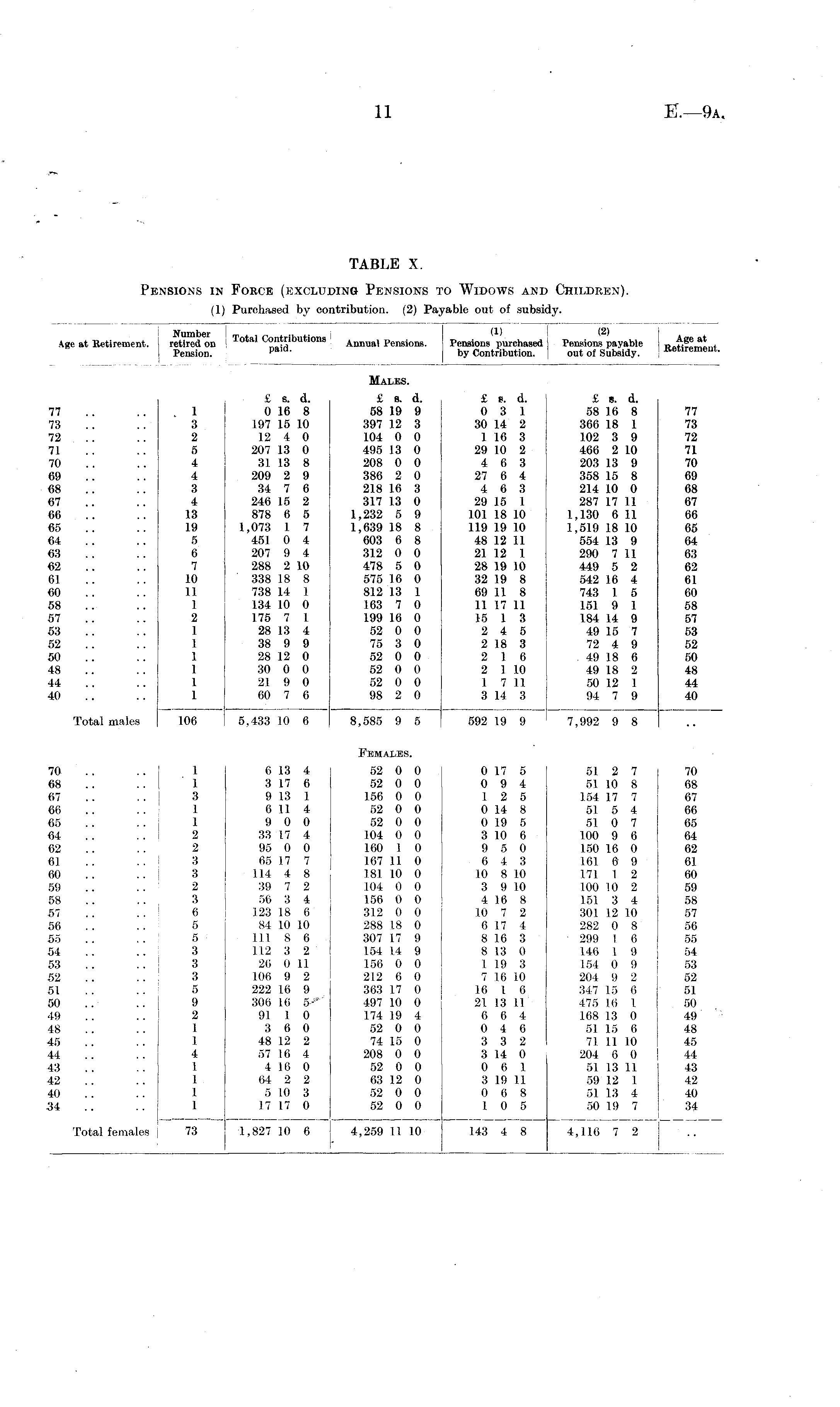 TABLE X. Pensions In Force (Excluding Pensions To Widows And Children). (1) Purchased by contribution. (2) Payable out of subsidy.