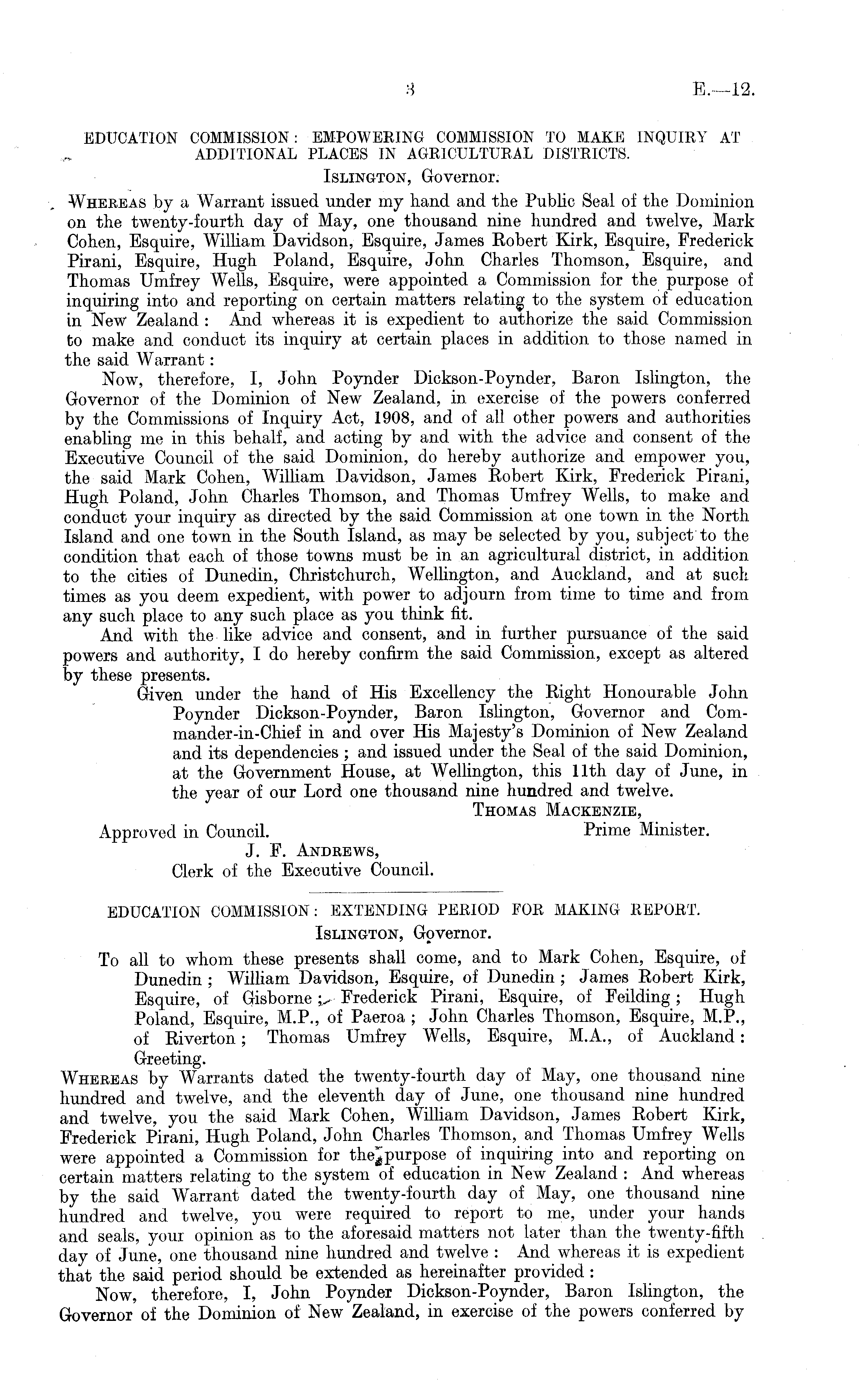 EDUCATION COMMISSION: EMPOWERING COMMISSION TO MAKE INQUIRY AT ADDITIONAL PLACES IN AGRICULTURAL DISTRICTS. Islington, Governor. Whereas by a Warrant issued under my hand and the Public Seal of the Dominion on the twenty-fourth day of May, one thousand nine hundred and twelve, Mark Cohen, Esquire, William Davidson, Esquire, James Robert Kirk, Esquire, Frederick Pirani, Esquire, Hugh Poland, Esquire, John Charles Thomson, Esquire, and Thomas Umfrey Wells, Esquire, were appointed a Commission for the purpose of inquiring into and reporting on certain matters relating to the system of education in New Zealand : And whereas it is expedient to authorize the said Commission to make and conduct its inquiry at certain places in addition to those named in the said Warrant : Now, therefore, I, John Poynder Dickson-Poynder, Baron Islington, the Governor of the Dominion of New Zealand, in exercise of the powers conferred by the Commissions of Inquiry Act, 1908, and of all other powers and authorities enabling me in this behalf, and acting by and with the advice and consent of the Executive Council of the said Dominion, do hereby authorize and empower you, the said Mark Cohen, William Davidson, James Robert Kirk, Frederick Pirani, Hugh Poland, John Charles Thomson, and Thomas Umfrey Wells, to make and conduct your inquiry as directed by the said Commission at one town in the North Island and one town in the South Island, as may be selected by you, subject to the condition that each of those towns must be in an agricultural district, in addition to the cities of Dunedin, Christchurch, Wellington, and Auckland, and at such times as you deem expedient, with power to adjourn from time to time and from any such place to any such place as you think fit. And with the like advice and consent, and in further pursuance of the said powers and authority, I do hereby confirm the said Commission, except as altered by these presents. Given under the hand of His Excellency the Right Honourable John Poynder Dickson-Poynder, Baron Islington, Governor and Com-mander-in-Chief in and over His Majesty's Dominion of New Zealand and its dependencies ; and issued under the Seal of the said Dominion, at the Government House, at Wellington, this 11th day of June, in the year of our Lord one thousand nine hundred and twelve. Thomas Mackenzie, Approved in Council. Prime Minister. J. F. Andrews, Clerk of the Executive Council.