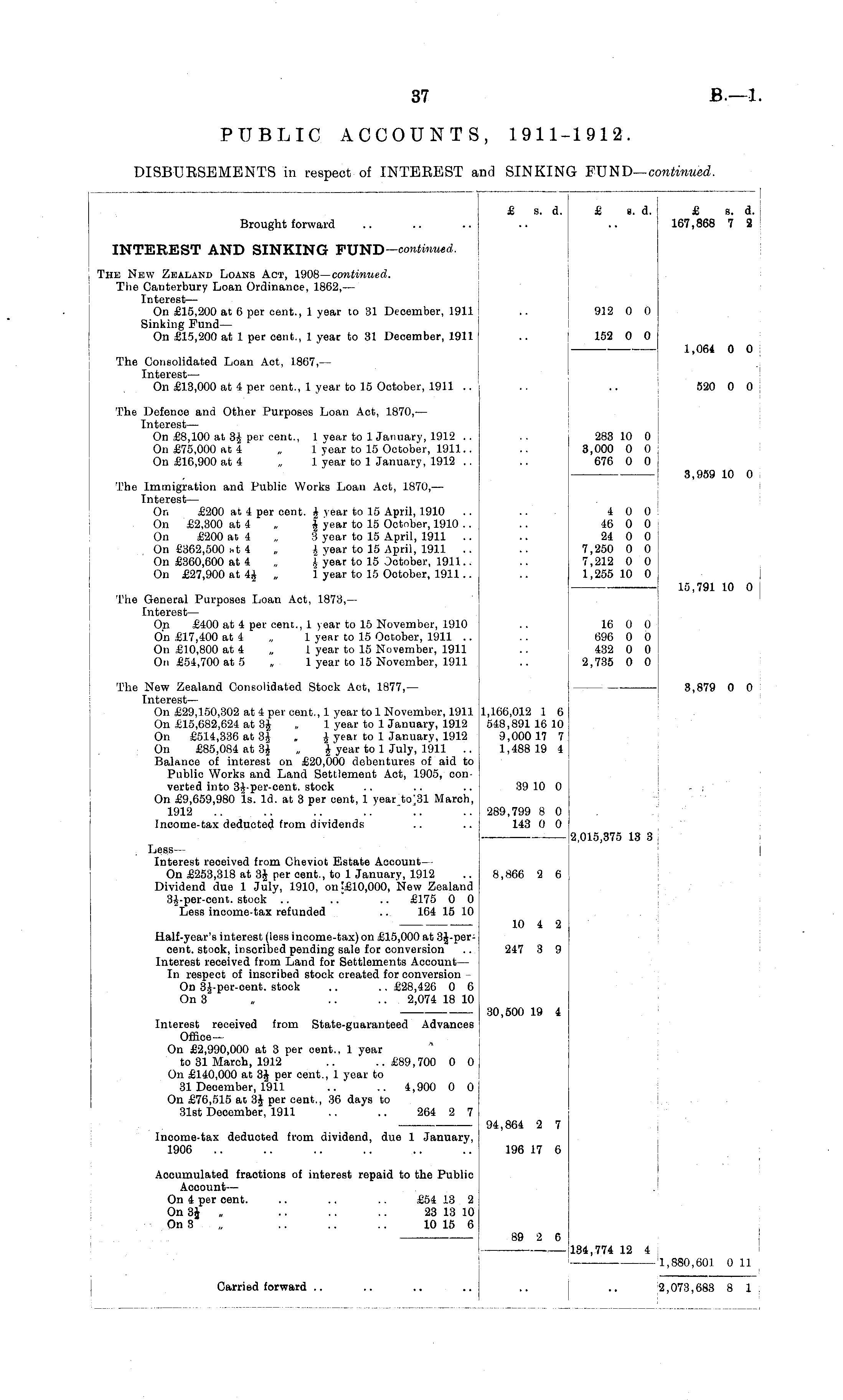 £ s. d. £ s. d. £ s. d. £ s. d. 167,868 7 2 Brought forward INTEREST AND SINKING FUND -continued. 'he New Zealand Loans Act, 1908— continued. The Canterbury Loan Ordinanoe, 1862, — Interest— On £15,200 at 6 per cent., 1 year to 31 December, 1911 Sinking Fund— On £15,200 at 1 per cent., 1 year to 31 December, 1911 912 0 0 912 0 0 152 0 0 1,064 0 0 152 0 0 The Consolidated Loan Act, 1867, — Interest — On £13,000 at 4 per cent., 1 year to 15 Ootober, 1911 .. 520 0 0 The Defence and Other Purposes Loan Act, 1870, — Interest— On £8,100 at 3J per cent., 1 vear to 1 January, 1912 .. On £75,000 at 4 „ 1 year to 15 October, 1911.. On £16,900 at 4 „ 1 year to 1 January, 1912 .. 283 10 0 3,000 0 0 676 0 0 283 10 0 3,000 0 0 676 0 0 4 0 0 46 0 0 3,959 10 0 The Immigration and Public Works Loan Act, 1870, — Interest — Or, £200 at 4 per cent. 4 year to 15 April, 1910 On £2,300 at 4 | year to 15 October, 1910 .. On £200 at 4 3 year to 15 April, 1911 .. On £362,500 »t 4 J year to 15 April, 1911 .. On £360,600 at 4 4 year to 15 October, 1911.. On £27,900 at 4J „ I year to 15 Ootober, 1911.. 4 0 0 46 0 0 24 0 0 7,250 0 0 7,212 0 0 1,255 10 0 24 0 0 7,250 0 0 7,212 0 0 1,255 10 0 16 0 0 696 0 0 15,791 10 0 The General Purposes Loan Act, 1873,— Interest— On £400 at 4 per cent., 1 year to 15 November, 1910 On £17,400 at 4 „ I year to 15 October, 1911 .. On £10,800 at 4 „ 1 year to 15 November, 1911 On £54,700 at 5 , 1 year to 15 November, 1911 16 0 0 696 0 0 432 0 0 2,735 0 0 The New Zealand Consolidated Stock Act, 1877, — Interest — On £29,150,302 at 4 per cent., 1 year to 1 November, 1911 On £15,682,624 at 3*; „ 1 year to 1 January, 1912 On £514,336 at 3| . 4 year to 1 January, 1912 On £85,084 at 3| „ J year to 1 July, 1911 .. Balance of interest on £20,000 debentures of aid to Public Works and Land Settlement Act, 1905, converted into 34-per-cent. stook On £9,659,980 Is. Id. at 3 per cent, 1 year to'31 March, 1912 ....... .. .. .. Income-tax deducted from dividends 1,166,012 1 6 548,891 16 10 9,000 17 7 1,488 19 4 oyo u u 432 0 0 2,735 0 0 3,879 0 0 39 10 0 289,799 8 0 143 0 0 2,015,875 13 3 Less — Interest reoeived from Cheviot Estate Account — On £253,318 at 3J per cent., to 1 January, 1912 Dividend due 1 July, 1910, on;£10,000, New Zealand 34-per-cent. stock .. .." .. £175 0 0 Less income-tax refunded .. 164 15 10 8,866 2 6 10 4 2 Half-year's interest (less income-tax) on £15,000 at 3*t-per; cent, stook, inscribed pending sale for conversion Interest reoeived from Land for Settlements Account — In respect of inscribed stock created for conversion - On 34-per-oent. stock .. .. £28,426 0 6 On 3 „ .. .. 2,074 18 10 247 3 9 30,500 19 4 Interest received from State-guaranteed Advances Office— On £2,990,000 at 3 per oent., 1 year to 31 March, 1912 .. ..£89,700 0 0 On £140,000 at 34 per cent., 1 year to 31 December, 1911 .. .. 4,900 0 0 On £76,515 at 34 per cent., 36 days to 31st December, 1911 .. .. 264 2 7 .. . Income-tax deducted from dividend, due 1 January, 1906 94,864 2 7 Accumulated fraotions of interest repaid to the Public Acoount— On 4 per cent. .. .. .. £54 13 2 On 3J „ .. .. .. 23 13 10 On 3 „ .. .. .. 10 15 6 196 17 6 89 2 6 184,774 12 4 Carried forward .. .. .. 1,880,601 Oil 2,073,683 8 1