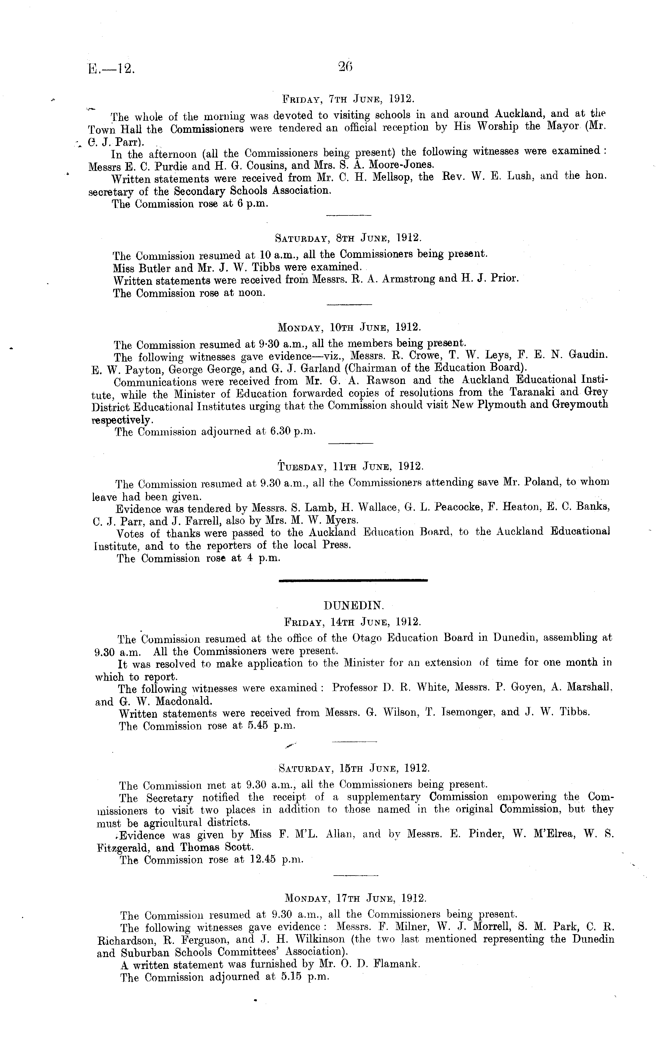 Friday, 7th June, 1912. The whole of the morning was devoted to visiting schools in and around Auckland, and at the Town Hall the Commissioners were tendered an official reception by His Worship the Mayor (Mr. C. J. Parr). In the afternoon (all the Commissioners being present) the following witnesses were examined : Messrs E. C. Purdie and H. G. Cousins, and Mrs. S. A. Moore-Jones. Written statements were received from Mr. C. H. Mellsop, the Rev. W. E. Lush, and the hon. secretary of the Secondary Schools Association. The Commission rose at 6 p.m.