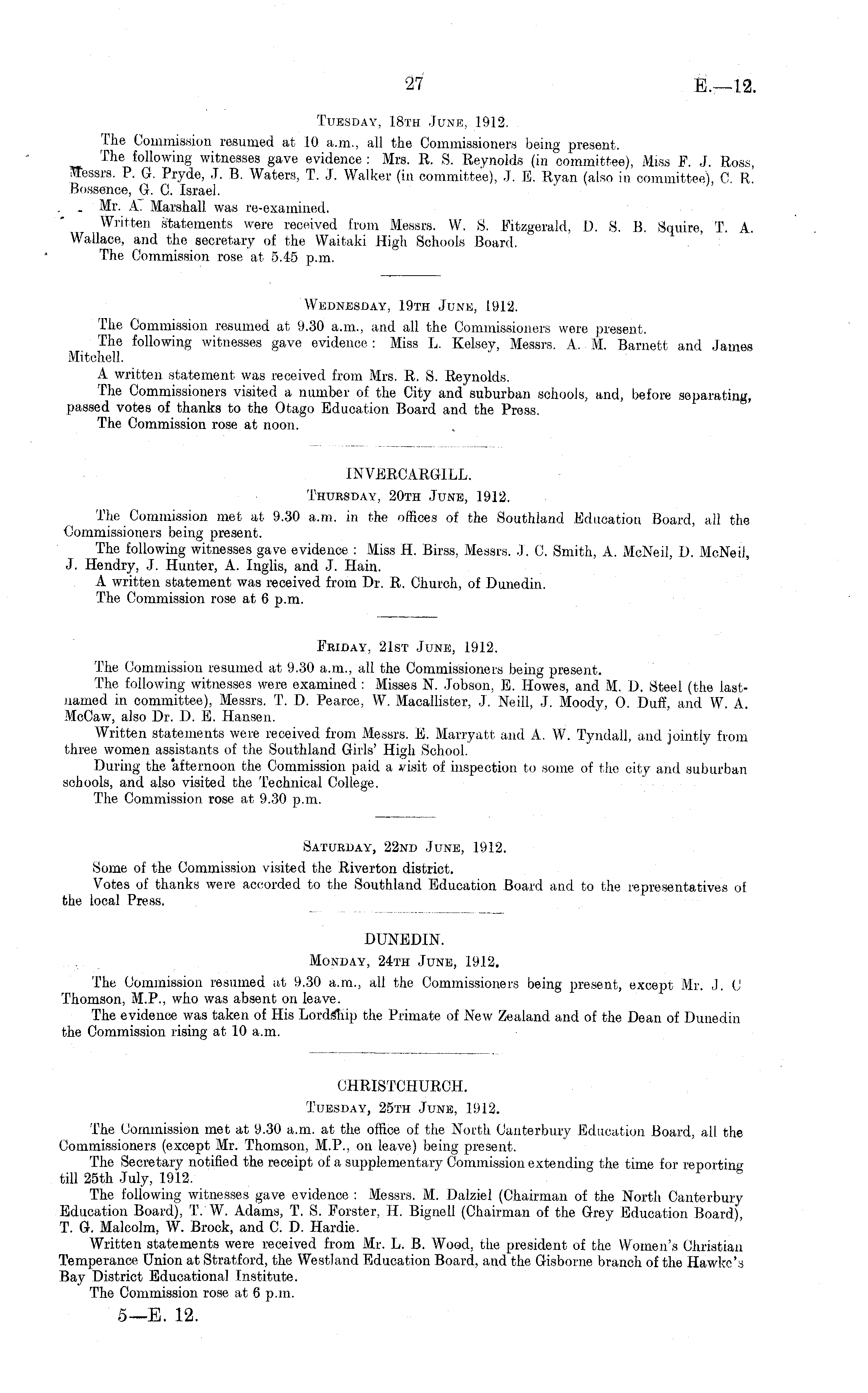 Wednesday, 19th June, 1912. The Commission resumed at 9.30 a.m., and all the Commissioners were present. The following witnesses gave evidence : Miss L. Kelsey, Messrs. A. M. Barnett and James Mitchell. A written statement was received from Mrs. R. S. Reynolds. The Commissioners visited a number of the City and suburban schools, and, before separating, passed votes of thanks to the Otago Education Board and the Press. The Commission rose at noon.