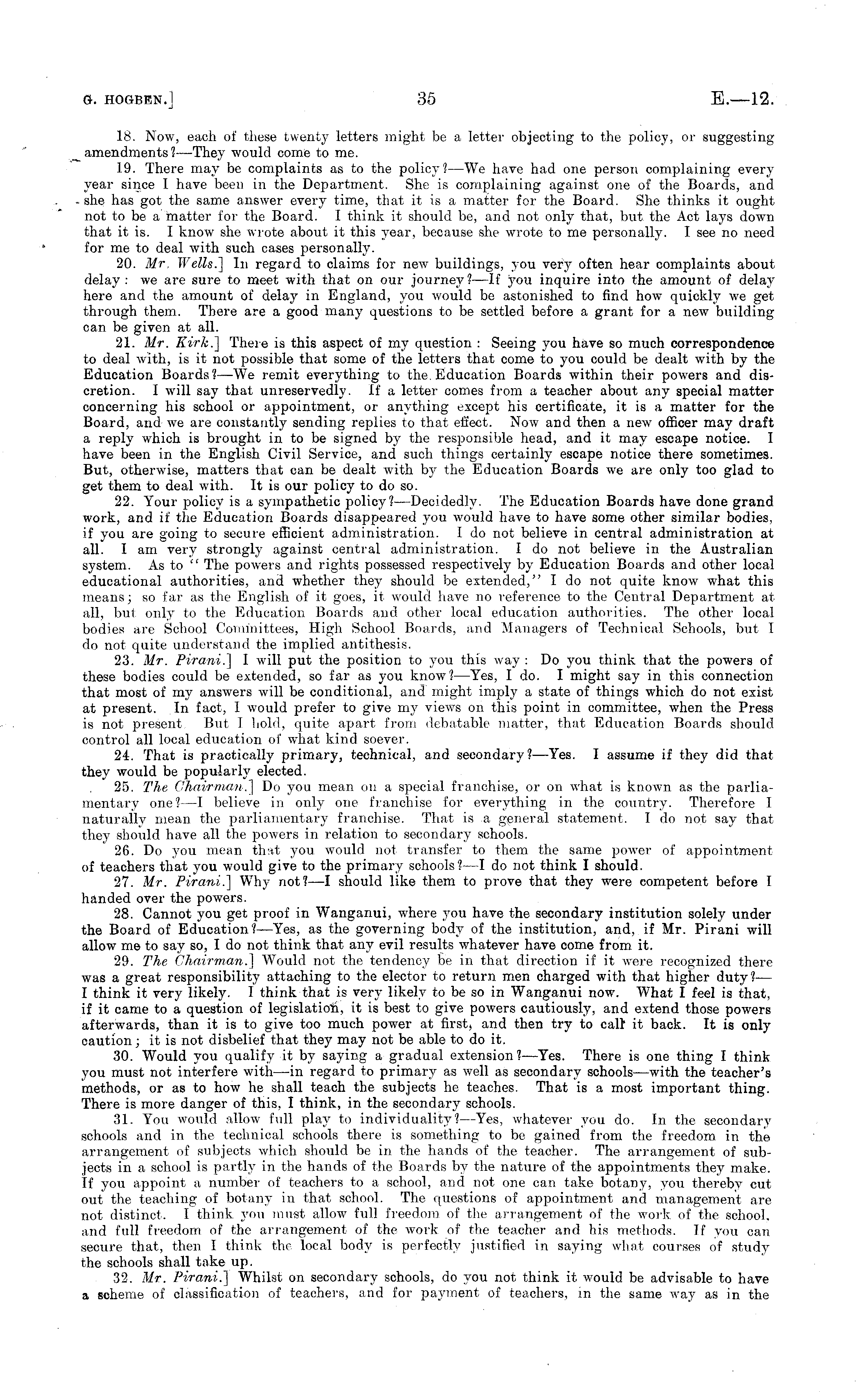 18. Now, each of these twenty letters might be a letter objecting to the policy, or suggesting amendments? —They would come to me. 19. There may be complaints as to the policy?—We have had one person complaining every year since I have been in the Department. She is complaining against one of the Boards, and she has got the same answer every time, that it is a matter for the Board. She thinks it ought not to be a matter for the Board. I think it should be, and not only that, but the Act lays down that it is. I know she wrote about it this year, because she wrote to me personally. I see no need for me to deal with such cases personally. 20. Mr, Wells.] In regard to claims for new buildings, you very often hear complaints about delay: we are sure to meet with that on our journey?—lf you inquire into the amount of delay here and the amount of delay in England, you would be astonished to find how quickly we get through them. There are a good many questions to be settled before a grant for a new building can be given at all. 21. Mr. Kirk.] There is this aspect of my question : Seeing you have so much correspondence to deal with, is it not possible that some of the letters that come to you could be dealt with by the Education Boards?—We remit everything to the. Education Boards within their powers and discretion. I will say that unreservedly. If a letter comes from a teacher about any special matter concerning his school or appointment, or anything except his certificate, it is a matter for the Board, and we are constantly sending replies to that effect. Now and then a new officer may draft a reply which is brought in to be signed by the responsible head, and it may escape notice. I have been in the English Civil Service, and such things certainly escape notice there sometimes. But, otherwise, matters that can be dealt with by the Education Boards we are only too glad to get them to deal with. It is our policy to do so. 22. Your policy is a sympathetic policy? —Decidedly. The Education Boards have done grand work, and if the Education Boards disappeared you would have to have some other similar bodies, if you are going to secure efficient administration. Ido not believe in central administration at all. I am very strongly against central administration. I do not believe in the Australian system. As to " The powers and rights possessed respectively by Education Boards and other local educational authorities, and whether they should be extended," I do not quite know what this means; so far as the English of it goes, it would have no reference to the Central Department at all, but only to the Education Boards and other local education authorities. The other local bodies are School Committees, High School Boards, and Managers of Technical Schools, but I do not quite understand the implied antithesis. 23. Mr. Pirani.] I will put the position to you this way : Do you think that the powers of these bodies could be extended, so far as you know? —Yes, I do. I might say in this connection that most of my answers will be conditional, and might imply a state of things which do not exist at present. In fact, I would prefer to give my views on this point in committee, when the Press is not present But 1 hold, quite apart from debatable matter, that Education Boards should control all local education of what kind soever. 24. That is practically primary, technical, and secondary?— Yes. I assume if they did that they would be popularly elected. 25. The Chairman.] Do you mean on a special franchise, or on what is known as the parliamentary one?—l believe in only one franchise for everything in the country. Therefore I naturally mean the parliamentary franchise. That is a general statement. I do not say that they should have all the powers in relation to secondary schools. 26. Do you mean that you would not transfer to them the same power of appointment of teachers that you would give to the primary schools ? —I do not think I should. 27. Mr. Pirani.] Why not? —I should like them to prove that they were competent before I handed over the powers. 28. Cannot you get proof in Wanganui, where you have the secondary institution solely under the Board of Education? —Yes, as the governing body of the institution, and, if Mr. Pirani will allow me to say so, I do not think that any evil results whatever have come from it. 29. The Chairman.] Would not the tendency be in that direction if it were recognized there was a great responsibility attaching to the elector to return men charged with that higher duty?— I think it very likely. I think that is very likely to be so in Wanganui now. What I feel is that, if it came to a question of legislation, it is best to give powers cautiously, and extend those powers afterwards, than it is to give too much power at first, and then try to call it back. It is only caution; it is not disbelief that they may not be able to do it. 30. Would you qualify it by saying a gradual extension?— Yes. There is one thing I think you must not interfere with—in regard to primary as well as secondary schools —with the teacher's methods, or as to how he shall teach the subjects he teaches. That is a most important thing. There is more danger of this, I think, in the secondary schools. 31. You would allow full play to individuality?— Yes, whatever you do. In the secondary schools and in the technical schools there is something to be gained from the freedom in the arrangement of subjects which should be in the hands of the teacher. The arrangement of subjects in a school is partly in the hands of the Boards by the nature of the appointments they make. If you appoint a number of teachers to a school, and not one can take botany, you thereby cut out the teaching of botany in that school. The questions of appointment and management are not distinct. I think you must allow full freedom of the arrangement of the work of the school, and full freedom of the arrangement of the wor