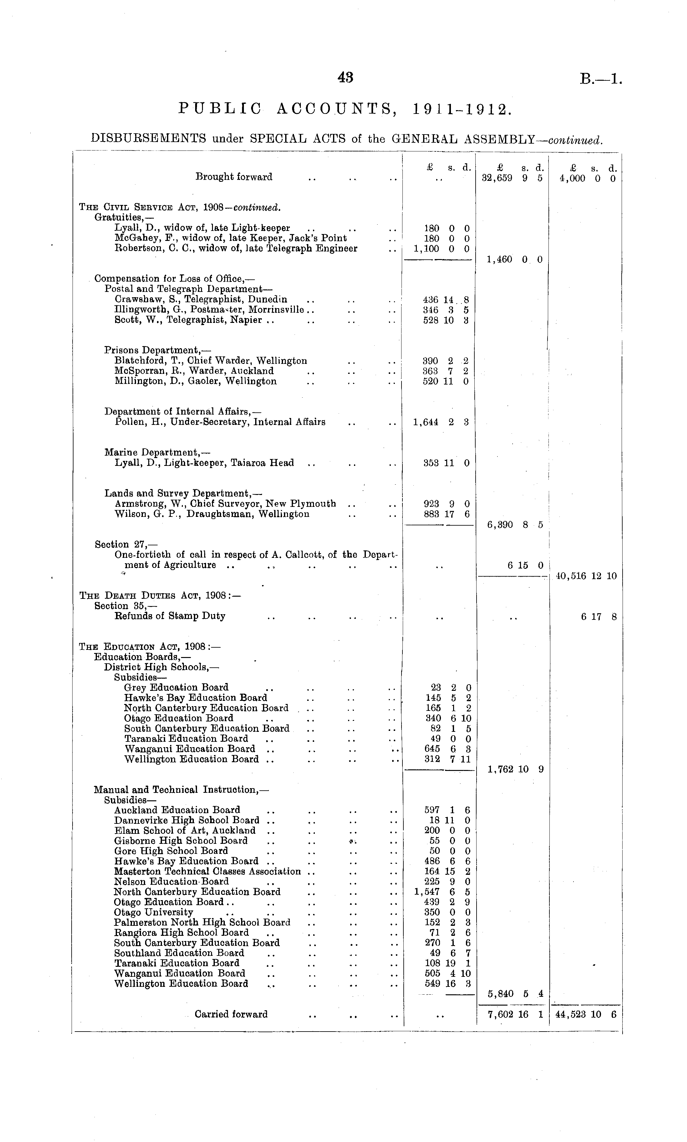£ s. d. £ s. a. 32,659 9 5 £ s. d. 4,000 0 0 Brought forward The Civil Service Act, 1908— continued. Gratuities, — Lyall, D., widow of, late Light-keeper .. .. McGahey, F., widow of, late Keeper, Jack's Point Robertson, C. C, widow of, late Telegraph Engineer 180 0 0 180 0 0 1,100 0 0 1,460 0 0 Compensation for Loss of Office, — Postal and Telegraph Department— Crawshaw, S., Telegraphist, Dunedin Illingworth, G., Postmaster, Morrinsville Scott, W., Telegraphist, Napier .. 436 14 8 346 3 5 528 10 3 Prisons Department,— Blatchford, T., Chief Warder, Wellington McSporran, R., Warder, Auckland .. .. Millington, D., Gaoler, Wellington 390 2 2 363 7 2 520 11 0 Department of Internal Affairs, — Pollen, H., Under-Secretary, Internal Affairs 1,644 2 3 Marine Department,— Lyall, D., Light-keeper, Taiaroa Head 353 11 0 Lands and Survey Department,— Armstrong, W., Chief Surveyor, New Plymouth Wilson, G. P., Draughtsman, Wellington 923 9 0 883 17 6 Seotion 27,— One-fortieth of call in respect of A. Callcott, of the Department of Agriculture .. 6,390 8 5 6 15 0 10,516 12 10 The Death Duties Act, 1908: — Section 35, — Refunds of Stamp Duty .. .. .. 6 17 8 The Education Act, 1908:— Eduoation Boards, — District High Schools, — Subsidies — Grey Education Board Hawke's Bay Education Board North Canterbury Education Board Otago Eaucation Board South Canterbury Eduoation Board Taranaki Education Board Wanganui Education Board Wellington Education Board 23 2 0 145 5 2 165 1 2 340 6 10 82 1 5 49 0 0 645 6 3 312 7 11 1,762 10 9 Manual and Technical Instruction, — Subsidies — Auckland Education Board Dannevirke High Sohool Board Elam School of Art, Auckland Gisborne High School Board Gore High School Board Hawke's Bay Education Board Masterton Technical Classes Association Nelson Education-Board North Canterbury Education Board Otago Education Board Otago University Palmerston North High School Board Rangiora High School Board South Canterbury Education Board Southland Education Board Taranaki Education Board Wanganui Education Board Wellington Education Board ... .. .. 597 1 6 18 11 0 200 0 0 55 0 0 50 0 0 486 6 6 164 15 2 225 9 0 1,547 6 5 439 2 9 350 0 0 152 2 3 71 2 6 270 1 6 49 6 7 108 19 1 505 4 10 549 16 8 5,840 5 4 Carried forward 7,602 16 1 44,523 10 6