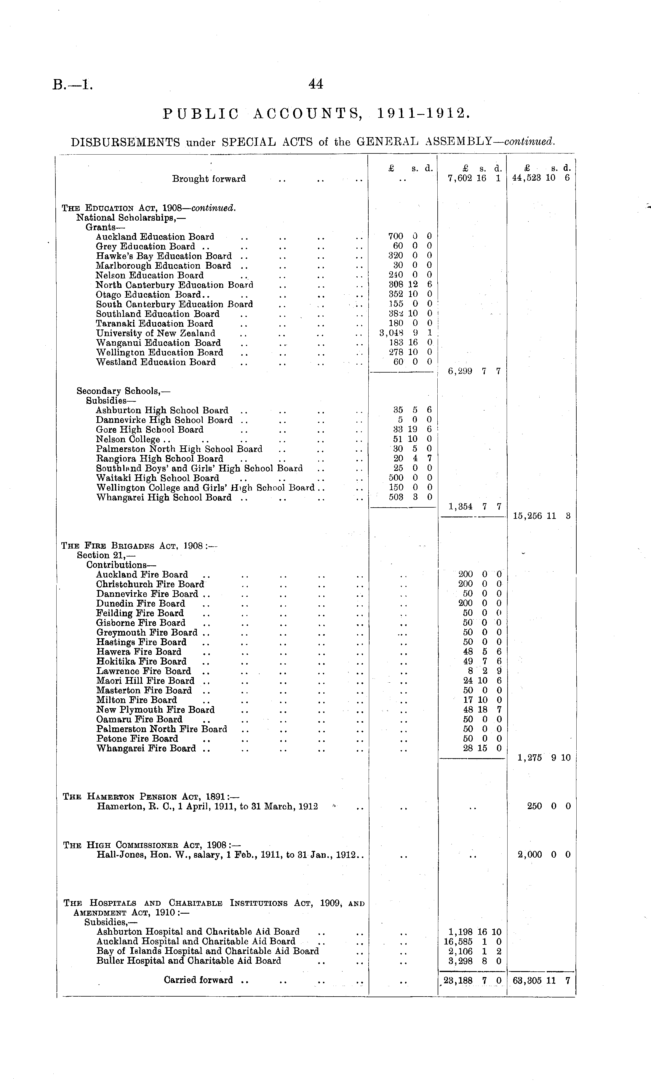 Brought forward £ s. d. £ s. d. 7,602 16 1 £ s. d. 44,523 10 6 The Education Act, 1908— continued. National Scholarships,— Grants— Auckland Eduoation Board Grey Education Board Hawke's Bay Eduoation Board Marlborough Education Board Nelson Education Board North Canterbury Education Board Otago Education Board.. South Canterbury Education Board .. .. Southland Education Board Taranaki Eduoation Board University of New Zealand Wanganui Education Board Wellington Education Board Westland Eduoation Board .. .. .. 700 0 0 60 0 0 320 0 0 30 0 0 240 0 0 308 12 6 352 10 0 155 0 0 382 10 0 180 0 0 3,048 9 1 183 16 0 278 10 0 60 0 0 6,299 7 7 Secondary Schools, — Subsidies— Ashburton High School Board Dannevirke High Sohool Board Gore High School Board Nelson College Palmerston North High Sohool Board Rangiora High School Board Southland Boys' and Girls' High School Board Waitaki High School Board Wellington College and Girls' High School Board Whangarei High School Board 35 5 6 5 0 0 33 19 6 51 10 0 80 5 0 20 4 7 25 0 0 500 0 0 150 0 0 503 3 0 1,354 7 7 The Fire Brigades Act, 1908 :— Section 21, — Contributions— Auckland Fire Board Christchuroh Fire Board Dannevirke Fire Board Dunedin Fire Board Feilding Fire Board Gisborne Fire Board Greymouth Fire Board Hastings Fire Board Hawera Fire Board Hokitika Fire Board Lawrence Fire Board .. .. Maori Hill Fire Board Masterton Fire Board Milton Fire Board .. .. .. .. New Plymouth Fire Board .. .. .. Oamaru Fire Board Palmerston North Fire Board Petone Fire Board Whangarei Fire Board 15,256 11 3 - * 200 0 0 200 0 0 50 0 0 200 0 0 50 0 0 50 0 0 50 0 0 50 0 0 48 5 6 49 7 6 8 2 9 24 10 6 50 0 0 17 10 0 48 18 7 50 0 0 50 0 0 50 0 0 28 15 0 1,275 9 10 The Hamerton Pension Act, 1891: — Hamerton, R. C, 1 April, 1911, to 31 March, 1912 250 0 0 The High Commissioner Act, 1908: — Hall-Jones, Hon. W., salary, 1 Feb., 1911, to 31 Jan., 1912.. 2,000 0 0 The Hospitals and Charitable Institutions Act, 1909, and Amendment Act, 1910 :— Subsidies, — Ashburton Hospital and Charitable Aid Board Auckland Hospital and Charitable Aid Board Bay of Islands Hospital and Charitable Aid Board Buller Hospital and Charitable Aid Board 1,198 16 10 16,585 1 0 2,106 1 2 3,298 8 0 Carried forward 23,188 7 0 63,305 11 7