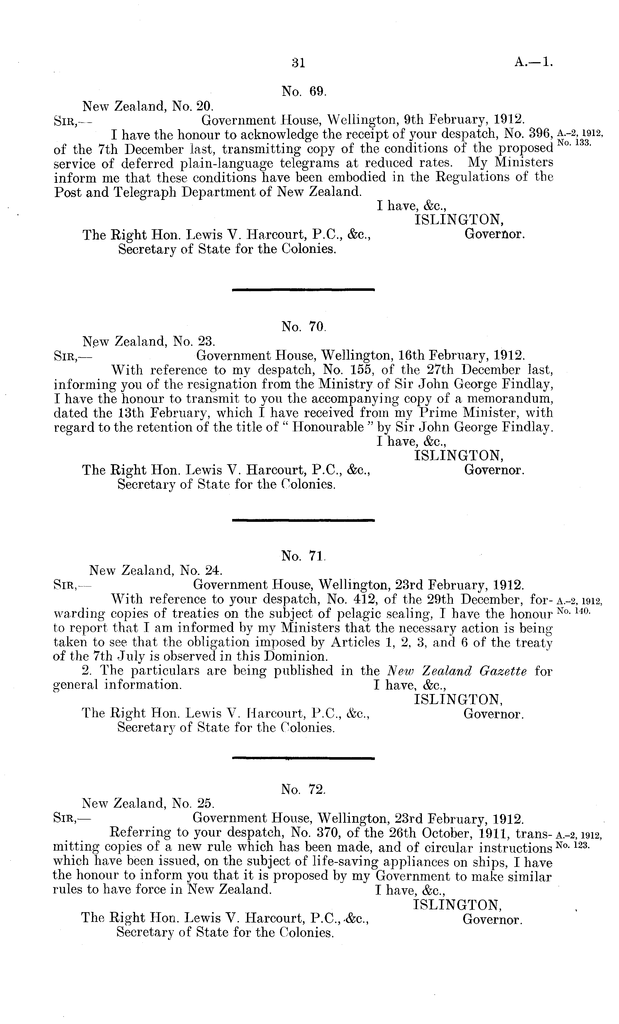New Zealand, No. 20. Sir, — Government House, Wellington, 9th February, 1912. I have the honour to acknowledge the receipt of your despatch, No. 396, > of the 7th December last, transmitting copy of the conditions of the proposed service of deferred plain-language telegrams at reduced rates. My Ministers inform me that these conditions have been embodied in the Regulations of the Post and Telegraph Department of New Zealand. I have, &c, ISLINGTON, The Right Hon. Lewis V. Harcourt, P.C., &c, Governor. Secretary of State for the Colonies.