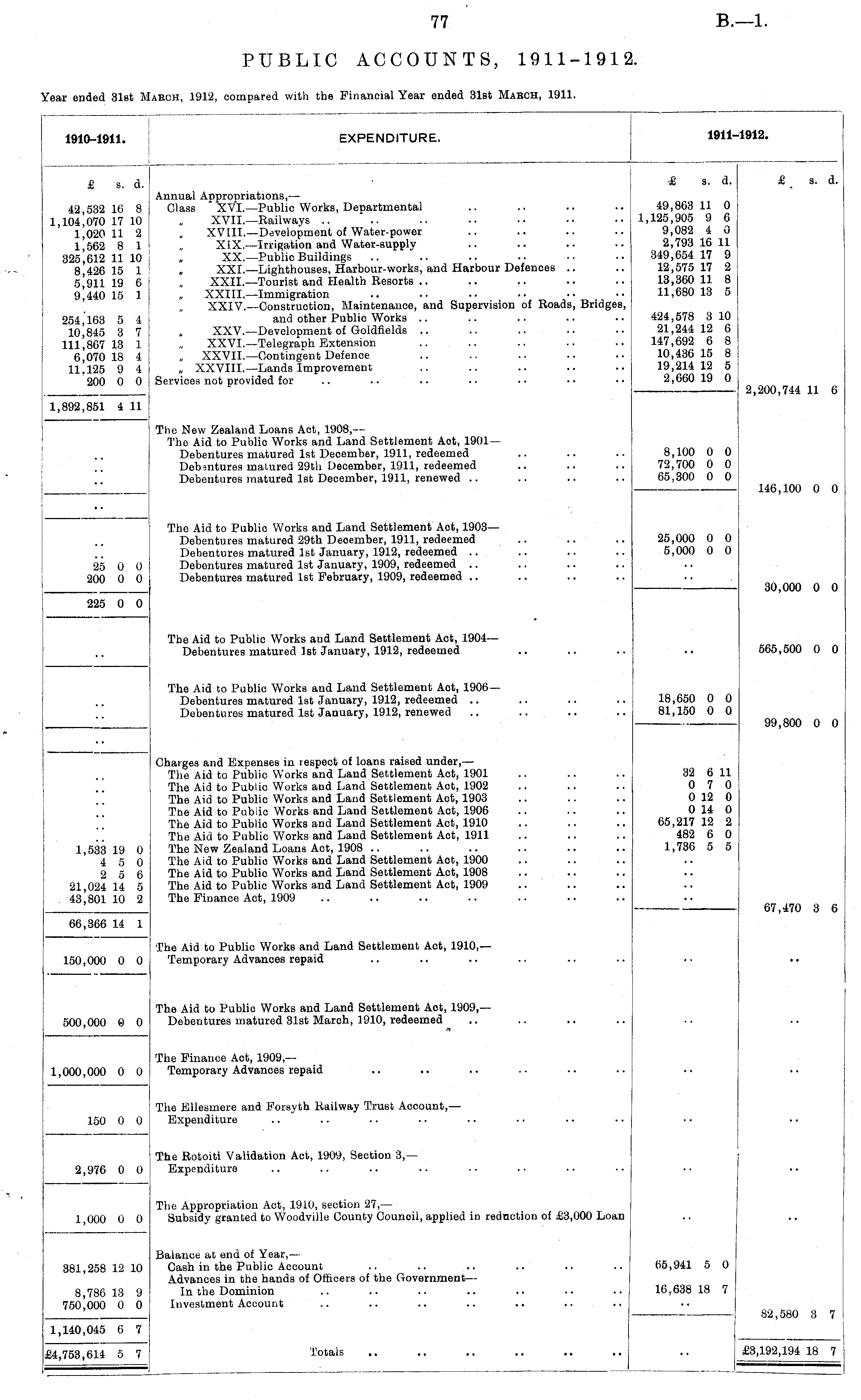 1910-1911. EXPENDITURE. 1911-1912. £ s. d. £ a. d. £_ s. d. 42,532 16 8 1,104,070 17 10 1,020 11 2 1,562 8 1 325,612 11 10 8,426 15 1 5,911 19 6 9,440 15 1 Annual Appropriations, — Class * XVI. —Public Works, Denartmental XVII.—Railways .. XVIII.—Development of Water-power XIX.—Irrigation and Water-supply XX. —Publio Buildings XXI.—Lighthouses, Harbour-works, and Harbour Defences .. XXII.—Tourist and Health Resorts XXIII. —Immigration XXIV.—Construction, Maintenance, and Supervision of Roads, Bridges, and other Public Works XXV.—Development of Goldflelds XXVL—Telegraph Extension XXVII. —Contingent Defence „ XXVIII. —Lands Improvement Services not provided for 49,863 11 0 1,125,905 9 6 9,082 4 0 2,793 16 11 349,654 17 9 12,575 17 2 13,360 11 8 11,680 13 5 254,163 5 4 10,845 3 7 111,867 13 1 6,070 18 4 11,125 9 4 200 0 0 424,578 3 10 21,244 12 6 147,692 6 8 10,436 15 8 19,214 12 5 2,660 19 0 1,892,851 4 11 The New Zealand Loans Act, 1908, — The Aid to Public Works and Land Settlement Aot, 1901 — Debentures matured 1st December, 1911, redeemed Debentures matured 29tH December, 1911, redeemed Debentures matured 1st December, 1911, renewed 2,200,744 11 6 8,100 0 0 72,700 0 0 65,300 0 0 146,100 0 0 The Aid to Publio Works and Land Settlement Act, 1903— Debentures matured 29th Deoember, 1911, redeemed .. Debentures matured 1st January, 1912, redeemed .. Debentures matured 1st January, 1909, redeemed Debentures matured 1st February, 1909, redeemed 25,000 0 0 5,000 0 0 25 0 0 200 0 0 30,000 0 0 225 0 0 The Aid to Public Works and Land Settlement Act, 1904— Debentures matured 1st January, 1912, redeemed 565,500 0 0 The Aid to Publio Works and Land Settlement Aot, 1906— Debentures matured 1st January, 1912, redeemed Debentures matured 1st January, 1912, renewed 18,650 0 0 81,150 0 0 99,800 0 0 Charges and Expenses in respect of loans raised under, — The Aid to Public Works and Land Settlement Act, 1901 The Aid to Publio Works and Land Settlement Act, 1902 The Aid to Public Works and Land Settlement Act, 1903 The Aid to Public Works and Land Settlement Act, 1906 The Aid to Public Works and Land Settlement Act, 1910 The Aid to Publio Works and Land Settlement Aot, 1911 The New Zealand Loans Act, 1908 The Aid to Public Works and Land Settlement Aot, 1900 The Aid to Publio Works and Land Settlement Act, 1908 The Aid to Public Works and Land Settlement Act, 1909 The Finance Aot, 1909 32 6 11 0 7 0 0 12 0 0 14 0 65,217 12 2 482 6 0 1,736 5 5 67,470 3 6 1,533 19 0 4 5 0 2 5 6 21,024 14 5 43,801 10 2 66,366 14 1 The Aid to Public Works and Land Settlement Act, 1910,— Temporary Advances repaid 150,000 0 0 The Aid to Public Works and Land Settlement Act, 1909,— Debentures matured 31st March, 1910, redeemed 500,000 0 0 The Finance Aot, 1909 — Temporary Advances repaid 1,000,000 0 0 The Ellesmere and Forsyth Railway Trust Account, — Expenditure 150 0 0 The Rotoiti Validation Act, 1909, Section 3, — Expenditure 2,976 0 0 1,000 0 0 The Appropriation Act, 1910, section 27, — Subsidy granted to Woodville County Counoil, applied in reduction of £3,000 Loan Balance at end of Year, — Cash in the Public Account Advances in the hands of Officers of the Government— In the Dominion Investment Account .. .. .. .. .. .. . .. 65,941 5 0 381,258 12 10 82,580 3 7 8,786 13 9 750,000 0 0 16,638 18 7 1,140,045 6 7 Totals [£4,753,614 5 7 £3,192,194 18 7