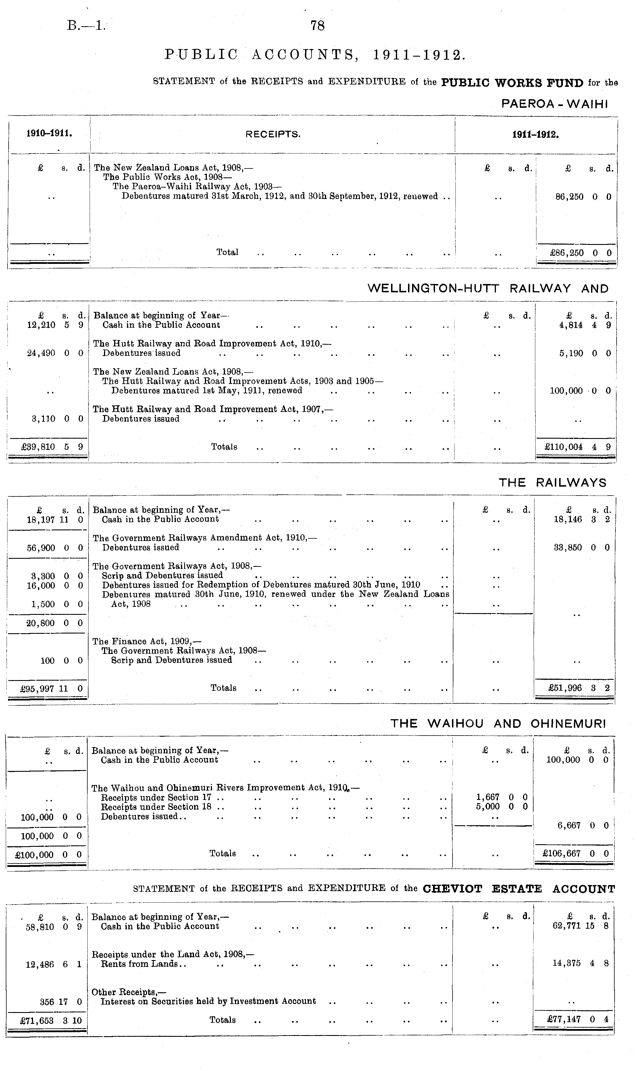IHI 1910-1911. RECEIPTS. 1911-1912. £ s. d. The New Zealand Loans Act, 1908,— £ The Public Works Aot, 1908— The Paeroa-Waihi Railway Act, 1903— Debentures matured 31st March, 1912, and 30th September, 1912, renewed s. d. £ s. d. 86,250 0 0 Total .. .. .. .. .. ..I £86,250 0 0 WELLINGTON-HUTT RAILWAY AND I £ s. d. 12,210 5 9 Balance at beginning of Year — £ Cash in the Publio Acoount s. d. £ s. d. 4,814 4 9 £ s. d. 4,814 4 9 24,490 0 0 The Hutt Railway and Road Improvement Act, 1910, — Debentures issued .. .. .. .. .. .. 5,190 0 0 5,190 0 0 The New Zealand Loans Act, 1908,— The Hutt Railway and Road Improvement Acts, 1903 and 1905 — Debentures matured 1st May, 1911, renewed .. .. .. ...I 100,000 0 0 100,000 0 0 3,110 0 0 The Hutt Railway and Road Improvement Act, 1907, — Debentures issued Totals £110,004 4 9 £39,810 5 9 £110,004 4 9 THE RAILWAYS £ s. d. 18,197 11 0 Balance at beginning of Year,— Cash in the Public Account £ 8. d. £ s. d. 18,146 3 2 The Government Railways Amendment Act, 1910, — Debentures issued 33,850 0 0 56,900 0 0 3,300 0 0 16,000 0 0 The Government Railways Act, 1908, — Scrip and Debentures issued Debentures issued for Redemption of Debentures matured 30th June, 1910 Debentures matured 30th June, 1910, renewed under the New Zealand Loans Act, 1908 1,500 0 0 20,800 0 0 The Finance Act, 1909,— The Government Railways Act, 1908 — Scrip and Debentures issued 100 0 0 £95,997 11 0 Totals £51,996 3 2 THE WA HOU AND HINEMUR! £ s. d. Balance at beginning of Year, — Gash in the Public Account £ s. d. £ s. d. 100,000 0 0 The Waihou and Ohinemuri Rivers Improvement Act, 1910,,— Receipts under Section 17 .. Receipts under Section 18 .. Debentures issued.. i l 1,667 0 0 5,000 0 0 6,667 0 0 100,000 0 0 100,000 0 0 Totals £100,000 0 0 £106,667 0 0 STATEMENT of the RECEIPTS and EXPENDITURE of the CHE' IOT ESTA 1 ■E ACCOUN • £ s. d. 58,810 0 9 Balance at beginning of Year, — Gash in the Public Account £ s. d. £ s. d. 62,771 15 8 12,486 6 1 Receipts under the Land Aot, 1908, — Rents from Lands 14,375 4 8 356 17 0 Other Receipts,— Interest on Securities held by Investment Aocount £71,653 3 10 Totals £77,147 0 4