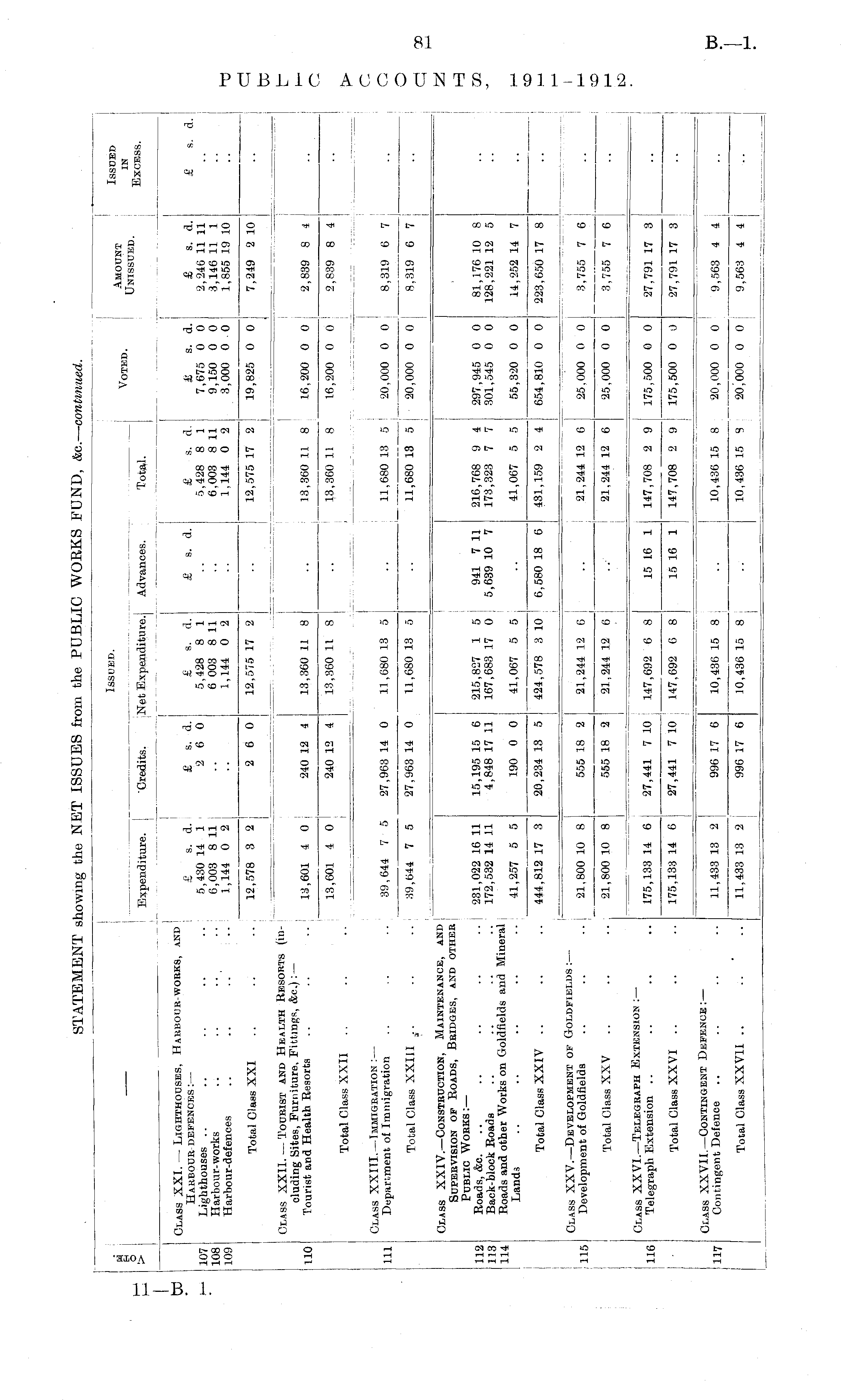 EH o > Class XXI. — Lighthouses, Harbour-works, and > Harbour-defences :— - s. a. £ s. a. Lighthouses .. .. .. •• •• 5,430 14 1 2 6 0 Harbour-works .. .. ... •• 6,003 8 11 Harbour-aef ences .. .. .. • • 1,144 0 2 Expenditure. 'Credits. Issued. et Expenaiture. £ s. a. 5,428 8 1 6 003 8 11 1,144 0 2 Aavances. Total. £ s. d. 5,428 8 1 6,003 8 11 1,144 0 2 Voted. £ s. d. 7,675 0 0 9,150 0 0 3,000 0 0 i Amount Unissued. £ s. d. 2,246 11 11 3,146 11 1 1,855 19 10 Issued IN Excess. £ s. t a. £ s. a. 5,428 8 1 6 003 8 11 1,144 0 2 £ s. a. £ s. a. 107 108 109 • • Total Class XXI 12,578 3 2 2 6 0 12,575 17 12,575 17 2 2 12,575 17 2 I 19,825 0 0 ! 7,249 2 10 I H __ L Class XXII. — Tourist and Health Resorts (including Sites, Furniture, Fittings, &c.) : — Tourist and Health Resorts .. .. ..! 13,601 4 0 240 12 4 13,360 11 13,360 11 8 8 ] 13,360 11 8 16,200 0 0 2,839 8 4 110 13 fif)1 4. O 940 19 4 13. •AGO 11 S 13,601 4 O ' -24U Iii 4 Total Class XXII .. .. .. ' 13,601 4 0 240 12 4 13,300 1L S 13,360 11 8 13,360 11 8 16,200 0 0 2,839 8 4 I i Class XXITI. -Immigration :— Department of Immigration .. .. .. 39,644 7 5 27,963 14 0 11,680 13 5 11,680 13 5 20,000 0 0 8,319 6 7 111 Total Class XXII I ,. .. -. 39,644 7 5 27,963 14 0 27,963 14 0 11,680 13 5 11,680 13 5 11,680 13 5 j 20,000 0 0 8,319 6 7 112 113 114 Class XXIV. —Construction, Maintenance, and Supervision op Roads, Bridges, and other j Public Works: — Roads,&o .. ■■ ■•! 231,022 16 11 15,195 15 6 Back-block Roads 172,532 14 11 4,848 17 11 Roads and other Works on Goldflelds and Mineral Lands \ 41,257 5 5 190 0 0 15,195 15 6 4,848 17 11 215,827 1 5 167,683 17 0 41,067 5 5 215,827 1 5 167,683 17 0 941 7 11 5,639 10 7 216,768 9 4 173,323 7 7 297,945 0 0 301,545 0 0 81,176 10 8 128,221 12 5 190 0 0 41,067 5 5 41,067 5 5 55,320 0 0 14,252 14 7 Total Class XXIV .. .. .. 444,812 17 3 20,234 13 5 20,234 13 5 424,578 3 10 424,578 3 10 ' 6,580 18 6 431,159 2 4 654,810 0 0 223,650 17 8 1= ' - =J= Class XXV. —Development of Goldfields :— Development of Goldflelds .. .. ..j 21,800 10 8 555 18 2 555 18 2 21,244 12 6 21,244 12 6 21,244 12 6 25,000 0 0 3,755 7 6 115 Total Class XXV .. .. ..' 21,800 10 8 555 18 2 21,800 10 8 555 18 2 21,244 12 6 21,244 12 6 21,244 12 6 25,000 0 0 3,755 7 6 _.l Class XXVI.— Telegraph Extension :— Telegraph Extension .. .. .. .. 175,133 14 6, 27,441 7 10 175,133 14 6 27,441 7 10 147,692 6 8 147,692 6 8 116 15 16 1 147,708 2 9 175,500 0 0 27,791 17 3 I Total Class XXVI .. .. .. 175,133 14 6 j 27,441 7 10; 175,133 14 6 | 27,441 7 10 147,692 6 8 147,692 6 8 15 16 1 147,708 2 9 175,500 0 0 27,791 17 3 Class XXVII.— Contingent Defence: — Contingent Defence .. .. .. ■• 11,433 13 2 996 17 6 11,433 13 2 10,436 15 8 10,436 15 8 117 996 17 6 10,436 15 8 20,000 0 0 9,563 4 4 Total Class XXVII .. .. .. 11,433 13 2 996 17 6 11,433 13 2 996 17 6 10,436 15 8 10,436 15 8 i 10,436 15 8 20;000 0 0 9,563 4 4