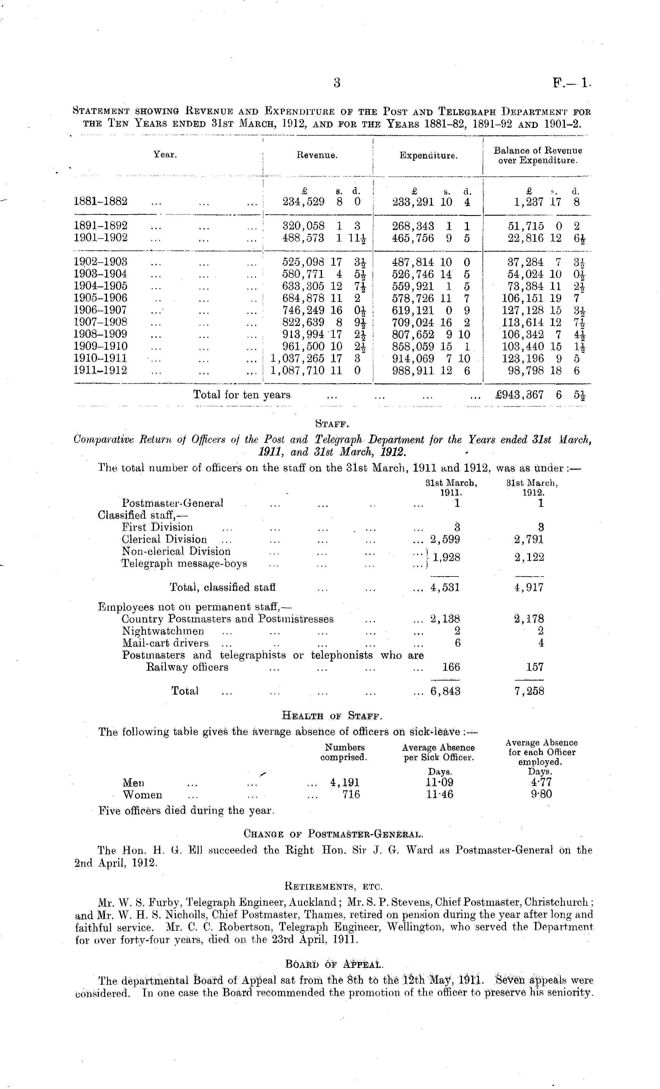 Statement showing Revenue and Expenditure of the Post and Telegraph Department for the Ten Years ended 31st March, 1912, and for the Years 1881-82, 1891-92 and 1901-2.