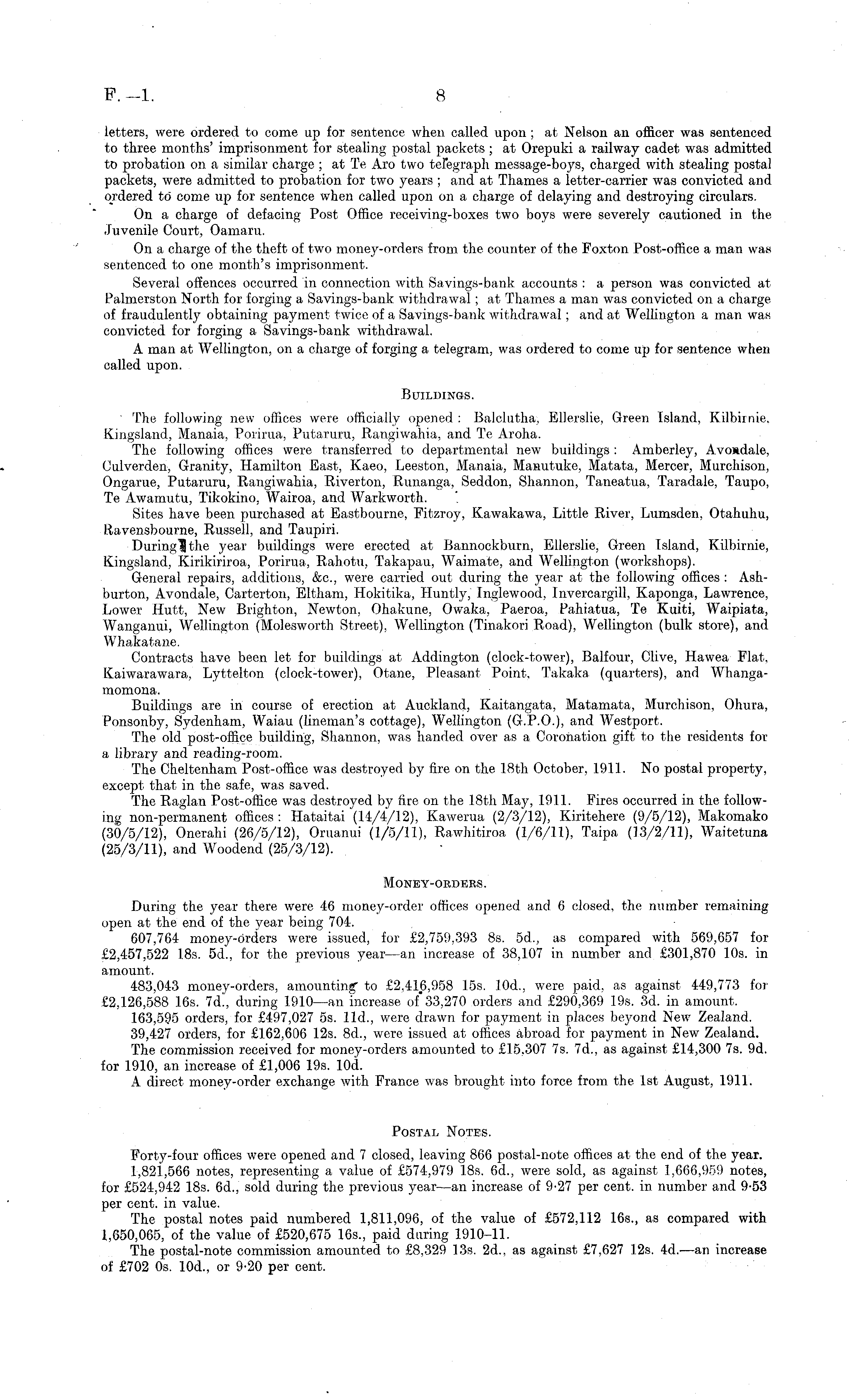 letters, were ordered to come up for sentence when called upon ; at Nelson an officer was sentenced to three months' imprisonment for stealing postal packets; at Orepuki a railway cadet was admitted to probation on a similar charge ; at Te Aro two telegraph message-boys, charged with stealing postal packets, were admitted to probation for two years ; and at Thames a letter-carrier was convicted and ordered to come up for sentence when called upon on a charge of delaying and destroying circulars. On a charge of defacing Post Office receiving-boxes two boys were severely cautioned in the Juvenile Court, Oamaru. On. a charge of the theft of two money-orders from the counter of the Foxton Post-office a man was sentenced to one month's imprisonment. Several offences occurred in connection with Savings-bank accounts : a person was convicted at Palmerston North for forging a Savings-bank withdrawal ; at Thames a man was convicted on a charge of fraudulently obtaining payment twice of a Savings-bank withdrawal; and at Wellington a man was convicted for forging a Savings-bank withdrawal, A man at Wellington, on a charge of forging a telegram, was ordered to come up for sentence when called upon. Buildings. The following new offices were officially opened: Balclutha, Ellerslie, Green Island, Kilbunie. Kingsland, Manaia, Porirua, Putaruru, Rangiwahia, and Te Aroha. The following offices were transferred to departmental new buildings : Amberley, Avoadale, Culverden, Granity, Hamilton East, Kaeo, Leeston, Manaia, Manutuke, Matata, Mercer, Murchison, Ongarue, Putaruru, Rangiwahia, Riverton, Runanga, Seddon, Shannon, Taneatua, Taradale, Taupo, Te Awamutu, Tikokino, Wairoa, and Warkworth. Sites have been purchased at Eastbourne, Fitzroy, Kawakawa, Little River, Lumsden, Otahuhu, Ravensbourne, Russell, and Taupiri. Duringlthe year buildings were erected at Bannockburn, Ellerslie, Green Island, Kilbirnie, Kingsland, Kirikiriroa, Porirua., Rahotu, Takapau, Waimate, and Wellington (workshops). General repairs, additions, &c, were carried out during the year at the following offices : Ashburton, Avondale, Carterton, Eltham, Hokitika, Huntly, Inglewood, Invercargill, Kaponga, Lawrence, Lower Hutt, New Brighton, Newton, Ohakune, Owaka, Paeroa, Pahiatua, Te Kuiti, Waipiata, Wanganui, Wellington (Molesworth Street), Wellington (Tinakori Road), Wellington (bulk store), and Whakatane. Contracts have been let for buildings at Addington (clock-tower), Balfour, Clive, Hawea Flat, Kaiwarawara, Lyttelton (clock-tower), Otane, Pleasant Point, Takaka (quarters), and Whangamomona. Buildings are in course of erection at Auckland, Kaitangata, Matamata, Murchison, Ohura, Ponsonby, Sydenham, Waiau (lineman's cottage), Wellington (G.P.0.), and Westport. The old post-office building, Shannon, was handed over as a Coronation gift to the residents for a library and reading-room. The Cheltenham Post-office was destroyed by fire on the 18th October, 1911. No postal property, except that in the safe, was saved. The Raglan Post-office was destroyed by fire on the 18th May, 1911. Fires occurred in the following non-permanent offices : Hataitai (14/4/12), Kawerua (2/3/12), Kiritehere (9/5/12), Makomako (30/5/12), Onerahi (26/5/12), Oruanui (1/5/11), Rawhitiroa (1/6/11), Taipa (13/2/11), Waitetuna (25/3/11), and Woodend (25/3/12). Money-orders. During the year there were 46 money-order offices opened and 6 closed, the number remaining open at the end of the year being 704. 607,764 money-orders were issued, for £2,759,393 Bs. 5d., as compared with 569,657 for £2,457,522 18s. 5d., for the previous year —an increase of 38,107 in number and £301,870 10s. in amount. 483,043 money-orders, amounting- to £2,416,958 15s. 10d., were paid, as against 449,773 for £2,126,588 16s. 7d'., during 1910—-an increase of" 33,270 orders and £290,369 19s. 3d. in amount, 163,595 orders, for £497,027 ss. lid., were drawn for payment in places beyond New Zealand. 39,427 orders, for £162,606 12s. Bd., were issued at offices abroad for payment in New Zealand. The commission received for money-orders amounted to £15,307 7s. 7d., as against £14,300 7s. 9d. for 1910, an increase of £1,006 19s. lOd. A direct money-order exchange with France was brought into force from the Ist August, 1911. Postal Notes. Forty-four offices were opened and 7 closed, leaving 866 postal-note offices at the end of the year. 1,821,566 notes, representing a value of £574,979 18s. 6d., were sold, as against 1,666,959 notes, for £524,942 18s. 6d., sold during the previous year—an increase of 9-27 per cent, in number and 9-53 per cent, in value. The postal notes paid numbered 1,811,096, of the value of £572,112 165., as compared with 1,650,065, of the value of £520,675 165., paid during 1910-11. The postal-note commission amounted to £8,329 13s. 2d., as against £7,627 12s. 4d.—an increase of £702 os. 10d, or 9-20 per cent.