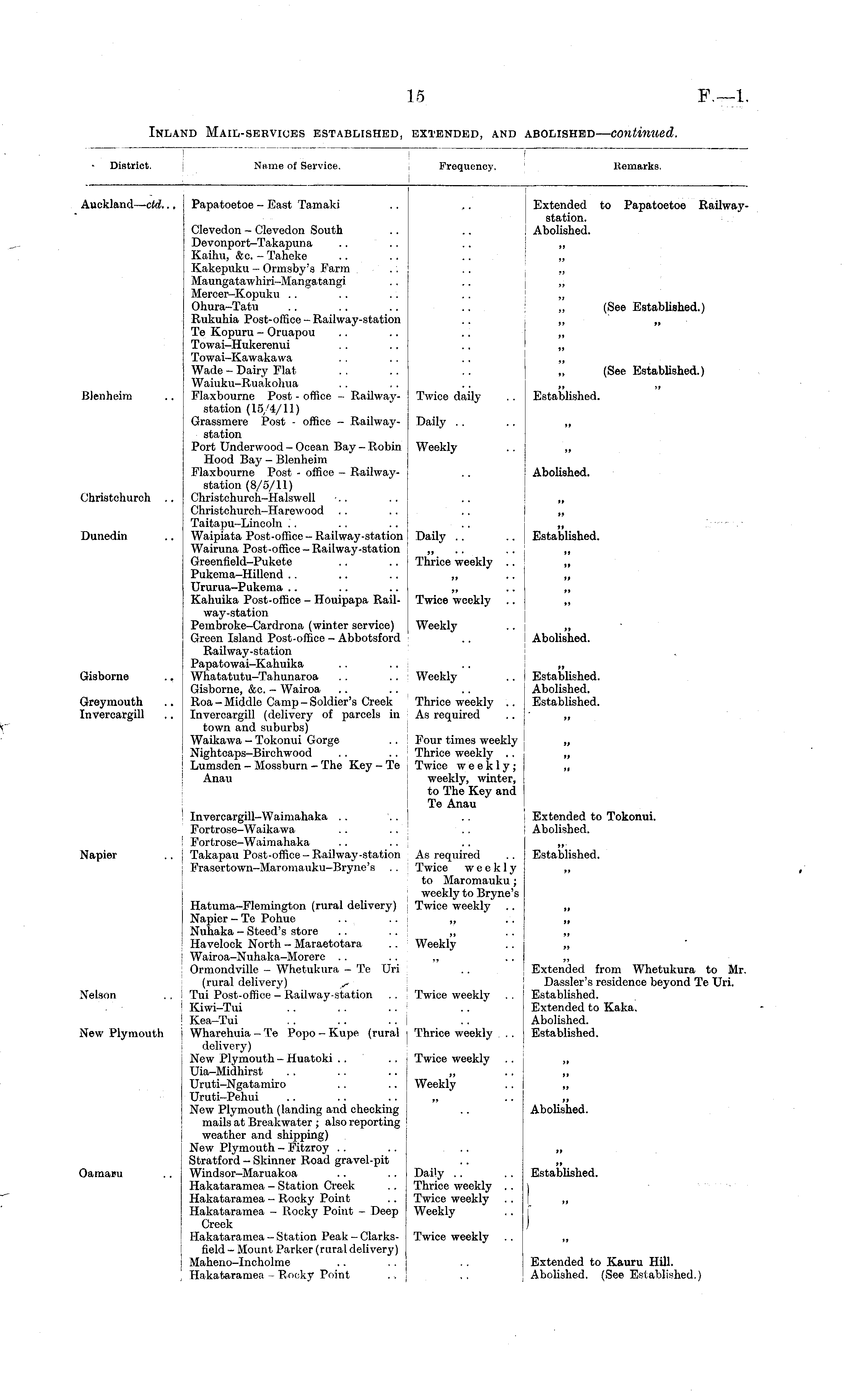 District. Name of Service. Frequency. Kemarks. Auckland— ctd.. , Papatoetoe - East Tamaki Extended to Papatoetoe Railwaystation. Abolished. Blenheim Ohristchurch Clevedon - Clevedon South Devonport-Takapuna Kaihu, &e. - Taheke Kakepuku - Ormsby's Farm Manngatawhiri-Mangatangi Mercer-Kopuku Ohura-Tatu Rukuhia Post-office - Railway-station Te Kopuru — Oruapou Towai-Hukerenui Towai-Kawakawa Wade - Dairy Flat Waiuku-Ruakohua Flaxbourne Post - office - Railway- Twice daily station (15/4/11) Grassmere Post - office - Railway- Daily station Port Underwood - Ocean Bay - Robin Weekly Hood Bay - Blenheim Flaxbourne Post - office - Railwaystation (8/5/11) Christchurch-Halswell Christchurch-Harewood Taitapu-Lincoln Waipiata Post-office-Railway-station ! Daily .. Wairuna Post-office - Railway-station ; „ Greenfield-Pukete .. .. j Thrice weekly .. Pukema-Hillend .. .. .. „ Ururua—Pukema .. .. .. „ Kahuika Post-office - Houipapa Rail- ; Twice weekly way-station Pembroke-Cardrona (winter service) j Weekly Green Island Post-office - Abbotsford Railway-station Papatowai-Kahuika .. .. I Whatatutu-Tahunaroa .. .. Weekly Gisborne, &c. - Wairoa .. Roa-Middle Camp-Soldier's Creek Thrice weekly .. Invercargill (delivery of parcels in As required town and suburbs) Waikawa — Tokonui Gorge .. j Four times weekly Nightcaps—Birchwood . . .. Thrice weekly .. Lumsden - Mossburn - The Key - Te Twice weekly; Anau weekly, winter, to The Key and Te Anau >t (See Established.) ,. t, „ (See Established.) Established. Abolished. Dunedin Established. »t »» »» Abolished. Jisborne Established. Abolished. Established. jreymouth 'nvercargill »» " I Invercargill-Waimahaka .. '.. I Fortrose—Waikawa .. .. Fortrose-Waimahaka .. Takapau Post-office-Railway-station As required Frasertown-Maromauku-Bryne's .. Twice weekly to Maromauku ; weekly to Bryne's Hatuma-Flemington (rural delivery) Twice weekly Napier - Te Pohue .. .. „ Nuhaka — Steed's store .. .. ,, Havelock North - Maraetotara . . Weekly Wairoa-Nuhaka-Morere Ormondville - Whetukura - Te Uri (rural delivery) Tui Post-office - Railway-station .. Twice weekly Kiwi-Tui .. .. .. Kea-Tui Wharehuia - Te Popo - Kupe (rural Thrice weekly .. delivery) New Plymouth — Huatoki .. .. j Twice weekly Uia-Midhirst .. .. .. [ „ Uruti-Ngatamiro .. .. Weekly Uruti-Pehui .. .. .. „ New Plymouth (landing and checking I mails at Breakwater ; also reporting j weather and shipping) New Plymouth - Fitzroy .. .. Stratford — Skinner Road gravel-pit Windsor-Maruakoa .. .. Daily Hakataramea - Station Creek . . Thrice weekly .. Hakataramea - Rocky Point .. Twice weekly Hakataramea - Rocky Point - Deep Weekly Creek Hakataramea - Station Peak - Clarks- Twice weekly .. field - Mount Parker (rural delivery) Maheno-Inchoime Hakataramea - Rooky Point I i Extended to Tokonui. Abolished. [apier Established. )r >> i> felson Extended from Whetukura to Mr. Dassler's residence beyond Te Uri. Established. Extended to Kaka. Abolished. Established. ew Plymouth )t »» Abolished. »» liiinani Established. 1 .. Extended to Kauru Hill. Abolished. (See Established.)