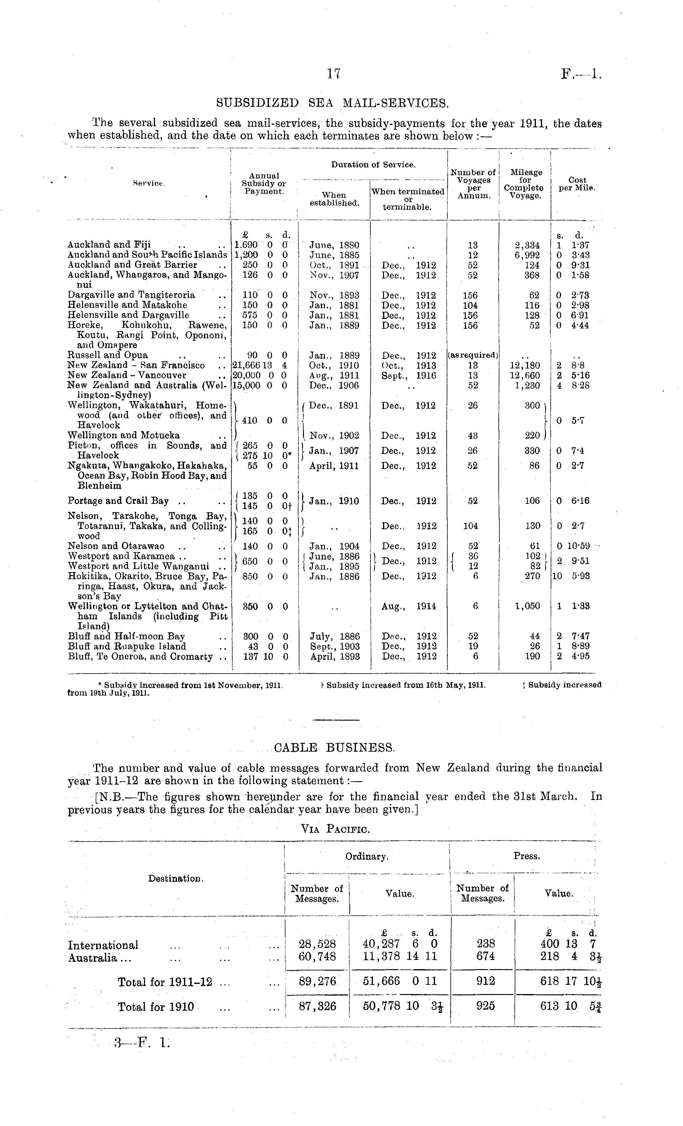 CABLE BUSINESS. The number and value of cable messages forwarded from New Zealand during the financial year 1911-12 are shown in the following statement:— [N.B.—The figures shown hereunder are for the financial year ended the 31st March. In previous years the figures for the calendar year have been given.]