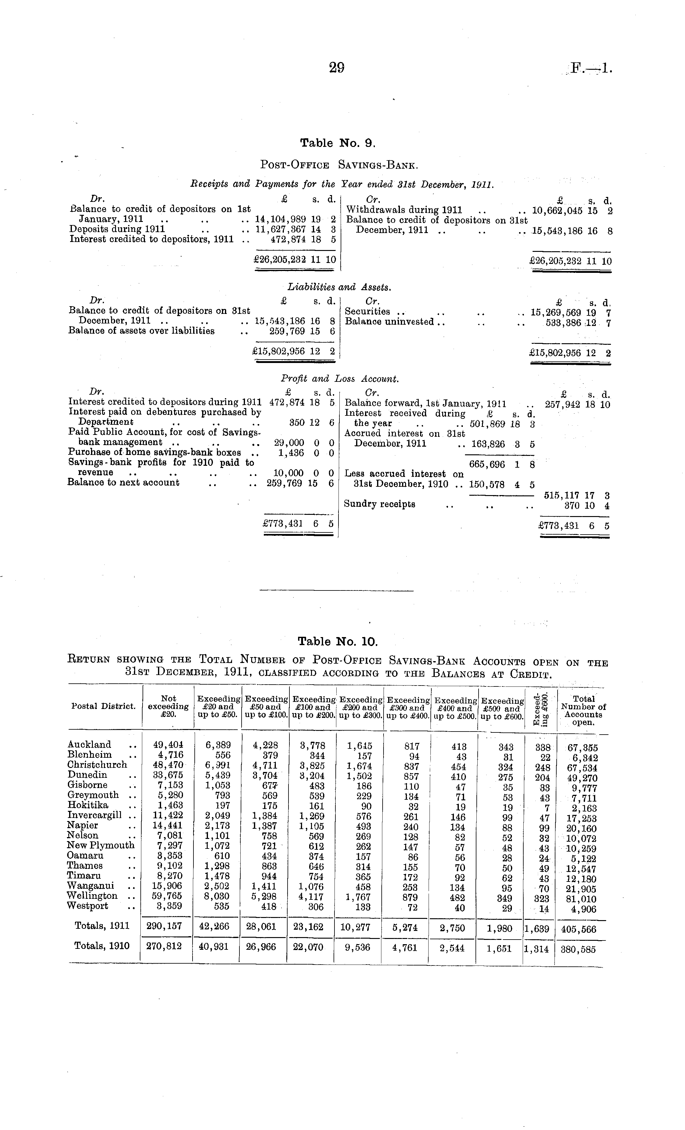 Table No. 9. Post-Office Savings-Bank. Receipts and Payments for the Year ended 31st December, 1911, Dr. £ s. d. Gr. £ s . d. Balance to credit of depositors on 1st Withdrawals during 1911 .. .. 10,662,045 15 2 January, 1911 .. .. .. 14,104,989 19 2 Balance to credit of depositors on 31st Deposits during 1911 .. .. 11,627,367 14 3 December, 1911 .. .. .. 15,543,186 16 8 Interest credited to depositors, 1911 .. 472,874 18 5 £26,205,232 11 10 £26,205,232 11 10 Liabilities and Assets. Dr. £ s. d. Cr. £ s . d, Balance to credit of depositors on 31st Securities .. .. .. .. 15,269,569 19 7 December, 1911 .. .. .. 15,543,186 16 8 Balanoe uninvested .. .. .. 5331386 12 7 Balanoe of assebs over liabilities .. 259,769 15 6 £15,802,956 12 2 £15,802,956 12 2 Profit and Loss Account. Dr. £ s. d. Gr. £ 8 , d. Interest credited to depositors during 1911 472,874 18 5 Balance forward, 1st January, 1911 .. 257,942 18 10 Interest paid on debentures purchased by Interest received during £ s. d. Department .. .. .. 350 12 6 the year .. .. 501,869 18 3 Paid Public Account, for cost of Savings- Accrued interest on 31st bank management .. .. .. 29,000 0 0 December, 1911 .. 163,826 3 5 Purchase of home savings-bank boxes .. 1,436 0 0 Savings-bank profits for 1910 paid to 665,696 1 8 revenue .. .. .. .. 10,000 0 0 Less accrued interest on Balance to next account .. .. 259,769 15 6 31st December, 1910 .. 150,578 4 5 515,117 17 3 Sundry receipts .. .. .. 370 10 & £773,431 6 5 . £773,431 6 5