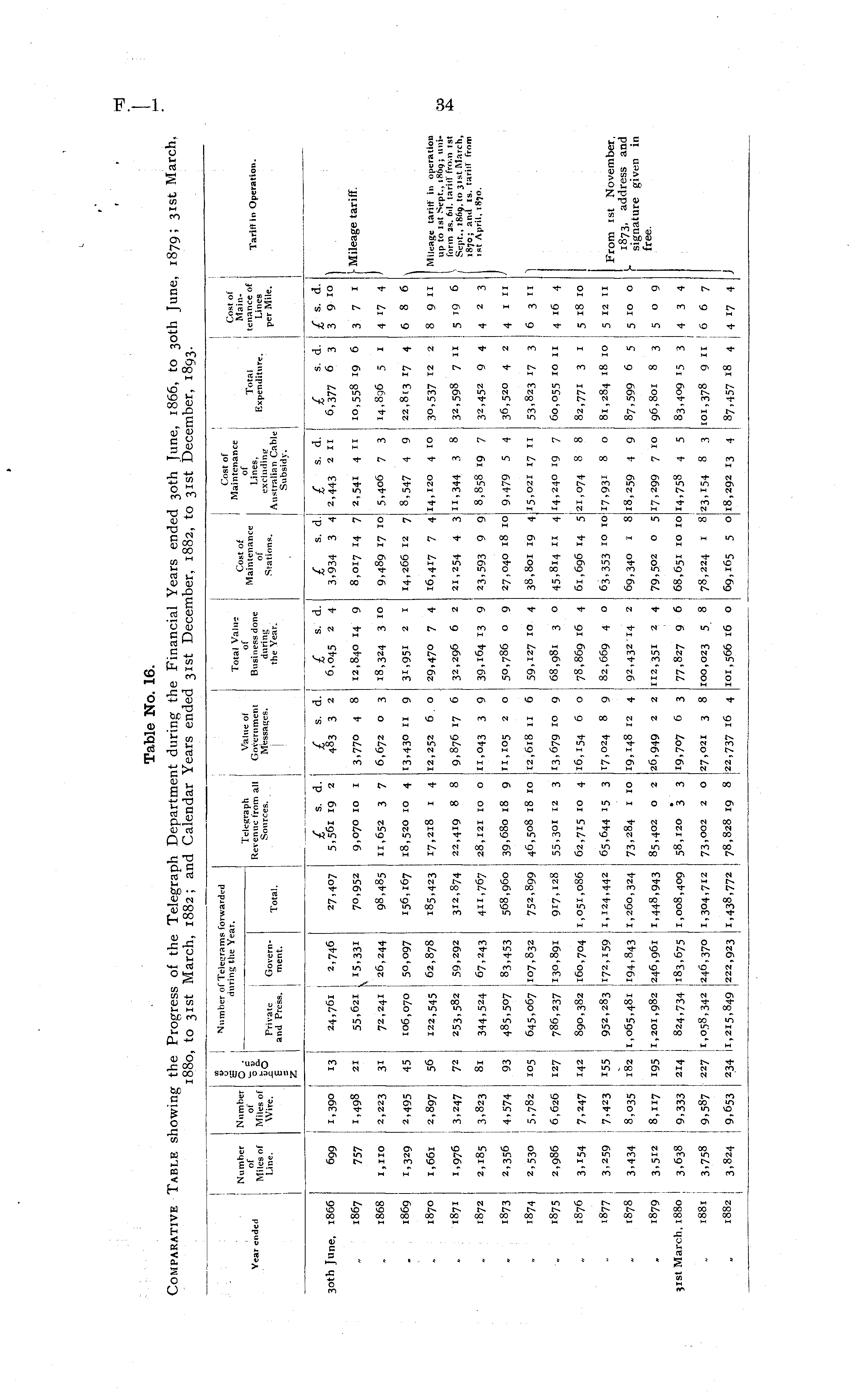 Table No. 16. Comparative Table showing the Progress of the Telegraph Department during the Financial Years ended 30th June, 1866, to 30th June, 1879; 31st March, 1880, to 31st March, 1882; and Calendar Years ended 31st December, 1882, to 31st December, 1893.