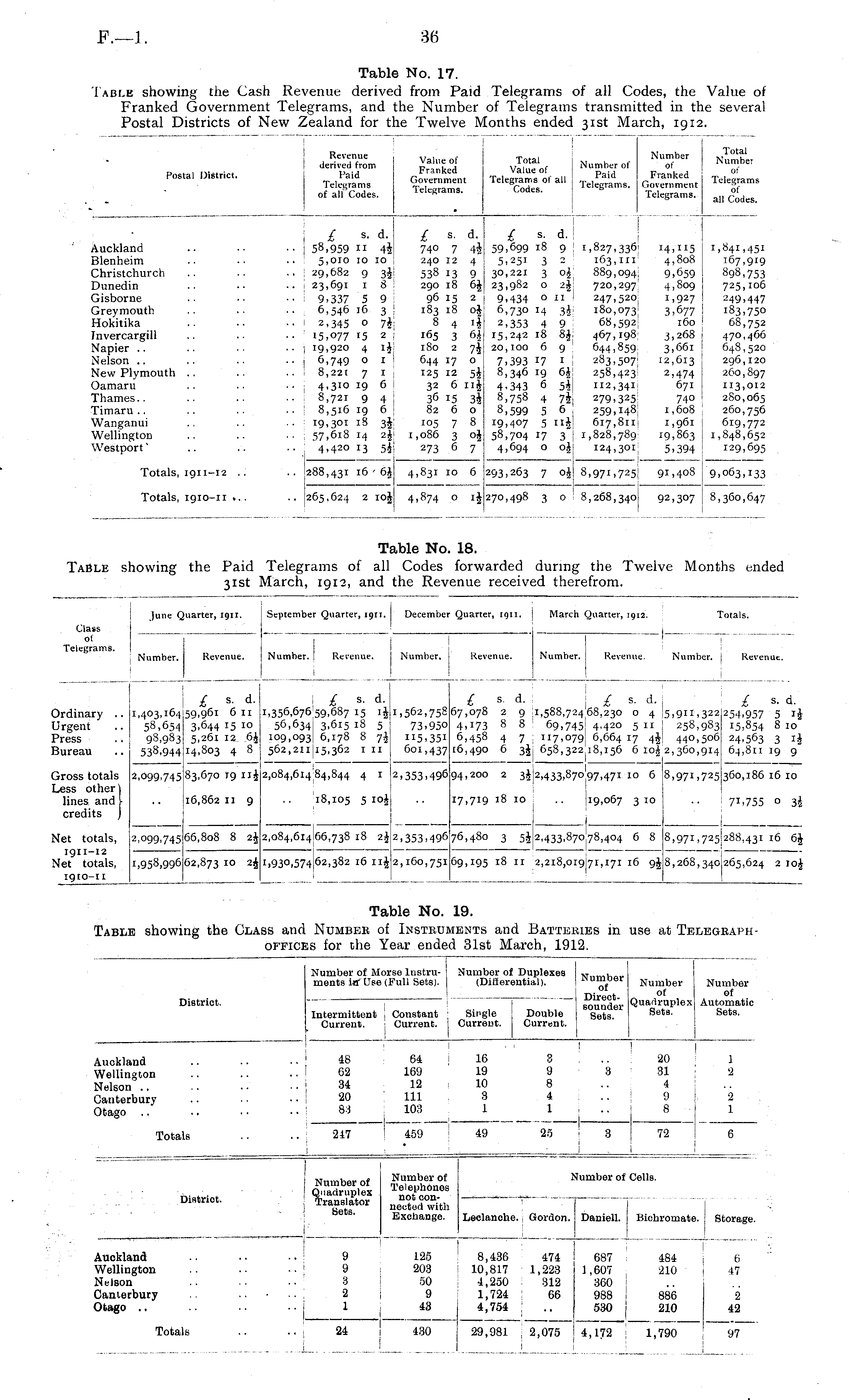 Table No. 17. Table showing the Cash Revenue derived from Paid Telegrams of all Codes, the Value of Franked Government Telegrams, and the Number of Telegrams transmitted in the several Postal Districts of New Zealand for the Twelve Months ended 31st March, 1912.