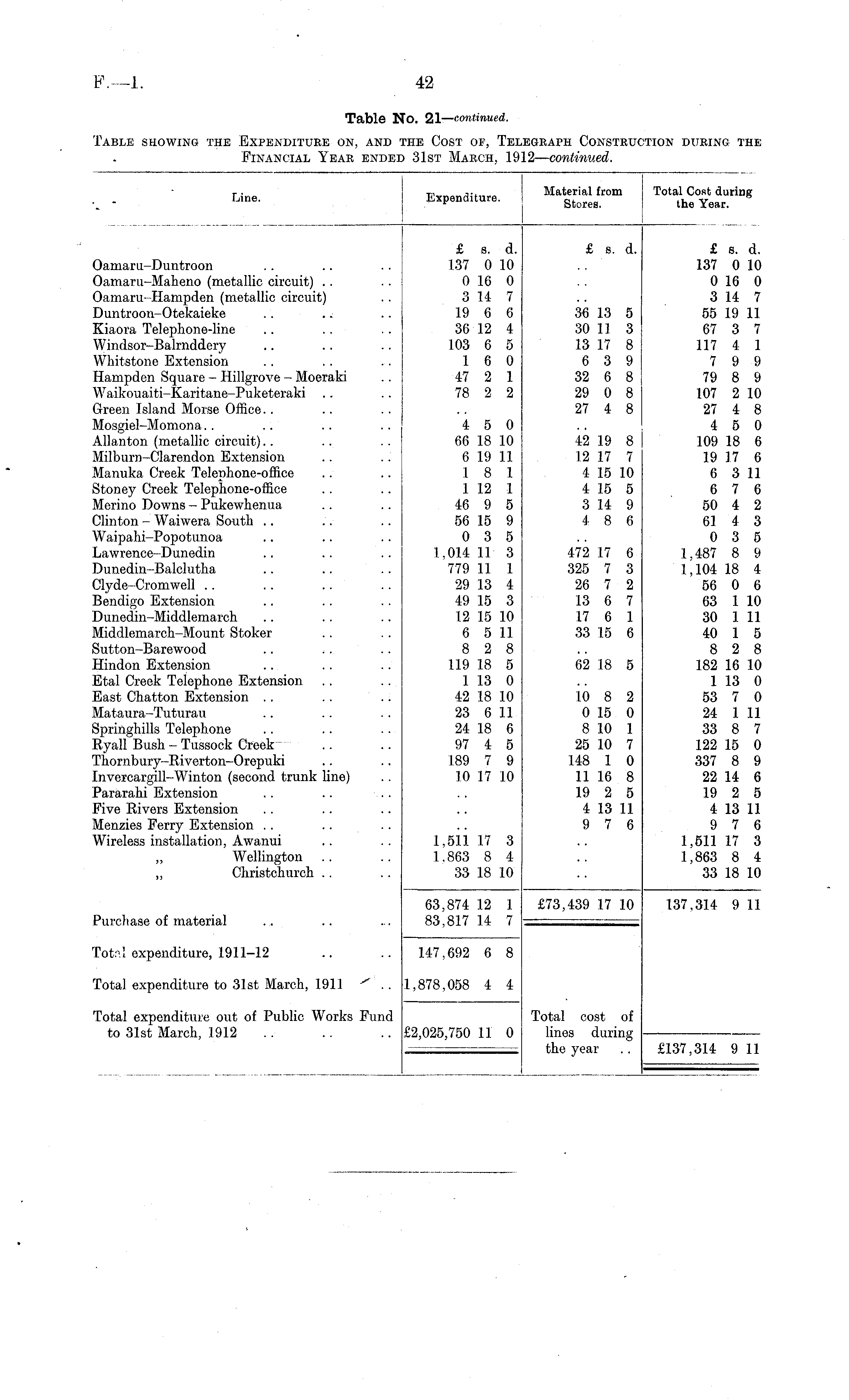 Line. Expenditure. .aterial from Stores. otal Cost during the Year. Oamaru-Duntroon Oamaru-Maheno (metallic circuit) Oamaru-Hampden (metallic circuit) D untroon-Otekaieke Kiaora Telephone-line Windsor-Bairnddery Whitstone Extension Hampden Square - Hillgrove - Moeraki Waikouaiti-Karitane-Puketeraki Green Island Morse Office.. Mosgiel-Momona Allanton (metallic circuit). . Milburn-Clarendon Extension Manuka Creek Telephone-office Stoney Creek Telephone-office Merino Downs - Pukewhenua Clinton - Waiwera South .. Waipahi-Popotunoa Lawrence-Dunedin Dunedin-Balclutha Clyde-Cromwell Bendigo Extension Dunedin-Middlemarch Middlemarch-Mount Stoker Sutton-Barewood Hindon Extension Etal Creek Telephone Extension East Chatton Extension . . Mataura-Tuturau Springhills Telephone Ryall Bush - Tussock Creek Thornbury-Riverton-Orepuki Invercargill-Winton (second trunk line) Pararahi Extension Five Rivers Extension Menzies Ferry Extension Wireless installation, Awanui „ Wellington ,, Christchurch £ s. d. 137 0 10 0 16 0 3 14 7 19 6 6 36 12 4 103 6 5 1 6 0 47 2 1 78 2 2 £ s. d. 36 13 5 30 11 3 13 17 8 6 3 9 32 6 8 29 0 8 27 4 8 £ s. d. 137 0 10 0 16 0 3 14 7 55 19 11 67 3 7 117 4 1 7 9 9 79 8 9 107 2 10 27 4 8 4 5 0 109 18 6 19 17 6 6 3 11 6 7 6 50 4 2 61 4 3 0 3 5 1,487 8 9 1,104 18 4 56 0 6 63 1 10 30 1 11 40 1 5 8 2 8 182 16 10 1 13 0 53 7 0 24 1 11 33 8 7 122 15 0 337 8 9 22 14 6 19 2 5 4 13 11 9 7 6 1,511 17 3 1,863 8 4 33 18 10 4 5 0 66 18 10 6 19 11 1 8 1 1 12 1 46 9 5 56 15 9 0 3 5 1,014 11 3 779 11 1 29 13 4 49 15 3 12 15 10 6 5 11 8 2 8 119 18 5 1 13 0 42 18 10 23 6 11 24 18 6 97 4 5 189 7 9 10 17 10 42 19 8 12 17 7 4 15 10 4 15 5 3 14 9 4 8 6 472 17 6 325 7 3 26 7 2 13 6 7 17 6 1 33 15 6 62 18 5 10 8 2 0 15 0 8 10 1 25 10 7 148 1 0 11 16 8 19 2 5 4 13 11 9 7 6 1,511 17 3 1,863 8 4 33 18 10 Purchase of material 63,874 12 83,817 14 I 7 £73,439 17 10 137.314 9 11 Totfl! expenditure, 1911-12 147,692 6 8 Total expenditure to 31st March, 1911 * .. 1,878,058 4 4 Total expenditure out of Public Works Fund to 31st March, 1912 £2,025,750 11 0 Total cost of lines during the year £137,314 9 11