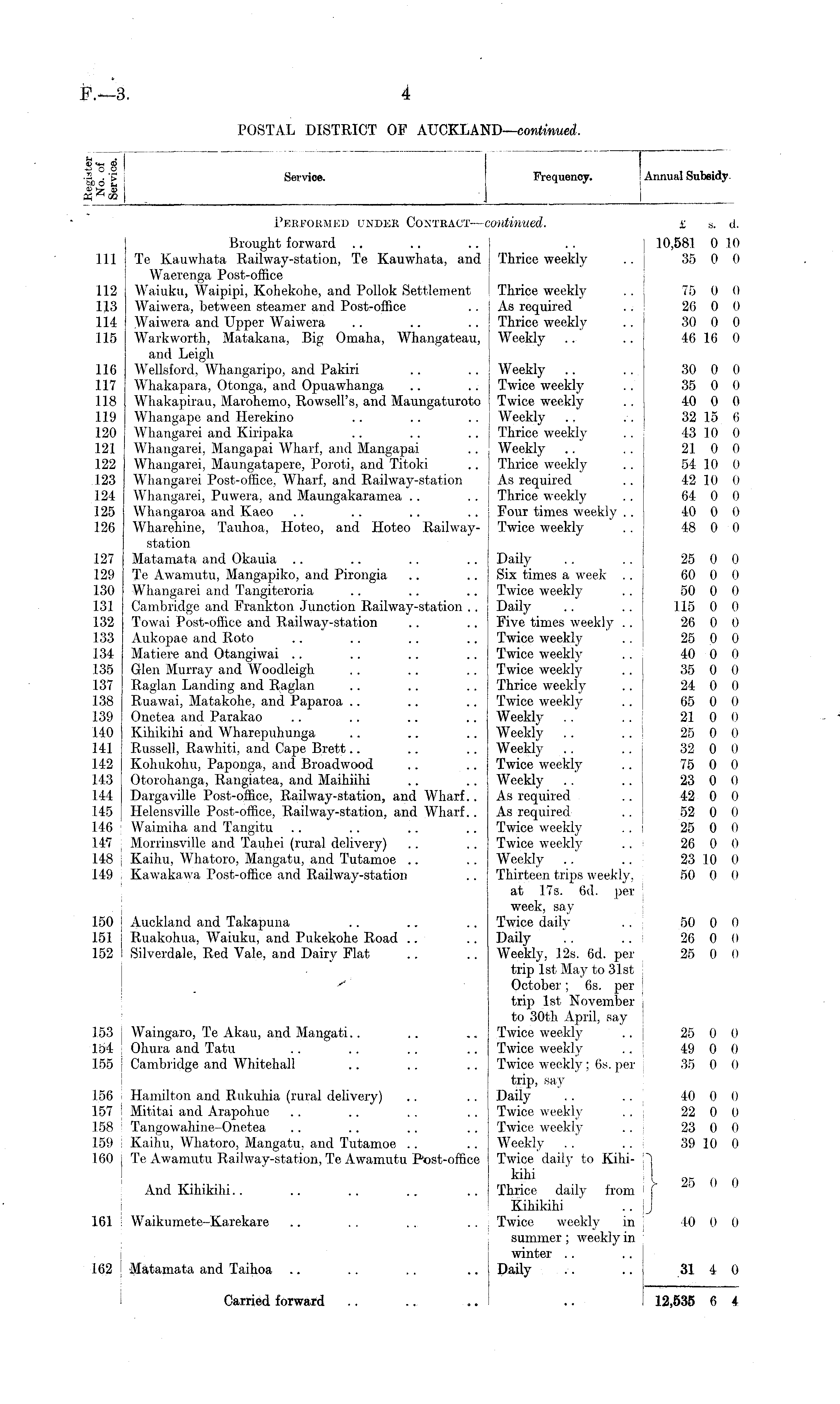 too (, Xt^ui Service. Frequency. Annual SubsidyPerformed under Contract— •ontinued. £ s. d. Ill 112 113 114 115 116 117 118 119 120 121 122 123 124 125 126 127 129 130 131 132 133 134 135 137 138 139 140 141 142 143 144 145 146 147 148 149 Brought forward Te Kauwhata Railway-station, Te Kauwhata, and Waerenga Post-office Waiuku, Waipipi, Kohekohe, and Pollok Settlement Waiwera, between steamer and Post-office Waiwera and Upper Waiwera Warkworth, Matakana, Big Omaha, Whangateau, and Leigh Wellsford, Whangaripo, and Pakiri W T hakapara, Otonga, and Opuawhanga Whakapirau, Marohemo, Rowsell's, and Maungaturoto Whangape and Herekino Whangarei and Kiripaka Whangarei, Mangapai Wharf, and Mangapai Whangarei, Maungatapere, Poroti, and Titoki Whangarei Post-office, Wharf, and Railway-station Whangarei, Puwera, and Maungakaramea Whangaroa and Kaeo W T harehine, Tauhoa, Hoteo, and Hoteo Railwaystation Matamata and Okauia Te Awamutu, Mangapiko, and Pirongia Whangarei and Tangiteroria Cambridge and Frankton Junction Railway-station .. Towai Post-office and Railway-station Aukopae and Roto Matiere and Otangiwai Glen Murray and Woodleigh Raglan Landing and Raglan Ruawai, Matakohe, and Paparoa Onctea and Parakao Kihikihi and Wharepuhunga Russell, Rawhiti, and Cape Brett Kohukohu, Paponga, and Broadwood Otorohanga, Rangiatea, and Maihiihi Dargaville Post-office, Railway-station, and Wharf. . Helensville Post-office, Railway-station, and Wharf.. Waimiha and Tangitu Morrinsville and Tauhei (rural delivery) Kaihu, Whatoro, Mangatu, and Tutamoe Kawakawa Post-office and Railway-station 10,581 0 10 Thrice weekly .. 35 0 0 Thrice weekly .. 75 0 0 As required .. 26 0 0 Thrice weekly .. 30 0 0 Weekly .. .. 46 16 0 Weekly .. .. 30 0 0 Twice weekly .. 35 0 0 Twice weekly .. 40 0 0 Weekly .. .. 32 15 6 Thrice weekly .. 43 10 0 Weekly .. .. 21 0 0 Thrice weekly .. 54 10 0 As required .. 42 10 0 Thrice weekly .. 64 0 0 Four times weekly .. 40 0 0 Twice weekly . . 48 0 0 Daily .. .. 25 0 0 Six times a week .. 60 0 0 Twice weekly .. 50 0 0 Daily .. .. 115 0 0 Five times weekly .. 26 0 0 Twice weekly .. j 25 0 0 Twice weekly .. 40 0 0 Twice weekly .. 35 0 0 Thrice weekly .. 24 0 0 Twice weekly .. 65 0 0 Weekly .. .. 21 0 0 Weekly .. .. 25 0 0 Weekly .. .. 32 0 0 Twice weekly .. 75 0 0 Weekly .. .. 23 0 0 As required .. 42 0 0 As required .. 52 0 0 Twice weekly . . 25 0 0 Twice weekly .. 26 0 0 Weekly .. ,. j 23 10 0 Thirteen trips weekly, 50 0 0 at 17s. 6d. per week, say Twice daily .. 50 0 0 Daily *.. .. : 26 0 0 Weekly, 12s. 6d. per 25 0 0 trip 1st May to 31st October; 6s. per trip 1st November to 30th April, say Twice weekly .. | 25 0 0 Twice weekly .. 49 0 0 Twice weekly; 6s. per 35 0 0 trip, say Daily .. .. 40 0 0 Twice weekly .. 22 0 0 Twice weekly .. 23 0 0 Weekly . .' .. : 39 10 0 Twice daily to Kihi- \~) k i hl [ I 25 0 0 Thrice daily from > j Kihikihi .. jj Twice weekly in 40 0 0 summer; weekly in winter .. Daily .-. .. I 31 4 0 150 151 152 Auckland and Takapuna Ruakohua, Waiuku, and Pukekohe Road Silverdale, Red Vale, and Dairy Flat y 153 154 155 Waingaro, Te Akau, and Mangati Ohura and Tatu Cambridge and Whitehall 156 157 158 159 160 Hamilton and Rukuhia (rural delivery) Mititai and Arapohue Tangowahine-Onetea Kaihu, Whatoro, Mangatu, and Tutamoe Te Awamutu Railway-station, Te Awamutu Post-office And Kihikihi.. 161 W'aikumete-Karekare 162 Matamata and Taihoa Carried forward 12,535 6 4