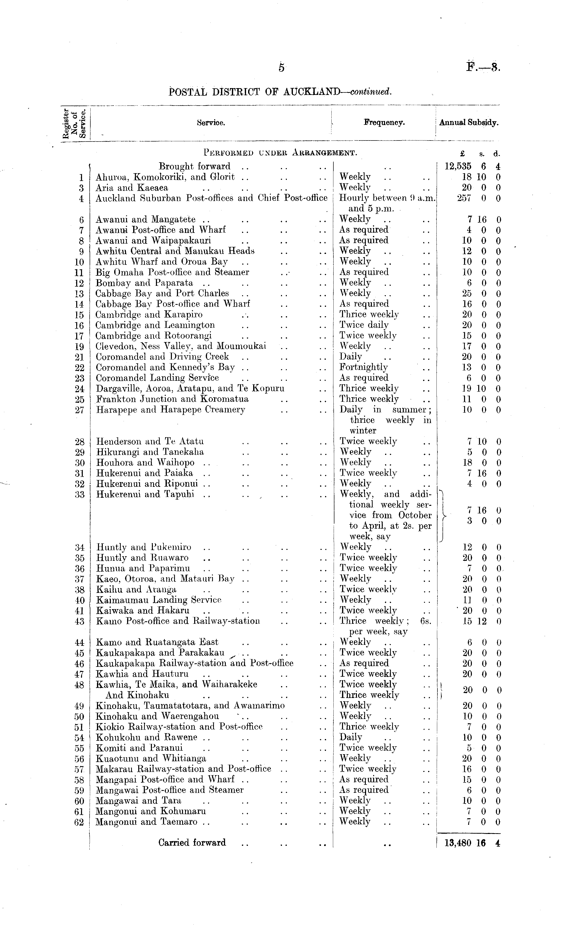 in UH 4> Servioe. Frequenoy. j Annual Subsidy. Performed under Arrange: [ENT. £ s. d. I 3 4 Brought forward Ahuroa, Koinokoriki, and Glorit Aria and Kaeaea Auckland Suburban Post-offices and Chief Post-office Weekly Weekly Hourly between 9 a.m. and 5 p.m. Weekly As required As required Weekly W'eekly As required Weekly Weekly As required Thrice weekly Twice daily Twice weekly Weeklv Daily Fortnightly As required Thrice weekly Thrice weekly Daily in summer; thrice weekly in winter Twice weekly Weekly Weekly Twice weekly Weekly Weekly, and additional weekly service from October to April, at 2s. per week, say Weekly Twice weekly Twice weekly Weekly Twice weekly Weekly Twice weekly Thrice weeklv ; 6s. per week, say Weekly Twice weekly As required Twice weekly Twice weekly Thrice weekly Weeklv Weekly Thrice weekly Daily Twice weekly Weekly Twice weekly As required As required Weekly Weekly Weekly 12,535 6 4 18 10 0 20 0 0 257 0 0 6 7 8 9 10 11 12 13 N 15 16 17 19 21 22 23 24 25 27 Awanui and Mangatete Awanui Post-office and Wharf Awanui and Waipapakauri Awhitu Central and Manukau Heads Awhitu Wharf and Oroua Bay Big Omaha Post-office and Steamer Bombay and Paparata Cabbage Bay and Port Charles Cabbage Bay Post-office and Wharf Cambridge and Karapiro Cambridge and Leamington Cambridge and Rotoorangi Clevedon, Ness Valley, and Moumoukai Coromandel and Driving Creek Coromandel and Kennedy's Bay Coromandel Landing Service Dargaville, Aoroa, Aratapu, and Te Kopuru Frankton J unction and Koroniatua Harapepe and Harapepe Creamery 7 16 0 4 0 0 10 0 0 12 0 0 10 0 0 10 0 0 6 0 0 25 0 0 16 0 0 20 0 0 20 0 0 15 0 0 17 0 0 20 0 0 13 0 0 6 0 0 19 10 0 11 0 0 10 0 0 28 29 30 31 32 33 Henderson and Te Atatu Hikurangi and Tanekaha Houhora and Waihopo Hukerenui and Paiaka Hukerenui and Riponui Hukerenui and Tapuhi 7 .10 0 5 0 0 18 0 0 7 16 0 4 0 0 ■> 7 .16 0 3 0 0 34 35 36 37 38 10 H 43 Huntly and Pukemiro .. .. Huntly and Ruawaro Hunua and Paparimu Kaeo, Otoroa, and. Matauri Bay Kaihu and Aranga Kaimaumau Landing Service Kaiwaka and Hakaru Kamo Post-office and Railway-station 12 0 0 20 0 0 7 0 0 20 0 0 20 0 0 LI 0 0 ' 20 0 0 15 12 0 11: 15 16 17 48 L-9 50 51 54 55 56 57 58 59 60 61 62 Kamo and Ruatangata East Kaukapakapa and Parakakau . . Kaukapakapa Railway-station and Post-office Kawhia and Hauturu Kawhia, Te Maika, and Waiharakeke And Kinohaku Kinohaku, Taumatatotara, and Awamarimo Kinohaku and Waerengahou Kiokio Railway-station and Post-office Kohukohu and Rawene Komiti and Paranui Kuaotunu and Whitianga Makarau Railway-station and Post-office Mangapai Post-office and Wharf Mangawai Post-office and Steamer Mangawai and Tara Mangonui and Kohumaru Mangonui and Taemaro 6 0 0 20 0 0 20 0 0 20 0 0 20 0 0 20 0 0 10 0 0 7 0 0 10 0 0 5 0 0 20 0 0 16 0 0 15 0 0 6 0 0 10 0 0 7 0 0 7 0 0 Carried forward 13,480 16 4: