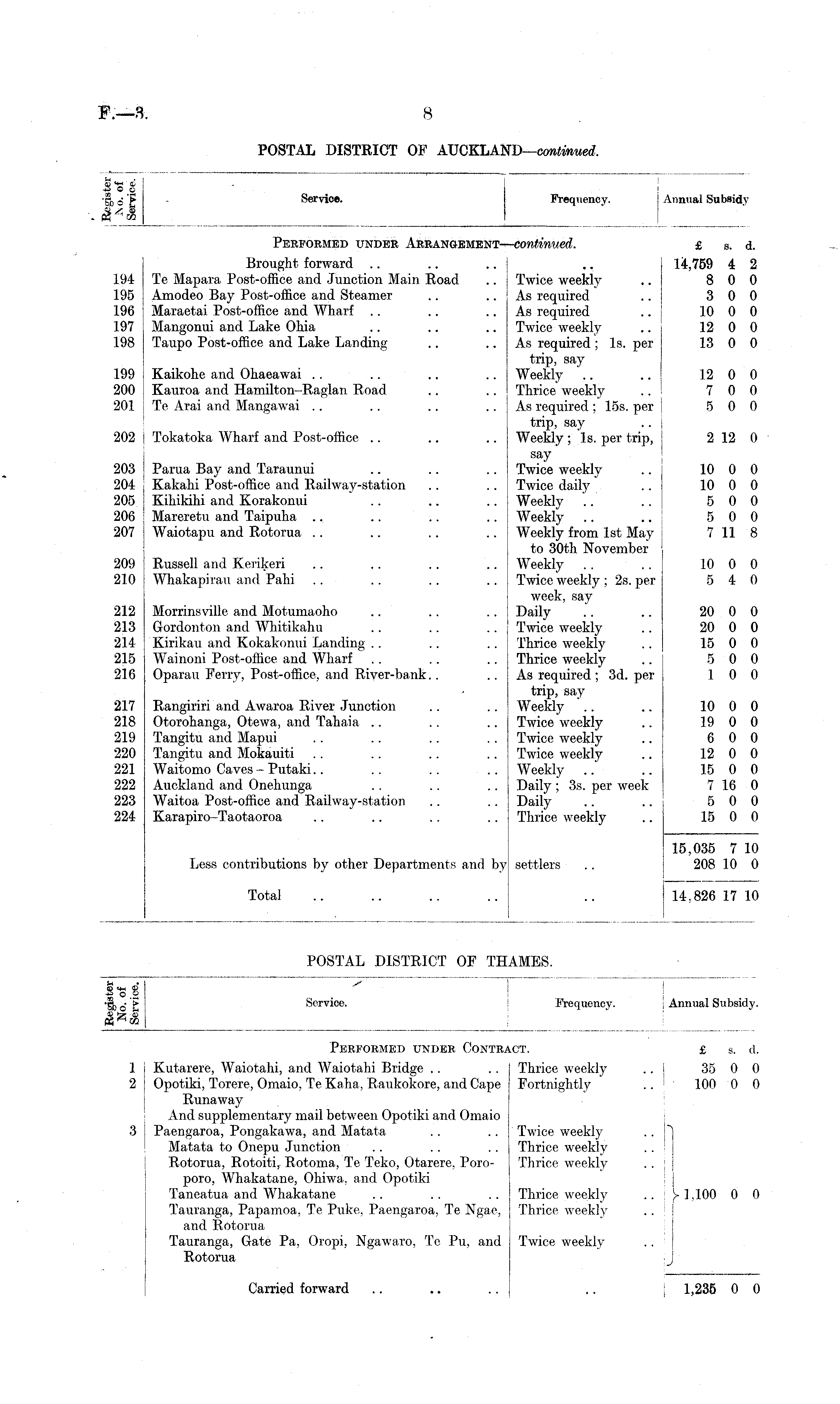 ■i>o'E Service. Frequency. \ Annual Subsidy. Performed under Contract. £ s. d. 1 2 Kutarere, Waiotahi, and Waiotahi Bridge .. . . Thrice weekly Opotiki, Torere, Omaio, Te Kaha, Raukokore, and Cape Fortnightly Runaway And supplementary mail between Opotiki and Omaio Paengaroa, Pongakawa, and Matata . . .. Twice weekly Matata to Onepu Junction .. .. . . Thrice weekly Rotorua, Rotoiti, Rotoma, Te Teko, Otarere, Poro- Thrice weekly poro, Whakatane, Ohiwa, and Opotiki Taneatua and Whakatane .. . . .. Thrice weekly Tauranga, Papamoa, Te Puke, Paengaroa, Te Ngae, Thrice weekly and Rotorua Tauranga, Gate Pa, Oropi, Ngawaro, Te Pu, and Twice weekly Rotorua .. j 35 0 0 .. ! 100 0 0 h .. j \ 1,100 0 0 Carried forward 1,235 0 0 I 1,235 0 0