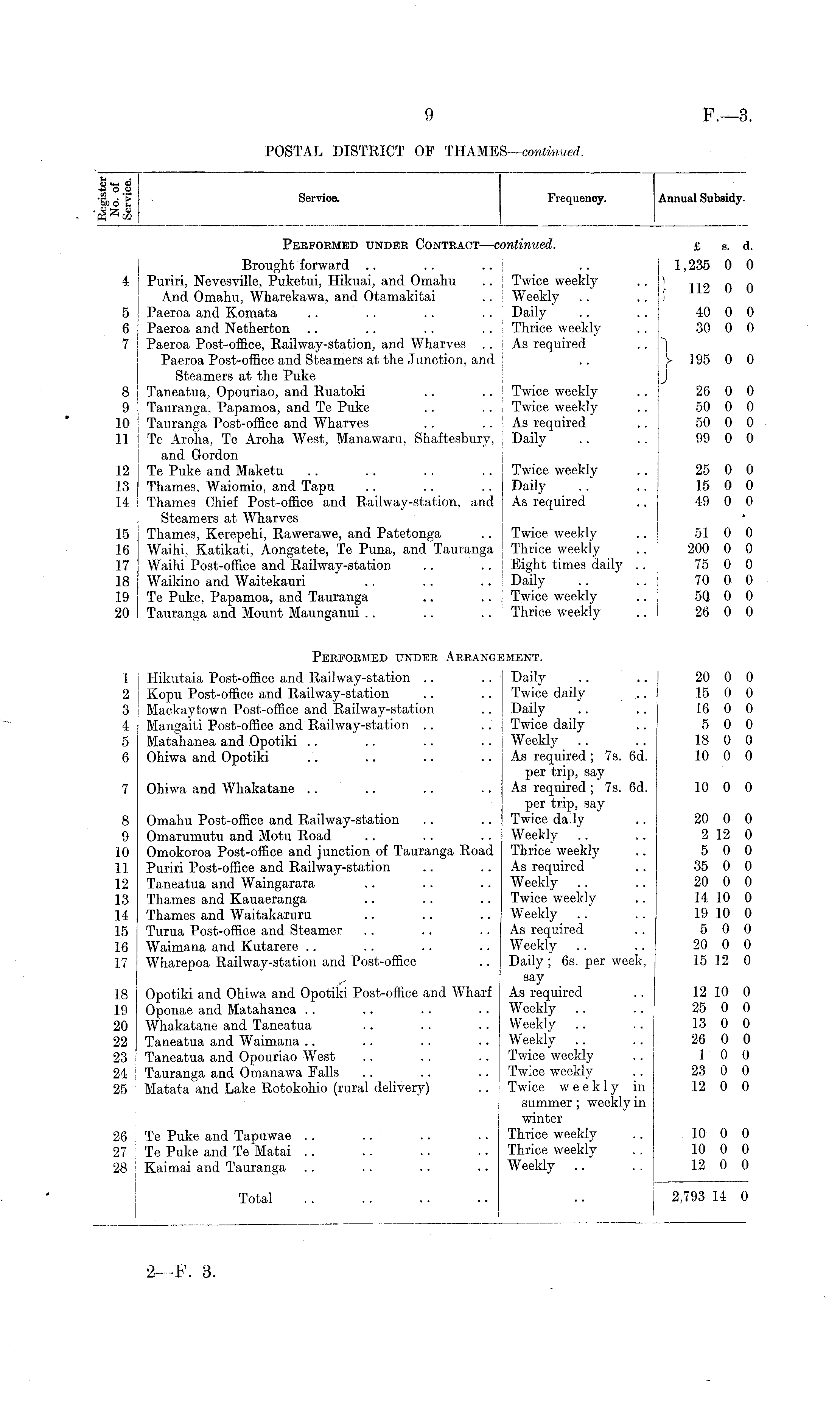 03 *t-t 03 m •— '5b 6 Z 03 ry 03 Service. Frequency. Annual Subsidy. Peefobmed undee Conteact —a mtinued. £ s. d. Brought forward Puriri, Nevesville, Puketui, Hikuai, and Omahu And Omahu, Wharekawa, and Otamakitai Paeroa and Komata Paeroa and Netherton Paeroa Post-office, Railway-station, and Wharves Paeroa Post-office and Steamers at the Junction, and Steamers at the Puke Taneatua, Opouriao, and Ruatoki Tauranga, Papamoa, and Te Puke Tauranga Post-office and Wharves Te Aroha, Te Aroha West, Manawaru, Shaftesbury, and Gordon Te Puke and Maketu Thames. Waiomio, and Tapu Thames Chief Post-office and Railway-station, and Steamers at Wharves Thames, Kerepehi, Rawerawe, and Patetonga Waihi, Katikati, Aongatete, Te Puna, and Tauranga Waihi Post-office and Railway-station Waikino and Waitekauri Te Puke, Papamoa, and Tauranga Tauranga and Mount Maunganui Twice weekly Weekly Daily Thrice weekly As required 1,235 0 0 4 | 112 0 0 5 6 7 40 0 0 30 0 0 1 y 195 0 0 J 8 9 10 11 Twice weekly Twice weekly As required Daily 26 0 0 50 0 0 50 0 0 99 0 0 12 13 14 Twice weekly Daily As required 25 0 0 15 0 0 49 0 0 15 16 17 .18 19 20 Twice weekly Thrice weekly Eight times daily .. Daily Twice weekly Thrice weekly 51 0 0 200 0 0 75 0 0 70 0 0 50 0 0 26 0 0 1 2 3 4 5 6 Peefobmed undee Aerangi IMENT. 20 0 0 15 0 0 16 0 0 5 0 0 18 0 0 10 0 0 7 8 9 10 11 12 13 14 15 If, 17 Hikutaia Post-office and Railway-station Kopu Post-office and Railway-station Mackaytown Post-office and Railway-station Mangaiti Post-office and Railway-station Matahanea and Opotiki Ohiwa and Opotiki Ohiwa and Whakatane Omahu Post-office and Railway-station Omarumutu and Motu Road Omokoroa Post-office and junction of Tauranga Road Puriri Post-office and Railway-station Taneatua and Waingarara Thames and Kauaeranga Thames and Waitakaruru Turua Post-office and Steamer Waimana and Kutarere Wharepoa Railway-station and Post-office Daily Twice daily Daily Twice daily Weekly As required ; 7s. 6d. per trip, say As required ; 7s. 6d. per trip, say Twice daly Weekly Thrice weekly As required Weekly Twice weekly Weekly As required Weekly Daily ; 6s. per week, say As required Weekly Weekly Weekly Twice weekly Twice weekly Twice weekly in summer ; weekly in winter Thrice weekly Thrice weekly Weekly 10 0 0 20 0 0 2 12 0 5 0 0 35 0 0 20 0 0 14 10 0 19 10 0 5 0 0 20 0 0 15 12 0 18 19 20 22 23 24 25 Opotiki and Ohiwa and Opotiki Post-office and Wharf Oponae and Matahanea Whakatane and Taneatua Taneatua and Waimana Taneatua and Opouriao West Tauranga and Omanawa Falls Matata and Lake Rotokohio (rural delivery) 12 10 0 25 0 0 13 0 0 26 0 0 1 0 0 23 0 0 12 0 0 26 27 28 Te Puke and Tapuwae Te Puke and Te Matai Kaimai and Tauranga 10 0 0 10 0 0 12 0 0 Total 2,793 14 0