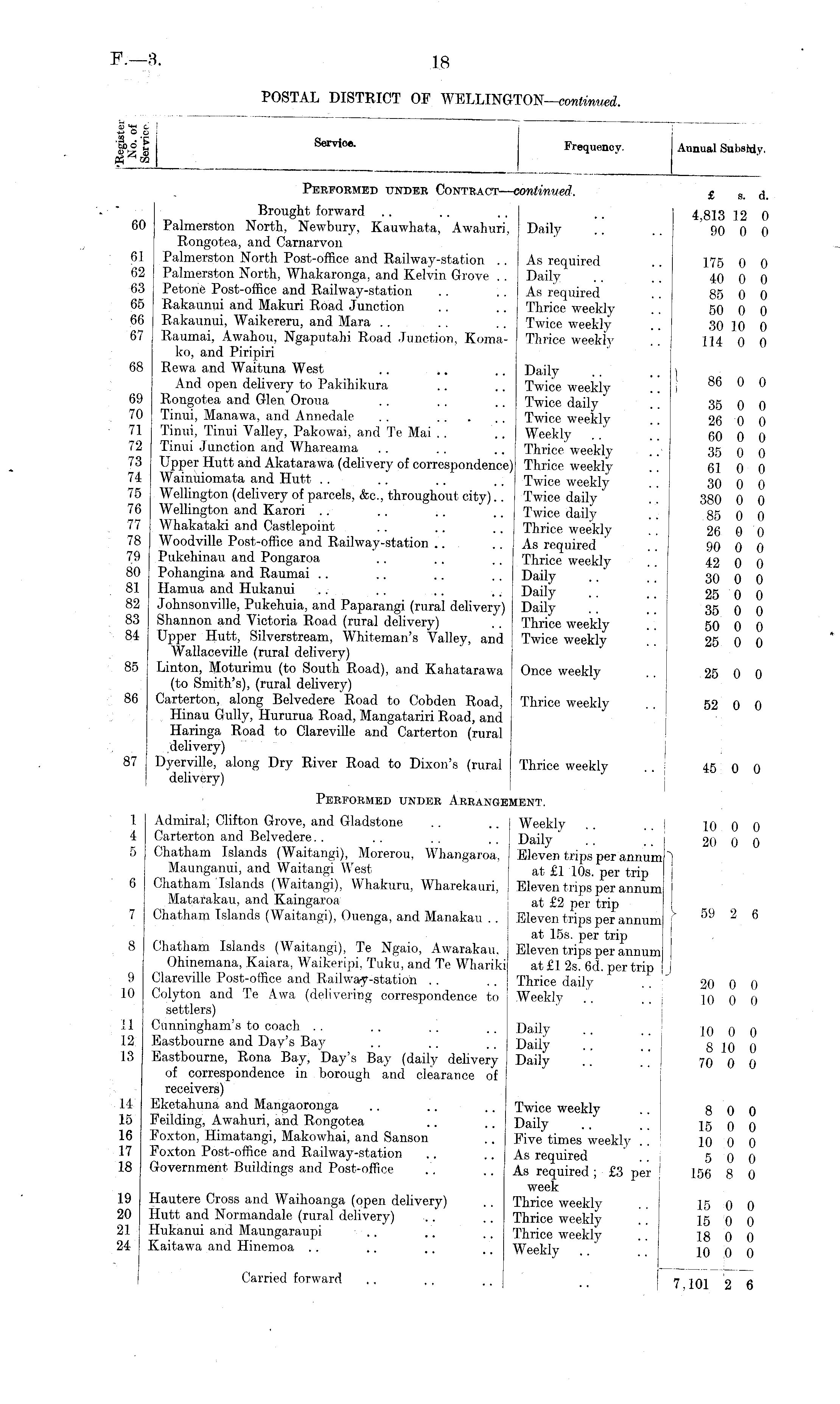 03 t* C I *J O c i 'Sod £ .2 2; 8 Service. Frequency. Annual Subsidy, Peefobmed undee Contbact—i -continued. £ s. d. 60 61 62 63 65 66 67 68 69 70 71 72 73 74 75 76 77 78 79 80 81 82 83 84 Brought forward Palmerston North, Newbury, Kauwhata, Awahuri, Rongotea, and Carnarvon Palmerston North Post-office and Railway-station .. Palmerston North, Whakaronga, and Kelvin Grove . . Petone Post-office and Railway-station Rakaunui and Makuri Road Junction Rakaunui, Waikereru, and Mara Raumai, Awahou, Ngaputahi Road Junction. Komako, and Piripiri Rewa and Waituna West And open delivery to Pakihikura Rongotea and Glen Oroua Tinui, Manawa, and Annedale . . ... Tinui, Tinui Valley, Pakowai, and Te Mai Tinui Junction and Whareama Upper Hutt and Akatarawa (delivery of correspondence) Wainuiomata and Hutt Wellington (delivery of parcels, &c, throughout city).. Wellington and Karori .. W r hakataki and Castlepoint Woodville Post-office and Railway-station Pukehinau and Pongaroa Pohangina and Raumai Hamua and Hukanui Johnsonville, Pukehuia, and Paparangi (rural delivery) Shannon and Victoria Road (rural delivery) Upper Hutt, Silverstream, Whiteman's Valley, and Wallaceville (rural delivery) Linton, Moturimu (to South Road), and Kahatarawa (to Smith's), (rural delivery) Carterton, along Belvedere Road to Cobden Road, Hinau Gully, Hururua Road, Mangatariri Road, and Haringa Road to Clareville and Carterton (rural delivery) Dyerville, along Dry River Road to Dixon's (rural delivery) Daily As required Daily As required Thrice weekly Twice weekly Thrice weekly Daily Twice weekly Twice daily Twice weekly Weekly Thrice weekly ) Thrice weekly Twice weekly Twice daily Twice daily Thrice weekly As required Thrice weekly Daily Daily Daily Thrice weekly Twice weekly 4,813 12 0 90 0 0 175 0 0 40 0 0 85 0 0 50 0 0 30 10 0 114 0 0 86 0 0 35 0 0 26 0 0 60 0 0 35 0 0 61 0 0 30 0 0 380 0 0 85 0 0 26 0 0 90 0 0 42 0 0 30 0 0 25 0 0 35 0 0 50 0 0 25 0 0 85 Once weekly 25 0 0 86 Thrice weekly 52 0 0 87 Thrice weekly 45 0 0 Peefobmed under Arrangen MENT. 1 4 5 6 Admiral; Clifton Grove, and Gladstone .. [ Carterton and Belvedere. . . . ., Chatham Islands (Waitangi), Morerou, Whangaroa, j Maunganui, and Waitangi West Chatham Islands (Waitangi), Whakuru, Wharekauri, I Matarakau, and Kaingaroa Chatham Islands (Waitangi), Ouenga, and Manakau . . Weekly Daily Eleven trips per annum at £1 10s. per trip Eleven trips per annum at £2 per trip Eleven trips per annum at 15s. per trip Eleven trips per annum at£l 2s. 6d. per trip Thrice dailyWeekly .'. 10 0 0 20 0 0 i . y 59 2 6 7 1 I 8 Chatham Islands (W r aitangi), Te Ngaio, Awarakau, Ohinemana, Kaiara, W r aikeripi, Tuku, and Te Whariki Clareville Post-office and Railway-station Colyton and Te Awa (delivering correspondence to settlers) Cunningham's to coach Eastbourne and Day's Bay Eastbourne, Rona Bay, Day's Bay (daily delivery of correspondence in borough and clearance of receivers) Eketahuna and Mangaoronga Feilding, Awahuri, and Rongotea Foxton, Himatangi, Makowhai, and Sanson Foxton Post-office and Railway-station Government Buildings and Post-office i | 9 10 J 20 0 0 10 0 0 II 12 13 Daily DailyDaily 10 0 0 8 10 0 70 0 0 14 15 16 17 1.8 Twice weekly Daily Five times weekly . . As required As required ; £3 per week Thrice weekly Thrice weekly Thrice weekly W T eekly 8 0 0 15 0 0 10 0 0 5 0 0 156 8 0 19 20 21 24 Hautere Cross and Waihoanga (open delivery) .. ' Hutt and Normandale (rural delivery) ... .. ' Hukanui and Maungaraupi .. .. ' Kaitawa and Hinemoa . . .. .. 15 0 0 15 0 0 18 0 0 10 0 0 Carried forward 7,101 2 6