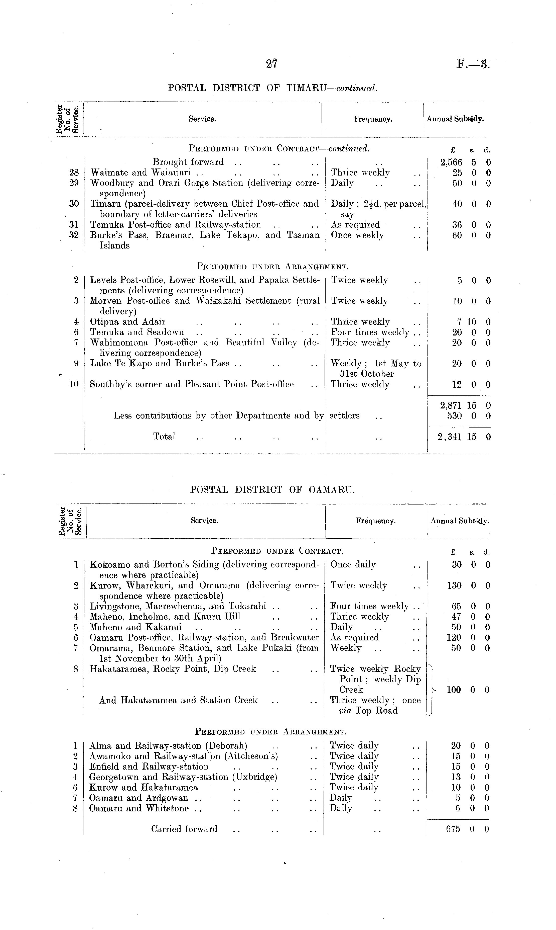 © q5 +a © O MO J Service. Frequency. Annual Subsidy. Performed under Conti ;ACT. £ s. d. 1 2 3 4 5 6 7 Kokoamo and Borton's Siding (delivering correspondence where practicable) Kurow, Wharekuri, and Omarama (delivering correspondence where practicable) Livingstone, Maerewhenua, and Tokarahi Maheno, Incholme, and Kauru Hill Maheno and Kakanui Oamaru Post-office, Railway-station, and Breakwater Omarama, Benmore Station, and Lake Pukaki (from 1st November to 30th April) Hakataramea, Rocky Point, Dip Creek Once daily Twice weekly Four times weekly .. Thrice weekly Daily As required Weekly 30 130 65 47 50 120 50 0 0 0 0 0 0 0 0 0 0 0 0 0 0 8 Twice weekly Rocky Point; weekly Dip Creek Thrice weekly ; once via Top Road And Hakataramea and Station Creek I 100 0 0 Performed under Arrange: J 4ENT. 20 15 15 13 10 5 5 0 0 0 0 0 0 0 0 0 0 0 0 0 0 I 2 3 -1. 6 7 8 Alma and Railway-station (Deborah) Awamoko and Railway-station (Aitcheson's) Enfield and Railway-station Georgetown and Railway-station (Uxbridge) Kurow and Hakataramea Oamaru and Ardgowan Oamaru and Whitstone Twice daily Twice daily Twice daily Twice daily Twice daily Daily Daily Carried forward 675 0 0 V