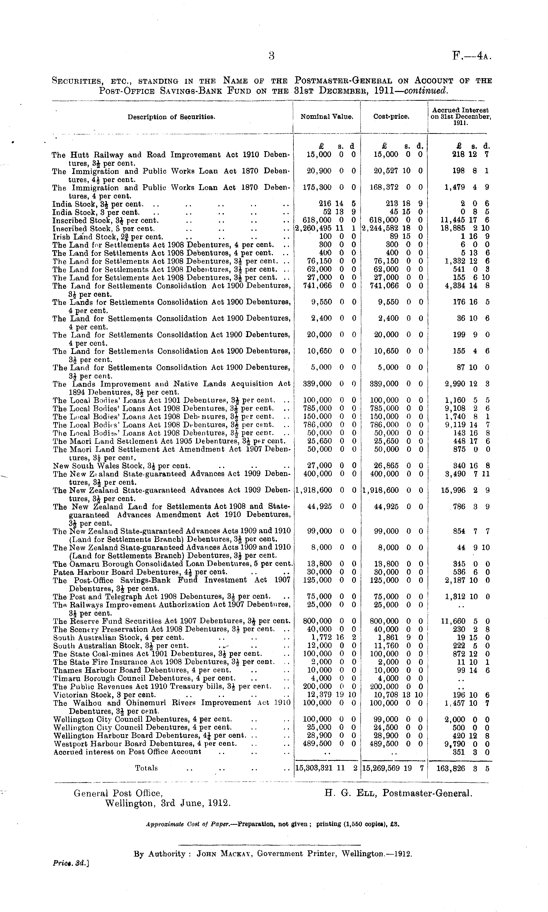 Cost-price. Accrued Interest on Slst December, 1911. Description of Securities. j Nominal Value. The Hutt Railway and Road Improvement Act 1910 Debentures, 3$ per cent. The Immigration and Public Works Loan Act 1870 Debentures, 4J per oent. The Immigration and Public Works Loan Act 1870 Debentures, 4 per oent. India Stock, 3J per oent. India Stock, 3 per oent. Inscribed Stock, 3J per oent. Inscribed Stock, S per oent. Irish Land Stock, 2| per cent. The Land for Settlements Act 1908 Debentures, 4 per cent. .. The Land for Settlements Act 1908 Debentures, 4 per oent. .. The Land for Settlements Act 1908 Debentures, 3J per oent. .. The Land for Settlements Act 1908 Debentures, 3J per cent. .. The Land for Settlements Act 1908 Debentures, 3| per oent. .. The Land for Settlements Consolidation Aot 1900 Debentures, 3£ per oent. The Lands for Settlements Consolidation Aot 1900 Debentures, 4 per cent. The Land for Settlements Consolidation Aot 1900 Debentures, 4 per cent. The Land for Settlements Consolidation Act 1900 Debentures, 4 per cent. The Land for Settlements Consolidation Aot 1900 Debentures, 3J per cent. The Land for Settlements Consolidation Aot 1900 Debentures, 3J per cent. The Lands Improvement and Native Lands Acquisition Act 1894 Debentures, 3£ per cent. The Local Boriies' Loans Act 1901 Debentures, 3$ per cent. .. The Local Bodies' Loans Act 1908 Debentures, 3J per cent. .. The Local Bodies' Loans Act 1908 Debentures, 3| per cent. .. The Local Bodies' Loans Act 1908 Debentures, 3| per oent. The Local Bodieti' Loans Act 1908 Debentures, 3$ per cent. The Maori Land Settlement Aot 1905 Debentures, 3J per cent. The Maori Land Settlement Act Amendment Act 1907 Debentures, 3£ per oent. New South Wales Stock, 3J per cent. The New Zealand State-guaranteed Advances Act 1909 Debentures, 3iJ per oent. The New Zealand State-guaranteed Advances Act 1909 Debentures, 3J per oent. The New Zealand Land for Settlements Act 1908 and Stateguaranteed Advances Amendment Aot 1910 Debentures, 3J per oent. The New Zealand State-guaranteed Advances Acts 1909 and 1910 (Land for Settlements Branch) Debentures, 3J per cent. The New Zealand State-guaranteed Advances Acts 1909 and 1910 (Land for Settlements Branch) Debentures, 3J per oent. The Oamaru Borough Consolidated Loan Debentures, 5 per cent. Patea Harbour Board Debentures, 4J per oent. The Post-Office Savings-Bank Fund Investment Aot 1907 Debentures, 3J per cent. The Post and Telegraph Act 1908 Debentures, 3J per cent. The Railways Improvement Authorization Act 1907 Debentures, 3J per cent. The Reserve Fund Securities Aot 1907 Debentures, 3J per cent. The Scenery Preservation Aot 1908 Debentures, 3£ per cent. .. South Australian Stock, 4 per cent. South Australian Stock, 3| per oent. Tbe State Coal-mines Aot 1901 Debentures, 3J per oent. The State Fire Insurance Act 1908 Debentures, 3£ per cent. .. Thames Harbour Board Debentures, 4 per cent. Timarn Borough Council Debentures, 4 per cent. The Public Revenues Act 1910 Treasury bills, 3£ per cent. Victorian Stock, 3 per cent. The Waihou and Ohinemuri Rivers Improvement Act 1910 Debentures, 3J per cent. Wellington City Council Debentures, 4 per oent. Wellington City Council Debentures, 4 per cent. Wellington Harbour Board Debentures, 4J per cent. Westport Harbour Board Debentures, 4 per cent. Accrued interest on Post Office Account £ a. d 15,000 0 0 £ a. d. 15,000 0 0 £ s. d. 218 12 7 20,900 0 0 20,527 10 0 198 8 1 175,300 0 0 168,372 0 0 1,479 4 9 216 14 5 52 13 9 618,000 0 0 2,260,495 11 1 100 0 0 300 0 0 400 0 0 76,150 0 0 62,000 0 0 27,000 0 0 741,066 0 0 213 18 9 45 16 0 618,000 0 0 2,244,582 18 0 89 15 0 300 0 0 400 0 0 76,150 0 0 62,000 0 0 27,000 0 0 741,066 0 0 2 0 6 0 8 5 11,445 17 6 18,885 2 10 1 16 9 6 0 0 5 13 6 1,332 12 6 541 0 3 155 6 10 4,334 14 8 9,550 0 0 9,550 0 0 176 16 5 2,400 0 0 2,400 0 0 36 10 6 20,000 0 0 20,000 0 0 199 9 0 10,650 0 0 10,650 0 0 155 4 6 5,000 0 0 5,000 0 0 87 10 0 339,000 0 0 339,000 0 0 2,990 12 3 100,000 0 0 j 785,000 0 0 ' 150.000 0 0 ] 786,000 0 0 50,000 0 0 25,650 0 0 50,000 0 0 100,000 0 0 785,000 0 0 150,000 0 0 786,000 0 0 50,000 0 0 25,650 0 0 50,000 0 0 1,160 5 5 9,108 2 6 1,740 8 1 9.119 14 7 143 16 8 448 17 6 875 0 0 27,000 0 0 400,000 0 0 26,865 0 0 400,000 0 0 340 16 8 3,490 7 11 1,918,600 0 0 1,918,600 0 0 15,996 2 9 44,925 0 0 44,925 0 0 786 3 9 99,000 0 0 99,000 0 0 854 7 7 8,000 0 0 8,000 0 0 44 9 10 13,800 0 0 30,000 0 0 125,000 0 0 13,800 0 0 30,000 0 0 125,000 0 0 345 0 0 536 6 0 2,187 10 0 75,000 0 0 25,000 0 0 75,000 0 0 25,000 0 0 1,312 10 0 800,000 0 0 40,000 0 0 1,772 16 2 12,000 0 0 100,000 0 0 2,000 0 0 10,000 0 0 4,000 0 0 200,000 0 0 12,379 19 10 100,000 0 0 800,000 0 0 40,000 0 0 1,861 9 0 11,760 0 0 100,000 0 0 2,000 0 0 10,000 0 0 4,000 0 0 200,000 0 0 10,708 13 10 100,000 0 0 11,660 5 0 230 2 8 19 15 0 222 5 0 872 12 0 11 10 1 99 14 6 196 10 6 1,457 10 7 100,000 0 0 25,000 0 0 28,900 0 0 489,500 0 0 99,000 0 0 24,500 0 0 28,900 0 0 489,500 0 0 2,000 0 0 500 0 0 420 12 8 9,790 0 0 351 3 0 Totals 15,303,321 11 2 115,269,569 19 7 163,826 3 5