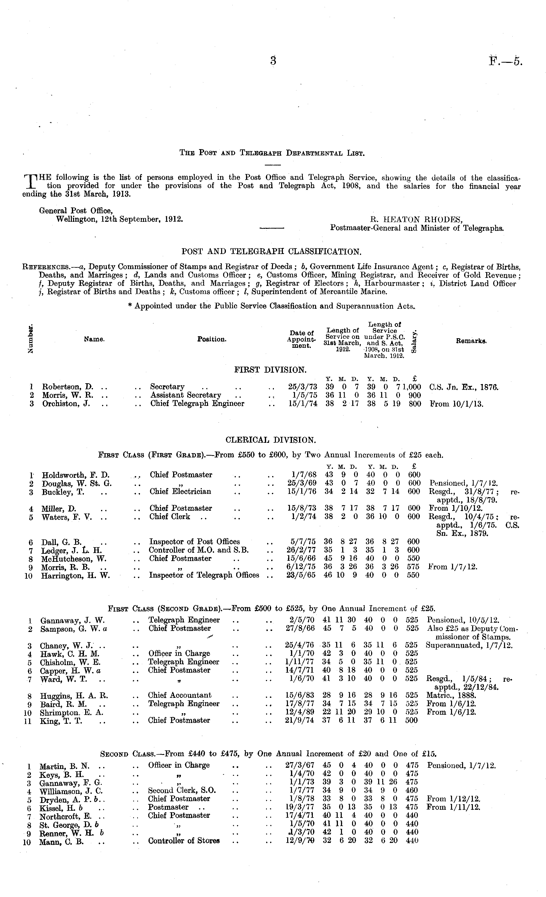 The Post and Telegraph Departmental List. T~IHE following is the list of persons employed in the Post Office and Telegraph Service, showing the details ot the classifica_L tion provided for under the provisions of the Post and Telegraph Act, 1908, and the salaries for the financial year ending the 31st March, 1913. General Post Office, Wellington, 12th September, 1912. R. HEATON RHODES, Postmaster-General and Minister of Telegraphs.