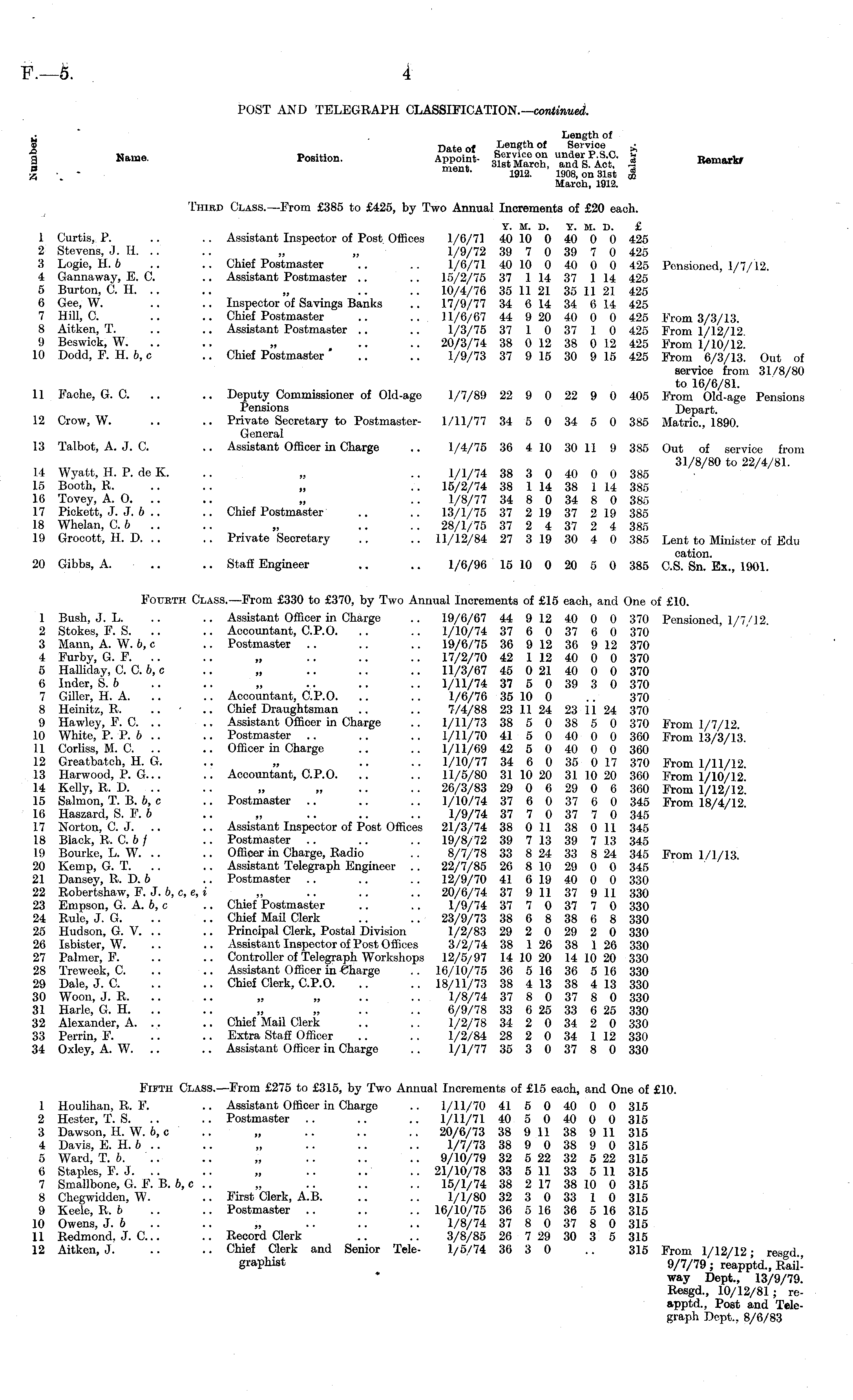 j . Length of S Date of Length of Service £ 1 Name - Positi ° n - TenT- 3*™?, WiS? 3 Bemarkr g • - ment ' 1912. 1908, on 31st $ March, 1912. Third Class.—From £385 to £425, by Two Annual Increments of £20 each. y. m. D. y. m. D. £ 1 Curtis, P. .. .. Assistant Inspector of Post Offices 1/6/71 40 10 0 40 0 0 425 2 Stevens, J. H. .. .. „ „ 1/9/72 39 7 0 39 7 0 425 3 Logic, H. 6 .. .. Chief Postmaster .. .. 1/6/71 40 10 0 40 0 0 425 Pensioned, 1/7/12. 4 Gannaway, E. C. .. Assistant Postmaster .. .. 15/2/75 37 1 14 37 114 425 5 Burton, CH. .. .. „ .. .. 10/4/76 35 11 21 35 11 21 425 6 Gee, W. .. .. Inspector of Savings Banks .. 17/9/77 34 614 34 614 425 7 Hill, C. .. .. Chief Postmaster .. .. 11/6/67 44 920 40 0 0 425 From 3/3/13. 8 Aitken, T. .. .. Assistant Postmaster .. .. 1/3/75 37 1 0 37 1 0 425 From 1/12/12 9 Beswick, W. .. .. „ .. .. 20/3/74 38 012 38 012 425 From 1/10/12. 10 Dodd, F. H. 6, c .. Chief Postmaster ' .. .. 1/9/73 37 91530 9 15 425 From 6/3/13. Out of service from 31/8/80 to 16/6/81. 11 Fache, G. C .. .. Deputy Commissioner of Old-age 1/7/89 22 9 0 22 9 0 405 From Old-age Pensions Pensions Depart. 12 Crow, W. .. .. Private Secretary to Postmaster- 1/11/77 34 5 0 34 5 0 385 Matric, 1890. General 13 Talbot, A. J. C. .. Assistant Officer in Charge .. 1/4/75 36 4 10 30 11 9 385 Out of service from 31/8/80 to 22/4/81. 14 Wyatt, H. P. de K. „ .. 1/1/74 38 3 0 40 0 0 385 15 Booth, R. .. .. „ .. 15/2/74 38 114 38 114 385 16 Tovey, A. O. .. .. „ .. 1/8/77 34 8 0 34 8 0 385 17 Pickett, J. J. 6 .. .. Chief Postmaster .. .. 13/1/75 37 219 37 219 385 18 Whelan, C. b .. .. „ .. .. 28/1/75 37 2 4 37 2 4 385 19 Grocott, H. D. .. .. Private Secretary .. .. 11/12/84 27 3 19 30 4 0 385 Lent to Minister of Edu cation. 20 Gibbs, A. .. .. Staff Engineer .. .. 1/6/96 15 10 0 20 5 0 385 CS. Sn. Ex., 1901. Fourth Class.—From £330 to £370, by Two Annual Increments of £15 each, and One of £10. 1 Bush, J. L. .. .. Assistant Officer in Charge .. 19/6/67 44 91240 0 0 370 Pensioned 1/7/12 2 Stokes, F. S. .. .. Accountant, C.P.O. .. .. 1/10/74 37 6 0 37 6 0 370 3 Mann, A. W. b, c .. Postmaster .. .. .. 19/6/75 36 912 36 912 370 4 Furby, G. F. .. .. „ .. .. .. 17/2/70 42 112 40 0 0 370 5 Halliday, CC.b, c .. „ .. .. .. 11/3/67 45 021 40 0 0 370 6 Inder, S. 6 .. .. „ .. .. .. 1/11/74 37 5 0 39 3 0 370 7 Giller, H. A. .. .. Accountant, C.P.O. .. .. 1/6/76 35 10 0 .. 370 8 Heinitz, R. .. .. Chief Draughtsman .. .. 7/4/88 23 11 24 23 11 24 370 9 Hawley, F. C. .. .. Assistant Officer in Charge .. 1/11/73 38 5 0 38 5 0 370 From 1/7/12. 10 White, P. P. b.. .. Postmaster .. .. .. 1/11/70 41 5040 0 0 360 From 13/3/13 11 Corliss, M. C. .. .. Officer in Charge .. .. 1/11/69 42 5 0 40 0 0 360 12 Greatbatch, H. G. .. „ .. .. 1/10/77 34 6 0 35 017 370 From 1/11/12. 13 Harwood, P. G... .. Accountant, C.P.O. .. .. 11/5/80 3110 20 3110 20 360 From 1/10/12 14 Kelly, R. D. .. .. „ „ .. .. 26/3/83 29 0 629 0 6 360 From 1/12/12. 15 Salmon, T. B. 6, c .. Postmaster .. .. .. 1/10/74 37 6 0 37 6 0 345 From 18/4/12 16 Haszard, S. F. b .. „ .. .. .. 1/9/74 37 7 0 37 7 0 345 17 Norton, CJ. .. .. Assistant Inspector of Post Offices 21/3/74 38 011 38 011 345 18 Black, R. C 6 / .. Postmaster .. .. .. 19/8/72 39 713 39 713 345 19 Bourke, L. W. .. .. Officer in Charge, Radio .. 8/7/78 33 824 33 824 345 From 1/1/13. 20 Kemp, G. T. .. .. Assistant Telegraph Engineer .. 22/7/85 26 810 29 0 0 345 21 Dansey, R. D. b .. Postmaster .. .. .. 12/9/70 41 619 40 0 0 330 22 Robertshaw, F. J. b, c, c, i „ .. .. .. 20/6/74 37 9 11 37 9 11 330 23 Empson, G. A. 6, c .. Chief Postmaster .. .. 1/9/74 37 7 0 37 7 0 330 24 Rule, J. G. .. .. Chief MaU Clerk .. .. 23/9/73 38 6 8 38 6 8 330 25 Hudson, G. V. .. .. Principal Clerk, Postal Division 1/2/83 29 2 0 29 2 0 330 26 Isbister, W. .. .. Assistant Inspector of Post Offices 3/2/74 38 126 38 126 330 27 Palmer, F. .. .. Controller of Telegraph Workshops 12/5/97 14 10 20 14 10 20 330 28 Treweek, C. .. .. Assistant Officer in Charge .. 16/10/75 36 516 36 516 330 29 Dale, J. C. .. .. Chief Clerk, C.P.O. .. .. 18/11/73 38 413 38 413 330 30 Woon, J. R. .. .. „ „ .. .. 1/8/74 37 8 0 37 8 0 330 31 Harle, G. H. .. .. „ „ .. .. 6/9/78 33 625 33 625 330 32 Alexander, A. .. .. Chief Mail Clerk .. .. 1/2/78 34 2 0 34 2 0 330 33 Perrin, F. .. .. Extra Staff Officer .. .. 1/2/84 28 2 0 34 112 330 34 Oxley, A. W. .. .. Assistant Officer in Charge .. 1/1/77 35 3 0 37 8 0 330 Fifth Class.—From £275 to £315, by Two Annual Increments of £15 each, and One of £10. 1 Houlihan, R. F. .. Assistant Officer in Charge .. 1/11/70 41 5 0 40 0 0 315 2 Hester, T. S. .. .. Postmaster .. .. .. 1/11/71 40 5 0 40 0 0 315 3 Dawson, H. W. 6, c .. „ .. .. .. 20/6/73 38 911 38 911 315 4 Davis, E. H. b .. .. „ .. .. .. 1/7/73 38 9 0 38 9 0 315 5 Ward, T. 6. '.. .. „ .. .. .. 9/10/79 32 522 32 522 315 6 Staples, F. J. .. .. „ .. .. .. 21/10/78 33 511 33 511 315 7 Smallbone, G. F. B. 6, c.. „ .. .. .. 15/1/74 38 217 38 10 0 315 8 Chegwidden, W. .. First Clerk, A.B. .. .. 1/1/80 32 3 0 33 1 0 315 9 Keele, R. 6 .. .. Postmaster .. .. .. 16/10/75 36 516 36 516 315 10 Owens, J. 6 .. .. „ .. .. .. 1/8/74 37 8 0 37 8 0 315 11 Redmond, J. C.. .. Record Clerk .. .. 3/8/85 26 729 30 3 5 315 12 Aitken, J. .. .. Chief Clerk and Senior Tele- 1/5/74 36 3 0 .. 315 From 1/12/12; resgd graphist 9/7/79; reapptd., Rail' way Dept., 13/9/79. Resgd., 10/12/81 ; reapptd., Post and Telegraph Dept., 8/6/83