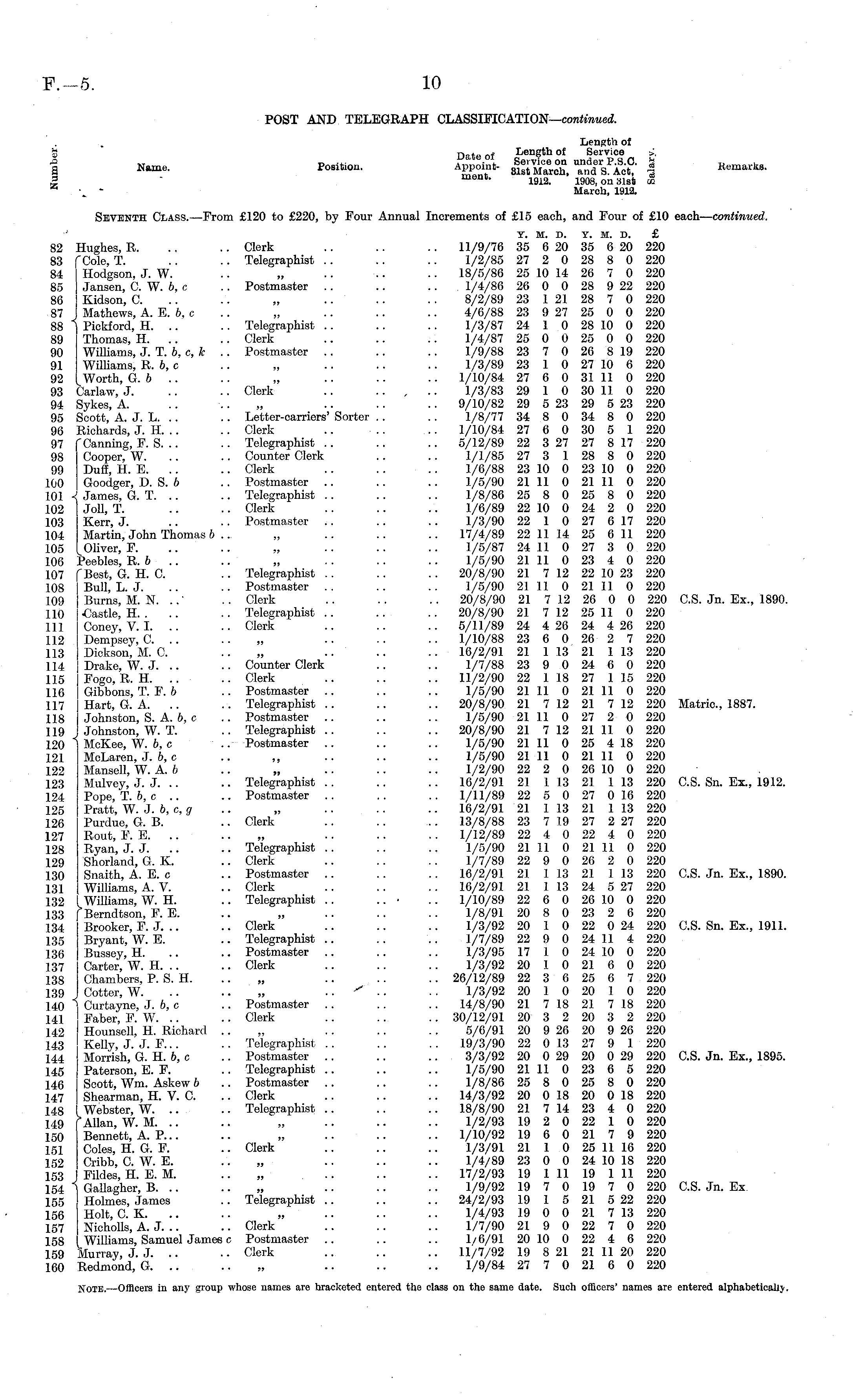 POST AND TELEGRAPH CLASSIFICATION—continued. Length of 8 Date of Length of Service >. 3 Name. Position. Appoint. Bgrgjo. undergo. | KemarkB . 3 meat. m2 _ 1908, on 31st 02 * •_ - March, 1912. Seventh Class.—From £120 to £220, by Four Annual Increments of £15 each, and Four of £10 each— continued. Y. M. D. Y. m. d. £ 82 Hughes, R. .. .. Clerk .. .. .. 11/9/76 35 620 35 620 220 83 f Cole, T. .. .. Telegraphist .. .. .. 1/2/85 27 2 0 28 8 0 220 84 Hodgson, J. W. .. „ .. .. .. 18/5/86 25 10 14 26 7 0 220 85 Jansen, CW. ft, c .. Postmaster .. .. ... 1/4/86 26 0 0 28 922 220 86 Kidson, C. .. „ .. ' ■ ■ ■ ■ 8/2/89 23 121 28 7 0 220 87 J Mathews, A. E. ft, c .. „ .. .. .. 4/6/88 23 92725 0 0 220 88 ) Pickford, H. .. .. Telegraphist .. .. .. 1/3/87 24 1 0 28 10 0 220 89 Thomas, H. .. .. Clerk .. .. .. 1/4/87 25 0 0 25 0 0 220 90 Williams, J. T. ft, c, k .. Postmaster .. .. .. 1/9/88 23 7 0 26 819 220 91 Williams, R. ft, c .. „ .. .. .. 1/3/89 23 1 0 27 10 6 220 92 I Worth, G. 6 .. .. „ .. .. .. 1/10/84 27 6 0 31 11 0 220 93 Carlaw, J. .. .. Clerk .. .. , .. 1/3/83 29 1 0 30 11 0 220 94 Sykes, A. .. .. „ .. .. .. 9/10/82 29 523 29 523 220 95 Scott, A. J. L. .. .. Letter-carriers' Sorter .. .. 1/8/77 34 8 0 34 8 0 220 96 Richards, J. H. .. .. Clerk .. 1/10/84 27 6 0 30 5 1 220 97 f Canning, F. S. .. .. Telegraphist .. .. .. 5/12/89 22 327 27 817 220 98 Cooper, W. .. .. Counter Clerk .. .. 1/1/85 27 3 1 28 8 0 220 99 Duff, H. E. .. .. Clerk .. .. .. 1/6/88 23 10 0 23 10 0 220 100 Goodger, D. S. ft .. Postmaster .. .. .. 1/5/90 2111 0 21 11 0 220 101 -! James, G. T. .. .. Telegraphist . . .. .. 1/8/86 25 8 0 25 8 0 220 102 Joll, T. .. .. Clerk .. .. .. 1/6/89 22 10 0 24 2 0 220 103 Kerr, J. .. .. Postmaster .. .. .. 1/3/90 22 1 0 27 617 220 104 Martin, John Thomas b.. „ .. .. .. 17/4/89 22 1114 25 611 220 105 I Oliver, F. .. .. „ .. .. .. 1/5/87 24 11 027 3 0 220 106 Peebles, R. 6 .. .. „ .. .. .. 1/5/90 21 11 0 23 4 0 220 107 f Best, G. H. C .. Telegraphist .. .. .. 20/8/90 21 712 22 10 23 220 108 Bull, L. J. .. .. Postmaster .. .. .. 1/5/90 21 11 0 21 11 0 220 109 Burns, M. N. ..' .. Clerk .. .. .. 20/8/90 21 712 26 0 0 220 CS. Jn. Ex., 1890. 110 -Castle, H. ... .. Telegraphist .. .. .. 20/8/90 21 712 25 11 0 220 111 Coney, V. I. .. .. Clerk .. .. .. 5/11/89 24 426 24 426 220 112 Dempsey, C. .. „ .. ■ ■ •■ 1/10/88 23 6 0 26 2 7 220 113 Dickson, M. C .. .. .. .. 16/2/91 21 113 21 113 220 114 Drake, W. J. .. .. Counter Clerk .. .. 1/7/88 23 9 0 24 6 0 220 115 Fogo, R. H. .. .. Clerk .. .. .. 11/2/90 22 118 27 115 220 116 Gibbons, T. F. ft .. Postmaster .. .. .. 1/5/90 21 11 0 21 11 0 220 117 Hart, G. A. .. .. Telegraphist .. .. .. 20/8/90 21 712 21 712 220 Matric, 1887. 118 Johnston, S. A. 6, c .. Postmaster .. .. .. 1/5/90 21 11 0 27 2 0 220 119 , Johnston, W. T. .. Telegraphist .. .. .. 20/8/90 21 712 2111 0 220 120 I McKee, W. 6, c .. Postmaster .. .. .. 1/5/90 21 11 0254 18 220 121 McLaren, J. ft, c .. ~ .. .. .. 1/5/90 2111 0 2111 0 220 122 Mansell, W. A. ft .. „ .. .. .. 1/2/90 22 2 0 26 10 0 220 123 Mulvey, J. J. .. .. Telegraphist .. .. .. 16/2/91 21 113 21 113 220 CS. Sn. Ex, 1912. 124 Pope, T. 6, c .. .. Postmaster .. .. .. 1/11/89 22 5 0 27 016 220 125 Pratt, W. J. ft, c, g .. „ .. .. .. 16/2/91 21 113 21 113 220 126 Purdue, G. B. .. Clerk .. .. .. 13/8/88 23 719 27 227 220 127 Rout, F. E. .. .. „ .. .. .. 1/12/89 22 4 0 22 4 0 220 128 Ryan, J. J. .. .. Telegraphist .. .. .. 1/5/90 21 11 0 21 11 0 220 129 Shorland, G. K. .. Clerk .. .. .. 1/7/89 22 9 0 26 2 0 220 130 Snaith, A. E. c .. Postmaster .. .. .. 16/2/91 21 113 21 113 220 CS. Jn. Ex., 1890. 131 Williams, A. V. .. Clerk .. .. .. 16/2/91 21 113 24 527 220 132 I Williams, W. H. .. Telegraphist .. .. ■ .. 1/10/89 22 6 0 26 10 0 220 133 f Berndtson, F. E. .. „ .. .. .. 1/8/91 20 8 0 23 2 6 220 134 Brooker, F. J. .. .. Clerk .. .. .. 1/3/92 20 1 0 22 024 220 CS. Sn. Ex., 1911. 135 Bryant, W. E. .. Telegraphist .. .. .. 1/7/89 22 9 0 24 11 4 220 136 Bussey, H. .. .. Postmaster .. .. .. 1/3/95 17 1 0 24 10 0 220 137 Carter, W. H. .. .. Clerk .. .. .. 1/3/92 20 1 0 21 6 0 220 138 Chambers, P. S. H. .. „ .. .. .. 26/12/89 22 3 6 25 6 7 220 139 j Cotter, W ' „ .. '■ . .. 1/3/92 20 1020 1 0 220 140 Curtayne, J. ft, c .. Postmaster .. .. .. 14/8/90 21 718 21 718 220 141 Faber, F. W. .. .. Clerk .. .. .. 30/12/91 20 3 2 20 3 2 220 142 Hounsell, H. Richard .. „ .. .. .. 5/6/91 20 926 20 926 220 143 Kelly. J. J. F... .. Telegraphist .. .. .. 19/3/90 22 013 27 9 1 220 144 Morrish, G. H. 6, c .. Postmaster .. .. .. 3/3/92 20 029 20 029 220 CS. Jn. Ex., 1895. 145 Paterson, E. F. .. Telegraphist .. .. .. 1/5/90 21 11 0 23 6 5 220 146 Scott, Wm. Askew 6 .. Postmaster .. .. .. 1/8/86 25 8 0 25 8 0 220 147 Shearman, H. V. C. .. Clerk .. .. .. 14/3/92 20 018 20 018 220 148 I Webster, W. .. .. Telegraphist .. .. .. 18/8/90 21 714 23 4 0 220 149 f Allan, W. M. .. .. „ .. .. .. 1/2/93 19 2 0 22 1 0 220 150 Bennett, A. P... .. „ .. .. .. 1/10/92 19 6 0 21 7 9 220 151 Coles, H. G. F. .. Clerk .. .. .. 1/3/91 21 1 0 25 1116 220 152 Cribb, C. W. E. .. „ .. .. .. 1/4/89 23 0 0 24 10 18 220 153 I Fildes, H. E. M. .. „ 17/2/93 19 111 19 111 220 154 1 Gallagher, B. .. .. „ .. .. • ■ 1/9/92 19 7019 7 0 220 CS. Jn. Ex. 155 Holmes, James .. Telegraphist .. .. .. 24/2/93 19 1 5 21 522 220 156 Holt, C. X „ 1/4/93 19 0 0 21 713 220 157 Nicholls, A. J. .. .. Clerk .. .. .. 1/7/90 21 9 0 22 7 0 220 158 Williams, Samuel James c Postmaster .. .. .. 1/6/91 20 10 0 22 4 6 220 159 Murray, J. J. .. .. Clerk .. .. .. 11/7/92 19 821 21 11 20 220 160 Redmond, G , 1/9/84 27 7 0 21 6 0 220 Note. —Officers in any group whose names are bracketed entered the class on the same date. Such officers , names are entered alphabetically