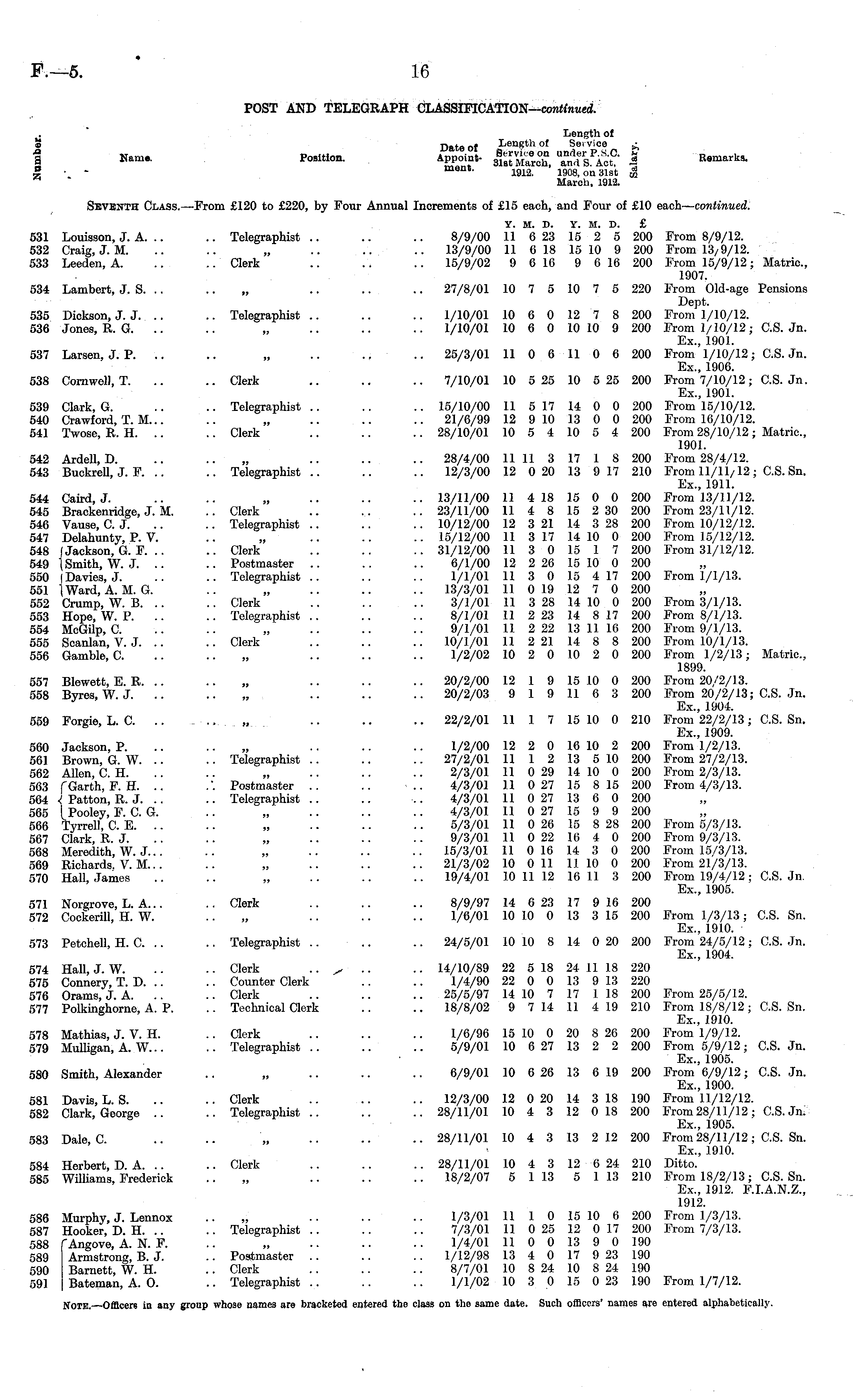 POST AND TELEGRAPH CLASSIFICATION— continued. Length of ® Date of Length of Service | Nam.. Position. Appoint, *{&£ *&£££ | Bemarks. S ■ - . ment - 1912. 1908, on3lst $ * March. 1912. Seventh Class.—-From £120 to £220, by Four Annual Increments of £15 each, and Four of £10 each— continued: Y. m. D. Y. M. D. £ 531 Louisson, J. A. .. .. Telegraphist .. .. .. 8/9/00 11 623 15 2 5 200 From 8/9/12. 532 Craig, J. M. .. .. „ .. .. .. 13/9/00 11 618 15 10 9 200 From 13/9/12. 533 Leeden, A. .. .. Clerk .. .. .. 15/9/02 9 616 9 616 200 From 15/9/12; Matric, 1907. 534 Lambert, J. S. .. .. „ .. .. .. 27/8/01 10 7 5 10 7 5 220 From Old-age Pensions Dept. 535 Dickson, J. J. .. .. Telegraphist .. .. .. 1/10/01 10 6 0 12 7 8 200 From 1/10/12. 536 Jones, R. G. .. .. „ .. .. .. 1/10/01 10 6 0 10 10 9 200 From 1/10/12; CS. Jn. Ex., 1901. 537 Larsen, J. P. .. .. „ .. ~ .. 25/3/01 110 6 110 6 200 From 1/10/12; CS. Jn. Ex., 1906. 538 Cornwell, T. .. .. Clerk .. .. .. 7/10/01 10 525 10 525 200 From 7/10/12; CS. Jn. Ex., 1901. 539 Clark, G. .. .. Telegraphist .. .. .. 15/10/00 11 517 14 0 0 200 From 15/10/12. 540 Crawford, T. M... .. „ .. .. .. 21/6/99 12 910 13 0 0 200 From 16/10/12. 541 Twose, R. H. .. .. Clerk .. .. .. 28/10/01 10 5 4 10 5 4 200 From 28/10/12; Matric, 1901. 542 Ardell, D. .. .. .. .. .. 28/4/00 1111 3 17 1 8 200 From 28/4/12. 543 Buckrell, J. F. .. .. Telegraphist .. .. .. 12/3/00 12 020 13 917 210 From 11/11/12; CS. Sn. Ex., 1911. 544 Caird, J. .. .. „ .. .. .. 13/11/00 11 418 15 0 0 200 From 13/11/12. 545 Brackenridge, J. M. .. Clerk .. .. .. 23/11/00 11 4 8 15 230 200 From 23/11/12. 546 Vause, C.J. .. .. Telegraphist .. .. .. 10/12/00 12 321 14 328 200 From 10/12/12. 547 Delahunty, P. V. .. „ .. .. .. 15/12/00 11 3 17 14 10 0 200 From 15/12/12. 548 (Jackson, G.F. .. .. Clerk .. .. .. 31/12/00 11 3 0 15 1 7 200 From 31/12/12. 549 | Smith, W. J. .. .. Postmaster .. .. .. 6/1/00 12 226 15 10 0 200 550 jDavies, J. .. .. Telegraphist .. .. .. 1/1/01 11 3 0 15 4 17 200 From 1/1/13. 551 (Ward, A. M. G. .. „ .. .. .. 13/3/01 11 019 12 7 0 200 552 Crump, W. B. .. .. Clerk .. .. .. 3/1/01 11 328 14 10 0 200 From 3/1/13. 553 Hope, W. P. .. .. Telegraphist .. .. .. 8/1/01 11 223 14 817 200 From 8/1/13. 554 MeGilp, C .. .. „ .. .. .. 9/1/01 11 222 13 1116 200 From 9/1/13. 555 Scanlan, V. J. .. .. Clerk .. .. .. 10/1/01 11 221 14 8 8 200 From 10/1/13. 556 Gamble, C. .. • • „ . • ■ • • • 1/2/02 10 2 0 10 2 0 200 From 1/2/13; Matric, 1899. 557 Blewett, E. R. .. .. „ .. .. .. 20/2/00 12 1 9 15 10 0 200 From 20/2/13. 558 Byres, W..J. .. .. .. .. .. 20/2/03 9 1 9 11 6 3 200 From 20/2/13; CS. Jn. Ex., 1904. 559 Forgie, L. C .. ... „ .. .. .. 22/2/01 11 1 7 15 10 0 210 From 22/2/13; CS. Sn. Ex., 1909. 560 Jackson, P. • ■ „ • • • • • • 1/2/00 12 2 0 16 10 2 200 From 1/2/13. 561 Brown, G. W. .. .. Telegraphist .. .. .. 27/2/01 11 1 2 13 510 200 From 27/2/13. 562 Allen, OH. .. .. „ .. .. .. 2/3/01 11 0 29 14 10 0 200 From 2/3/13. 563 f Garth, F. H. .. .". Postmaster .. .. ... 4/3/01 11 027 15 815 200 From 4/3/13. 564 I Patton, R. J. .. .. Telegraphist .. .. .. 4/3/01 11 027 13 6 0 200 565 I Pooley, F. CG. .. „ .. .. .. 4/3/01 11 027 15 9 9 200 566 Tyrrell, CE. .. .. „ .. .. .. 5/3/01 11 026 15 828 200 From 5/3/13. 567 Clark, R. J. .. .. „ .. .. .. 9/3/01 11 022 16 4 0 200 From 9/3/13. 568 Meredith, W.J... .. „ .. .. .. 15/3/01 11 016 14 3 0 200 From 15/3/13. 569 Richards. V. M... .. „ .. .. .. 21/3/02 10 011 1110 0 200 From 21/3/13. 570 Hall, James .. .. „ .. .. .. 19/4/01 10 11 12 16 11 3 200 From 19/4/12; CS. Jn. Ex., 1905. 571 Norgrove, L. A... .. Clerk .. .. .. 8/9/97 14 623 17 916 200 572 Cockerill, H. W. •. „ .. • • • ■ 1/6/01 10 10 0 13 315 200 From 1/3/13; CS. Sn. Ex., 1910. ■ 573 Petchell, H. C. .. .. Telegraphist .. .. .. 24/5/01 10 10 8 14 020 200 From 24/5/12; CS. Jn. Ex., 1904. 574 Hall, J. W. .. .. Clerk .. .. .. 14/10/89 22 518 24 1118 220 575 Connery, T. D. .. .. Counter Clerk .. .. 1/4/90 22 0 0 13 913 220 576 Orams, J. A. .. .. Clerk .. .. .. 25/5/97 14 10 7 17 1 18 200 From 25/5/12. 577 Polkinghorne, A. P. .. Technical Clerk .. .. 18/8/02 9 714 11 419 210 From 18/8/12; CS. Sn. Ex., 1910. 578 Mathias, J. V. H. .. Clerk .. .. .. 1/6/96 15 10 0 20 826 200 From 1/9/12. 579 Mulligan, A. W... .. Telegraphist .. .. .. 5/9/01 10 6 27 13 2 2 200 From 5/9/12; CS. Jn. Ex., 1905. 580 Smith, Alexander .. , 6/9/01 10 626 13 619 200 From 6/9/12; CS. Jn. Ex., 1900. 581 Davis, L. S. .. .. Clerk .. .. .. 12/3/00 12 020 14 318 190 From 11/12/12. 582 Clark, George .. .. Telegraphist .. .. .. 28/11/01 10 4 3 12 018 200 From 28/11/12; CS. Jn. Ex., 1905. 583 Dale, C. .. .. „ •• •• •• 28/11/01 10 4 3 13 2 12 200 From 28/11/12; CS. Sn. Ex., 1910. 584 Herbert, D. A. .. .. Clerk .. .. .. 28/11/01 10 4 3 12 624 210 Ditto. 585 Williams, Frederick .. „ 18/2/07 5 113 5 113 210 From 18/2/13; CS. Sn. Ex., 1912. F.1.A.N.Z., 1912. 586 Murphy, J. Lennox .. 1/3/01 11 1 0 15 10 6 200 From 1/3/13. 587 Hooker, D. H. .. .. Telegraphist .. .. .. 7/3/01 11 025 12 0 17 200 From 7/3/13. 588 fAngove, A. N. F. .. „ 1/4/01 11 0 0 13 9 0 190 589 Armstrong, B. J. .. Postmaster .. .. .. 1/12/98 13 4 0 17 923 190 590 Barnett, W. H. .. Clerk 8/7/01 10 824 10 824 190 591 Bateman, A. O. .. Telegraphist .. .. .. 1/1/02 10 3 0 15 023 190 From 1/7/12. Note.—Officers in any group whose names are bracketed entered the class on the same date. Such officers' names are entered alphabetically.