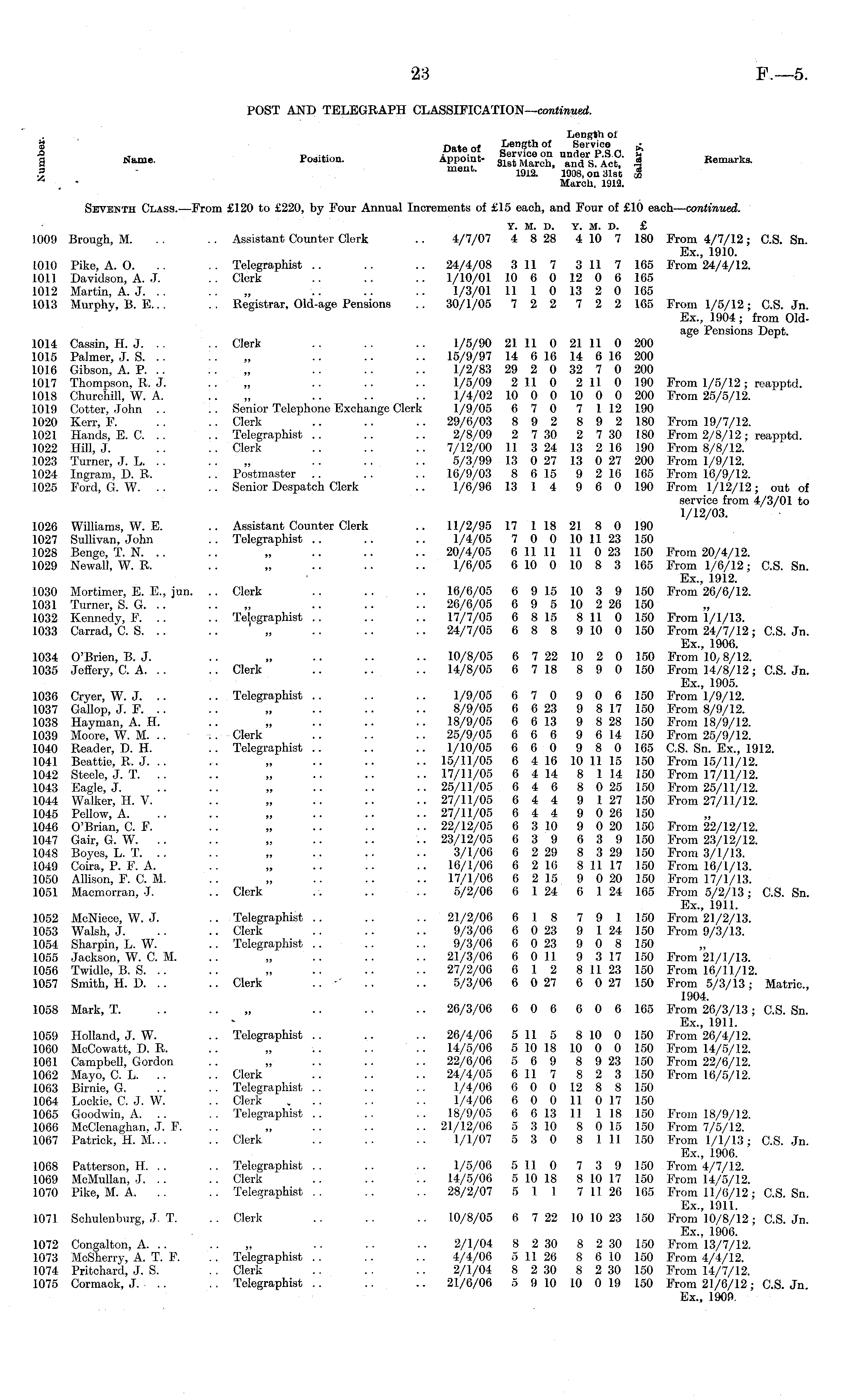POST AND TELEGRAPH CLASSIFICATION— continued. Length oi S Date of Length of Service £ Name. Position. Appoint. &M, \ *">»*»■ 3 menu 1912 igoB,on3lst £ March, 1912. Seventh Class. —From £120 to £220, by Four Annual Increments of £15 each, and Four of £10 each— continued. Y. M. D. Y. m. d. £ 1009 Brough, M. .. .. Assistant Counter Clork .. 4/7/07 4 828 410 7 180 From 4/7/12; CS. Sn. Ex., 1910. 1010 Pike, A. O. .. .. Telegraphist .. .. .. 24/4/08 311 7 311 7 165 From 24/4/12. 1011 Davidson, A. J. .. Clerk .. .. .. 1/10/01 10 6 0 12 0 6 165 1012 Martin, A. J. .. .. „ .. .. .. 1/3/01 11 1 0 13 2 0 165 1013 Murphy, B. E... .. Registrar, Old-age Pensions .. 30/1/05 7 2 2 7 2 2 165 From 1/5/12; CS. Jn. Ex., 1904; from Oldage Pensions Dept. 1014 Cassin, H. J. . . .. Clerk .. .. .. 1/5/90 21 11 0 21 11 0 200 1015 Palmer, J. S. .. .. „ .. .. .. 15/9/97 14 616 14 616 200 1016 Gibson, A. P. .. .. „ .. .. .. 1/2/83 29 2 0 32 7 0 200 1017 Thompson, R. J. .. „ .. .. .. 1/5/09 211 0 211 0 190 From 1/5/12; reapptd. 1018 Churchill, W. A. .. „ .. .. .. 1/4/02 10 0 0 10 0 0 200 From 25/5/12. 1019 Cotter, John .. .. Senior Telephone Exchange Clerk 1/9/05 6 7 0 7 112 190 1020 Kerr, F. .. .. Clerk .. .. .. 29/6/03 8 9 2 8 9 2 180 From 19/7/12. 1021 Hands, E. C .. .. Telegraphist .. .. .. 2/8/09 2 730 2 730 180 From 2/8/12; reapptd. 1022 Hill, J. .. .. Clerk .. .. .. 7/12/00 11 324 13 216 190 From 8/8/12. 1023 Turner, J. L. . . .. „ .. .. .. 5/3/99 13 027 13 027 200 From 1/9/12. 1024 Ingram, D. R. .. Postmaster .. .. .. 16/9/03 8 615 9 216 165 From 16/9/12. 1025 Ford, G. W. .. . . Senior Despatch Clerk .. 1/6/96 13 1 4 9 6 0 190 From 1/12/12; out of service from 4/3/01 to 1/12/03. 1026 Williams, W. E. .. Assistant Counter Clerk .. 11/2/95 17 118 21 8 0 190 1027 Sullivan, John .. Telegraphist .. .. .. 1/4/05 7 0 0 10 11 23 150 1028 Benge, T. N. .. .. „ .. .. .. 20/4/05 6 1111 11 023 150 From 20/4/12. 1029 Newall, W. R. .. „ .. .. .. 1/6/05 610 0 10 8 3 165 From 1/6/12; CS. Sn. Ex., 1912. 1030 Mortimer, E. E., jun. .. Clerk .. .. .. 16/6/05 6 915 10 3 9 150 From 26/6/12. 1031 Turner, S. G. .. .. „ .. .. .. 26/6/05 6 9 5 10 226 150 1032 Kennedy, F. .. .. Telegraphist .. .. .. 17/7/05 6 815 811 0 150 From 1/1/13. 1033 Carrad, CS. .. .. „ .. .. .. 24/7/05 6 8 8 910 0 150 From 24/7/12; CS. Jn. Ex., 1906. 1034 O'Brien, B. J. .. „ .. .. .. 10/8/05 6 722 10 2 0 150 From 10/ 8/12. 1035 Jeffery, CA. .. .. Clerk .. .. .. 14/8/05 6 718 8 9 0 150 From 14/8/12; CS. Jn. Ex., 1905. 1036 Cryer, W. J. .. .. Telegraphist .. .. .. 1/9/05 6 7 0 9 0 6 150 From 1/9/12. 1037 Gallop, J. F. .. .. „ .. .. .. 8/9/05 6 623 9 817 150 From 8/9/12. 1038 Hayman, A. H. .. „ .. .. .. 18/9/05 6 613 9 828 150 From 18/9/12. 1039 Moore, W. M. .. .. Clerk .. .. .. 25/9/05 6 6 6 9 614 150 From 25/9/12. 1040 Reader, D. H. .. Telegraphist .. .. .. 1/10/05 6 6 0 9 8 0 165 CS. Sn. Ex., 1912. 1041 Beattie, R. J. .. .. „ .. .. .. 15/11/05 6 416 10 1115 150 From 15/11/12. 1042 Steele, J. T. .. .. „ .. .. .. 17/11/05 6 414 8 114 150 From 17/11/12. 1043 Eagle, J. .. .. „ .. .. .. 25/11/05 6 4 6 8 025 150 From 25/11/12. 1044 Walker, H. V. .. „ .. .. .. 27/11/05 6 4 4 9 127 150 From 27/11/12. 1045 Pellow, A. .. .. „ .. .. .. 27/11/05 6 4 4 9 026 150 1046 O'Brian, 0. F. .. „ .. .. .. 22/12/05 6 310 9 020 150 From 22/12/12. 1047 Gair, G. W. .. .. „ .. .. .. 23/12/05 6 3 9 6 3 9 150 From 23/12/12. 1048 Boyes, L. T. .. .. „ .. .. .. 3/1/06 6 229 8 329 150 From 3/1/13. 1049 Coira, P. F. A. .. „ .. .. .. 16/1/06 6 216 8 1117 150 From 16/1/13. 1050 Allison, F. C. M. .. „ .. .. .. 17/1/06 6 215 9 020 150 From 17/1/13. 1051 Macmorran, J. .. Clerk .. .. .. 5/2/06 6 124 6 124 165 From 5/2/13; CS. Sn. Ex., 1911. 1052 McNiece, W. J. .. Telegraphist .. .. .. 21/2/06 6 18 7 9 I 150 From 21/2/13. 1053 Walsh, J. .. .. Clerk .. .. .. 9/3/06 6 023 9 124 150 From 9/3/13. 1054 Sharpin, L. W. .. Telegraphist .. .. .. 9/3/06 6 023 9 0 8 150 1055 Jackson, W.C.M. .. „ .. .. .. 21/3/06 6 011 9 317 150 From 21/1/13. 1056 Twidle, B. S. .. .. „ .. .. .. 27/2/06 6 12 8 1123 150 From 16/11/12. 1057 Smith, H. D. .. .. Clerk .. .. .. 5/3/06 6 027 6 027 150 From 5/3/13; Matric, 1904. 1058 Mark, T. .. .. „ .. .. ■ • 26/3/06 6 0 6 6 0 6 165 From 26/3/13; CS. Sn. Ex., 1911. 1059 Holland, J. W. .. Telegraphist .. .. .. 26/4/06 5 115 810 0 150 From 26/4/12. 1060 McCowatt, D. R. .. „ .. .. .. 14/5/06 510 18 10 0 0 150 From 14/5/12. 1061 Campbell, Gordon .. „ .. .. .. 22/6/06 5 6 9 8 923 150 From 22/6/12. 1062 Mayo, CL. .. .. Clerk .. .. .. 24/4/05 611 7 8 2 3 150 From 16/5/12. 1063 Birnie, G. .. .. Telegraphist .. .. . . 1/4/06 6 0 0 12 8 8 150 1064 Loekie, CJ. W. .. Clerk ... .. .. 1/4/06 6 0 0 11 017 150 1065 Goodwin, A. .. .. Telegraphist .. .. .. 18/9/05 6 613 11 118 150 From 18/9/12. 1066 McClenaghan. J. F. .. „ .. .. .. 21/12/06 5 310 8 015 150 From 7/5/12. 1067 Patrick, H. M... .. Clerk .. .. .. 1/1/07 5 3 0 8 111 150 From 1/1/13; CS. Jn. Ex., 1906. 1068 Patterson, H. .. .. Telegraphist .. .. .. 1/5/06 511 0 7 3 9 150 From 4/7/12. 1069 McMullan, J. .. .. Clerk .. .. .. 14/5/06 510 18 810 17 150 From 14/5/12. 1070 Pike, M. A. .. .. Telegraphist .. .. .. 28/2/07 5 11 7 1126 165 From 11/6/12; CS. Sn. Ex., 1911. 1071 Schulenburg, J. T. .. Clerk .. .. .. 10/8/05 6 722 10 10 23 150 From 10/8/12; CS. Jn. Ex., 1906. 1072 Congalton, A. .. „ .. .. .. 2/1/04 8 230 8 230 150 From 13/7/12. 1073 McSherry, A. T. F. .. Telegraphist .. .. .. 4/4/06 5 1126 8 610 150 From 4/4/12. 1074 Pritchard, J. S. . . Clerk .. .. .. 2/1/04 8 230 8 230 150 From 14/7/12. 1075 Cormack, J. ... . . Telegraphist .. .. .. 21/6/06 5 910 10 019 150 From 21/6/12; CS. Jn. Ex., 1909.