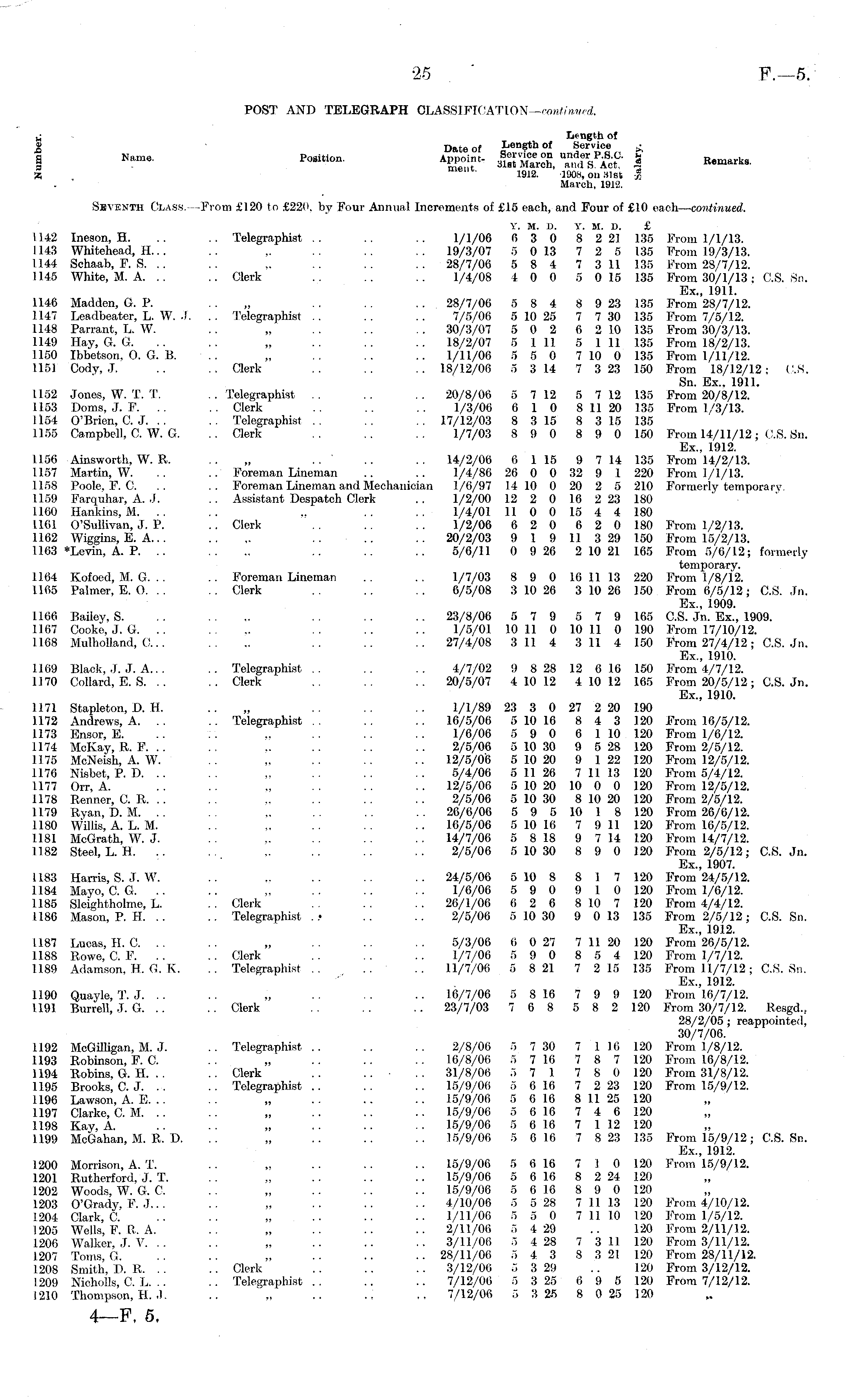 POST AND TELEGRAPH CLASSIFICATION— continued. Length of J! Date of Length of Service & fc melu - 1912. 1908, oil 31st £ March, 1912. Seventh Class. —From £120 to £220, by Four Annual Increments of £15 each, and Four of £10 each— continued. Y. M. D. Y. M. D. £ 1142 Ineson, H. .. .. Telegraphist .. .. .. 1/1/06 6 3 0 8 221 135 From 1/1/13. 1143 Whitehead, H... .. .. .. 19/3/07 5 013 7 2 5 135 From 19/3/13. 1144 Schaab, F. S. .. .. ~ .. .. .. 28/7/06 5 8 4 7 311 135 From 28/7/12. 1145 White, M. A. .. .. Clerk .. .. .. 1/4/08 4 0 0 5 015 135 From 30/1/13: CS. Sn. Ex., 1911. 1146 Madden, G. P. .. „ .. .. .. 28/7/06 5 8 4 8 923 135 From 28/7/12. 1147 Leadbeater, L. W. •!. .. Telegraphist .. .. .. 7/5/06 510 25 7 730 135 From 7/5/12. 1148 Parrant, L. W. .. „ .. .. .. 30/3/07 5 0 2 6 210 135 From 30/3/13. 1149 Hay, G. G. .. . . „ . . .. .. 18/2/07 5 111 5 111 135 From 18/2/13. 1150 Ibbetson, O. G. B. „ .. .. .. 1/11/06 5 5 0 710 0 135 From 1/11/12. 1151. Cody, J. .. .. Clerk .. .. .. 18/12/06 5 314 7 323 150 From 18/12/12; CS. Sn. Ex., 1911. 1152 Jones, W. T. T. . . Telegraphist .. .. .. 20/8/06 5 712 5 712 135 From 20/8/12. 1153 Doms, J. F. .. .. Clerk .. .. 1/3/06 6 10 811 20 135 From 1/3/13. 1154 O'Brien, C.J, .. .. Telegraphist . . . . .. 17/12/03 8 315 8 315 135 1155 Campbell, C. W. G. .. Clerk .. .. .. 1/7/03 8 9 0 8 9 0 150 From 14/11/12; CS. Sn. Ex., 1912. 1156 Ainsworth, W. R. .. „ .. .. .. 14/2/06 6 115 9 714 135 From 14/2/13. 1157 Martin, W. .. .. Foreman Lineman .. .. 1/4/86 26 0 0 32 9 1 220 From 1/1/13. 1158 Poole, F. C .. .. Foreman Lineman and Mechanician 1/6/97 14 10 0 20 2 5 210 Formerly temporary. 1159 Farquhar, A. .1. .. Assistant Despatch Clerk .. 1/2/00 12 2 0 16 223 180 1160 Hankins, M. .. .. .. .. .. 1/4/01 11 0 0 15 4 4 180 1161 O'Sullivan, J. P. .. Clerk .. .. 1/2/06 6 2 0 6 2 0 180 From 1/2/13. 1162 Wiggins, E. A... .. ~ .. .. .. 20/2/03 9 1 9 11 329 150 From 15/2/13. 1163 *Levin, A. P. .. .... .. .. .. 5/6/11 0 926 210 21 165 From 5/6/12; formerly temporary. 1164 Kofoed, M. G. .. .. Foreman Lineman . . 1/7/03 8 9 0 16 11 13 220 From 1/8/12. 1165 Palmer, E. O. .. .. Clerk .. .. .. 6/5/08 310 26 310 26 150 From 6/5/12; CS. Jn. Ex., 1909. 1166 Bailey, S. .. .... .. .. .. 23/8/06 5 7 9 5 7 9 165 CS. Jn. Ex., 1909. 1167 Cooke, J. G. .. .... .. .. .. 1/5/01 10 11 0 10 11 0 190 From 17/10/12. 1168 Mulholland, C.. .... .. .. .. 27/4/08 311 4 311 4 150 From 27/4/12; CS. Jn. Ex., 1910. 1169 Black, J. J. A.. .. . Telegraphist . . .. . . 4/7/02 9 828 12 616 150 From 4/7/12. 1170 Collard, E. S. .. .. Clerk .. .. .. 20/5/07 410 12 410 12 165 From 20/5/12; CS. Jn. Ex., 1910. 1171 Stapleton, D. H. .. „ . . .. 1/1/89 23 3 0 27 220 190 1172 Andrews, A. .. .. Telegraphist .. .. .. 16/5/06 510 16 8 4 3 120 From 16/5/12. 1173 Ensor, E. .. . . ~ . . . . 1/6/06 5 9 0 6 110 120 From 1/6/12. 1174 McKay, R. F. .. .. .. .. .. .. 2/5/06 510 30 9 528 120 From 2/5/12. 1175 McNeish, A. W. .. „ .. .. .. 12/5/06 510 20 9 122 120 From 12/5/12. 1170 Nisbet, P. D. . . . . „ .. .. .. 5/4/06 511 26 711 13 120 From 5/4/12. 1177 Orr, A. .. „ . . .. . . 12/5/06 510 20 10 0 0 120 From 12/5/12. 1178 Renner, C. R. .. ~ . . .. .. 2/5/06 510 30 810 20 120 From 2/5/12. 1179 Ryan, D. M. .. .. ~ .. .. .. 26/6/06 5 9 5 10 1 8 120 From 26/6/12. 1180 Willis, A. L. M. .. „ .. .. 16/5/06 510 16 7 911 120 From 16/5/12. 1181 McGrath, W. J. .. ~ .. . . . . 14/7/06 5 818 9 714 120 From 14/7/12. 1182 Steel, L. H. .. .. „ .. 2/5/06 510 30 8 9 0 120 From 2/5/12; CS. Jn. Ex., 1907. 1183 Harris, S. J. W. . . .. .. .. 24/5/06 510 8 8 17 120 From 24/5/12. 1184 Mayo, C. G. .. .. „ . . .. . . 1/6/06 5 9 0 9 10 120 From 1/6/12. 1185 Sleightholme, L. . . Clerk .. .. .. 26/1/06 6 2 6 810 7 120 From 4/4/12. 1186 Mason, P. H. .. .. Telegraphist ..• .. .. 2/5/06 510 30 9 013 135 From 2/5/12; CS. Sn. Ex., 1912. 1187 Lucas, H. C. .. .. „ .. .. 5/3/06 6 027 711 20 120 From 26/5/12. 1188 Rowe, C. F. .. . . Clerk . . . . .. 1/7/06 5 9 0 8 5 4 120 From 1/7/12. 1189 Adamson, H. G. K. .. Telegraphist .. .. .. 11/7/06 5 821 7 215 135 From 11/7/12; CS. Sn. Ex., 1912. 1190 Quayle, T. J. .. .. „ . . .. .. 16/7/06 5 816 7 9 9 120 From 16/7/12. 1191 Burrell, J. G. .. .. Clerk .. .. .. 23/7/03 7 6 8 5 8 2 120 From 30/7/12. Resgd., 28/2/05 ; reappointed, 30/7/06. 1192 McGilligan, M. J. .. Telegraphist .. .. .. 2/8/06 5 730 7 116 120 From 1/8/12. 1193 Robinson, F. C . . „ .. .. .. 16/8/06 5 716 7 8 7 120 From 16/8/12. 1194 Robins, G. H. .. .. Clerk .. .. • .. 31/8/06 5 7 1 7 8 0 120 From 31/8/12. 1195 Brooks, C. J. .. .. Telegraphist . . . . . . 15/9/06 5 616 7 223 120 From 15/9/12. 1196 Lawson, A. E. .. .. „ .. .. .. 15/9/06 5 616 8 1125 120 1197 Clarke, CM. .. .. „ .. .. .. 15/9/06 5 616 7 4 6 120 1198 Kay, A , 15/9/06 5 616 7 112 120 1199 McGahan, M. R. D. .. „ .. .. .. 15/9/06 5 616 7 823 135 From 15/9/12; CS. Sn. Ex., 1912. 1200 Morrison, A. T. .. „ .. .". .. 15/9/06 5 616 7 10 120 From 15/9/12. 1201 Rutherford, J. T. .. „ 15/9/06 5 616 8 224 120 1202 Woods, W. G. C. .. „ .. .. .. 15/9/06 5 616 8 9 0 120 1203 O'Grady, F. J... .. „ .. .. .. 4/10/06 5 528 7 1113 120 From 4/10/12. 1204 Clark, C. .. .. „ .. .. .. 1/11/06 5 5 0 711 10 120 From 1/5/12. 1205 Wells, F. R. A. .. 2/11/06 5 429 .. 120 From 2/11/12. 1206 Walker, J. V. . . .. ~ .. .. .. 3/11/06 5 428 7 311 120 From 3/11/12. 1207 Toms, G. .. .. „ .. .. .. 28/11/06 5 4 3 8 321 120 From 28/11/12. 1208 Smith, D. R. . . . . Clerk .. .. .. 3/12/06 5 329 .. 120 From 3/12/12. 1209 Nioholls, C. L. .. .. Telegraphist .. .. .. 7/12/06 5 325 6 9 5 120 From 7/12/12. 1210 Thompson, H. J. .. , .. 7/12/06 5 325 8 025 120