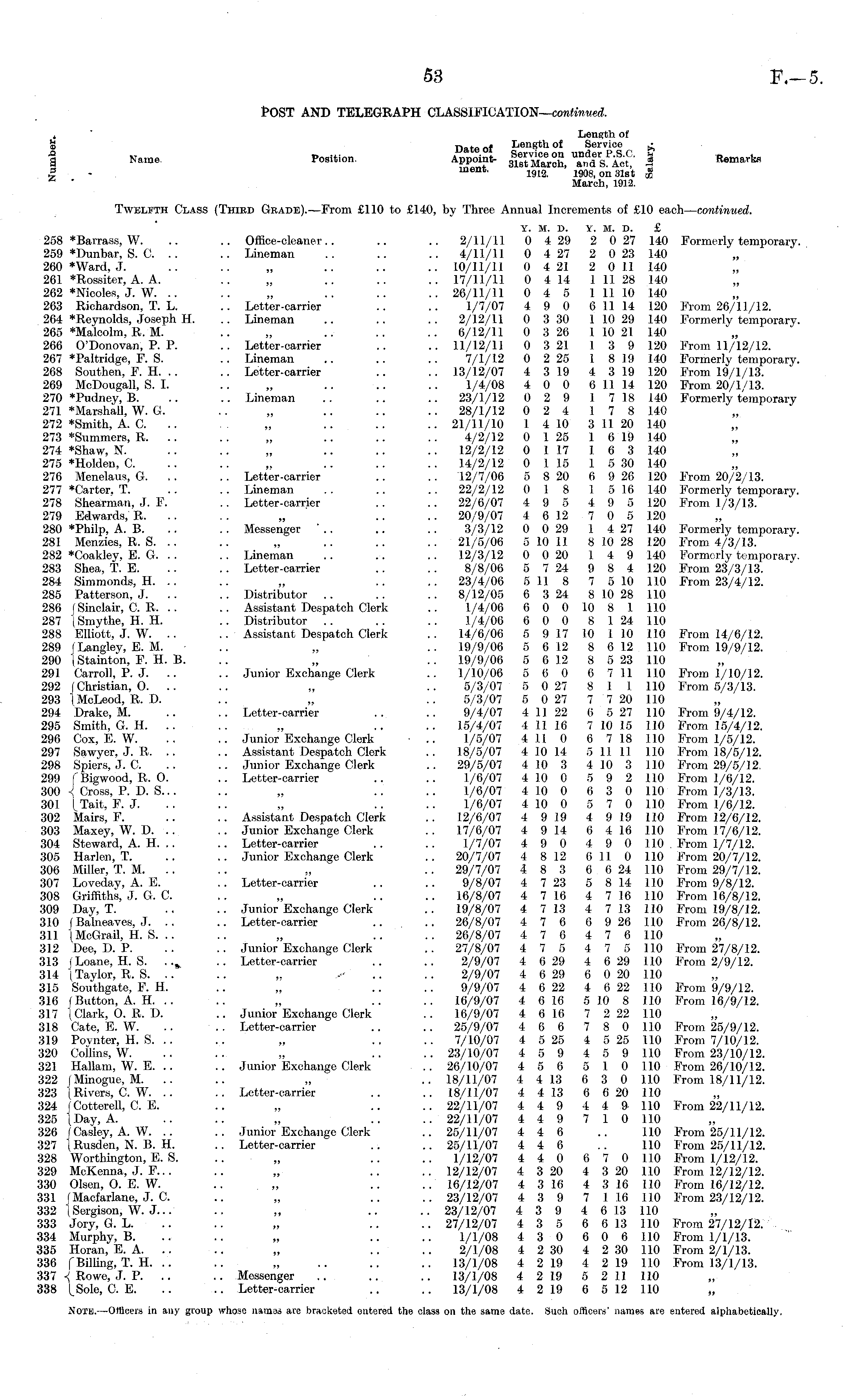 POST AND TELEGRAPH CLASSIFICATION— continued. . Length of S Date of Length of Service j 3 Name. Position. Appoint- A "-arta a ment. 1912 1908, on 31st 5 * March, 1912. Twelfth Class (Third Grade). —From £110 to £140, by Three Annual Increments of £10 each— continued. Y. M. D. Y. m. d. £ 258 *Barrass, W. .. .. Office-cleaner.. .. .. 2/11/11 0 429 2 027 140 Formerly temporary. 259 *Dunbar, S. C .. .. Lineman .. .. .. 4/11/11 0 427 2 023 140 260 *Ward, J. .. .. „ .. .. .. 10/U/U 0 421 2 011 140 261 *Rossiter, A. A. .. „ .. .. .. 17/11/11 0 414 111 28 140 262 *Nicoles, J. W. .. .. „ .. .. .. 26/11/11 0 4 5 111 10 140 263 Richardson, T. L. .. Letter-carrier .. .. 1/7/07 4 9 0 6 1114 120 From 26/11/12. 264 "Reynolds, Joseph H. .. Lineman .. .. .. 2/12/11 0 330 110 29 140 Formerly temporary. 265 *Malcolm, R. M. .. „ .. .. .. 6/12/11 0 326 110 21 140 266 O'Donovan, P. P. .. Letter-carrier .. .. 11/12/11 0 321 1 3 9 120 From 11/12/12. 267 *Paltridge, F. S. .. Lineman .. .. .. 7/1/12 0 225 1 819 140 Formerly temporary. 268 Southen, F. H. .. .. Letter-carrier .. .. 13/12/07 4 319 4 319 120 From 19/1/13. 269 McDougall, S. I. .. „ .. .. .. 1/4/08 4 0 0 6 1114 1.20 From 20/1/13. 270 *Pudney, B. .. .. Lineman .. .. .. 23/1/12 0 2 9 1 718 140 Formerly temporary 271 •Marshall, W. G. .. „ .. .. .. 28/1/12 0 2 4 1 7 8 140 272 *Smith, A. C .. „ .. .. .. 21/11/10 I 410 3 1120 140 273 "Summers, R. .. .. „ .. .. .. 4/2/12 0 125 1 619 140 274 *Shaw, N. .. .. „ .. .. .. 12/2/12 0 117 16 3 140 275 *Holden, C. .. .. „ .. .. .. 14/2/12 0 115 1 530 140 276 Menelaus, G. .. .. Letter-carrier .. .. 12/7/06 5 820 6 926 120 From 20/2/13. 277 *Carter, T. .. .. Lineman .. .. .. 22/2/12 0 18 I 516 140 Formerly temporary. 278 Shearman, J. F. .. Letter-carrier .. .. 22/6/07 4 9 5 4 9 5 120 From 1/3/13. 279 Edwards, R. .. .. „ .. .. 20/9/07 4 612 7 0 5 120 280 *Philp, A. B. .. .. Messenger '.. .. .. 3/3/12 0 029 1 427 140 Formerly temporary. 281 Menzies, R. S. .. .. „ .. .. .. 21/5/06 510 11 810 28 120 From 4/3/13. 282 *Coakley, E. G. . . .. Lineman .. .. .. 12/3/12 0 020 14 9 140 Formerly temporary. 283 Shea, T. E. .. .. Letter-carrier .. .. 8/8/06 5 724 9 8 4 120 From 23/3/13. 284 Simmonds, H. .. .. „ .. .. 23/4/06 511 8 7 510 110 From 23/4/12. 285 Patterson, J. .. .. Distributor .. .. .. 8/12/05 6 324 810 28 110 286 [ Sinclair, C. R. .. .. Assistant Despatch Clerk .. 1/4/06 6 0 0 10 8 I 110 287 (Smythe, H. H. .. Distributor .. .. .. 1/4/06 6 0 0 8 124 UO 288 Elliott, J. W. .. .. Assistant Despatch Clerk .. 14/6/06 5 917 10 110 UO From 14/6/12. 289 I Langley, E. M. .. „ .. 19/9/06 5 612 8 612 110 From 19/9/12. 290 [Stainton, F. H. B. .. „ .. 19/9/06 5 612 8 523 UO 291 Carroll, P. J. .. .. Junior Exchange Clerk .. 1/10/06 5 6 0 6 711 110 From 1/10/12. 292 (Christian, O. .... „ .. 5/3/07 5 027 8 1 I UO From 5/3/13. 293 iMcLeod, R. D. .. „ .. 5/3/07 5 027 7 720 110 294 Drake, M. .. .. Letter-carrier .. .. 9/4/07 4 1122 0 527 110 From 9/4/12. 295 Smith, G. H. .. .. ~ .. .. 15/4/07 4 1116 710 15 UO From 15/4/12. 296 Cox, E. W. .. .. Junior Exchange Clerk ■ .. 1/5/07 411 0 6 718 110 From 1/5/12. 297 Sawyer, J. R. .. .. Assistant Despatch Clerk .. 18/5/07 410 14 5 1111 110 From 18/5/12. 298 Spiers, J. C .. .. Junior Exchange Clerk .. 29/5/07 410 3 410 3 110 From 29/5/12. 299 f Bigwood, R. O. .. Letter-carrier .. .. 1/6/07 410 0 5 9 2 110 From 1/6/12. 300 / Cross, P. D. 5... .. „ .. .. 1/6/07 410 0 6 3 0 110 From 1/3/13. 301 /Tait, F. J. .. .. „ . . .. 1/6/07 410 0 5 7 0 UO From 1/6/12. 302 Mairs, F. .. .. Assistant Despatch Clerk .. 12/6/07 4 919 4 919 110 From 12/6/12. 303 Maxey, W. D. .. . . Junior Exchange Clerk .. 17/6/07 4 914 6 416 UO From 17/6/12. 304 Steward, A. H. .. .. Letter-carrier .. .. 1/7/07 4 9 0 4 9 0 110 . From 1/7/12. 305 Harlen, T. .. .. Junior Exchange Clerk .. 20/7/07 4 812 611 0 110 From 20/7/12. 306 Miller, T. M. .. .. „ .. 29/7/07 4 8 3 6 624 110 From 29/7/12. 307 Loveday, A. E. .. Letter-carrier .. .. 9/8/07 4 723 5 814 110 From 9/8/12. 308 Griffiths, J. G. C .. „ .. .. 16/8/07 4 716 4 716 110 From 16/8/12. 309 Day, T. .. .. Junior Exchange Clerk .. 19/8/07 4 713 4 713 UO From 19/8/12. 310 (Balneaves, J. .. .. Letter-carrier .. .. 26/8/07 4 7 6 6 926 110 From 26/8/12. 311 jMcGrail, H. S. .. .. „ .. .. 26/8/07 4 7 6 4 7 6 UO 312 Dee, D. P. .. .. Junior Exchange Clerk .. 27/8/07 4 7 5 4 7 5 110 From 27/8/12. 313 (Loane, H. S. . . fc .. Letter-carrier .. .. 2/9/07 4 629 4 629 110 From 2/9/12. 314 1 Taylor, R. S. .. .. ~ ... .. 2/9/07 4 629 6 020 .110 315 Southgate, F. H. .. „ .. .. 9/9/07 4 622 4 622 110 From 9/9/12. 316 (Button, A. H. .. .. „ .. .. 16/9/07 4 616 510 8 110 From 16/9/12. 317 [Clark, O. R. D. .. Junior Exchange Clerk .. 16/9/07 4 616 7 222 UO 318 Gate, E. W. .. .. Letter-carrier .. .. 25/9/07 4 6 6 7 8 0 110 From 25/9/12. 319 Povnter, H. S. .. .. „ .. .. 7/10/07 4 525 4 525 110 From 7/10/12. 320 Collins, W. .. .. „ .. .. 23/10/07 4 5 9 4 5 9 110 From 23/10/12. 321 Hallam, W. E. .. .. Junior Exchange Clerk .. 26/10/07 4 5 6 5 I 0 UO From 26/10/12. 322 (Minogue, M. .... „ .. 18/11/07 4 413 6 3 0 UO From 18/11/12. 323 j Rivers, CW. .. .. Letter-carrier .. .. 18/11/07 4 413 6 620 110 324 /Cotterell, CE. .. „ .. .. 22/11/07 4 4 9 4 4 9 UO From 22/11/12. 325 JDay, A. .. .. „ .. .. 22/11/07 4 4 9 7 1 0 110 326 JCasley, A. W. .. .. Junior Exchange Clerk .. 25/11/07 4 4 6 .. 110 From 25/11/12. 327 j Rusden, N. B. H. .. Letter-carrier .. .. 25/11/07 4 4 6 .. 110 From 25/11/12. 328 Worthington, E. S. .. „ .. .. 1/12/07 4 4 0 0 7 0 110 From 1/12/12. 329 McKenna, J. F... .. „ .. .. 12/12/07 4 320 4 320 110 From 12/12/12. 330 Olsen, O. E. W. .. „ .. .. 16/12/07 4 316 4 316 UO From 16/12/12. 331 (Macfarlane, J. C. .. „ .. .. 23/12/07 4 3 9 7 116 110 From 23/12/12. 332 jSergison, W. J... .. „ .. .. 23/12/07 4 3 9 4 613 110 333 Jory, G. L. .. .. „ .. .. 27/12/07 4 3 5 6 613 UO From 27/12/12. 334 Murphy, B. .. .. „ .. .. 1/1/08