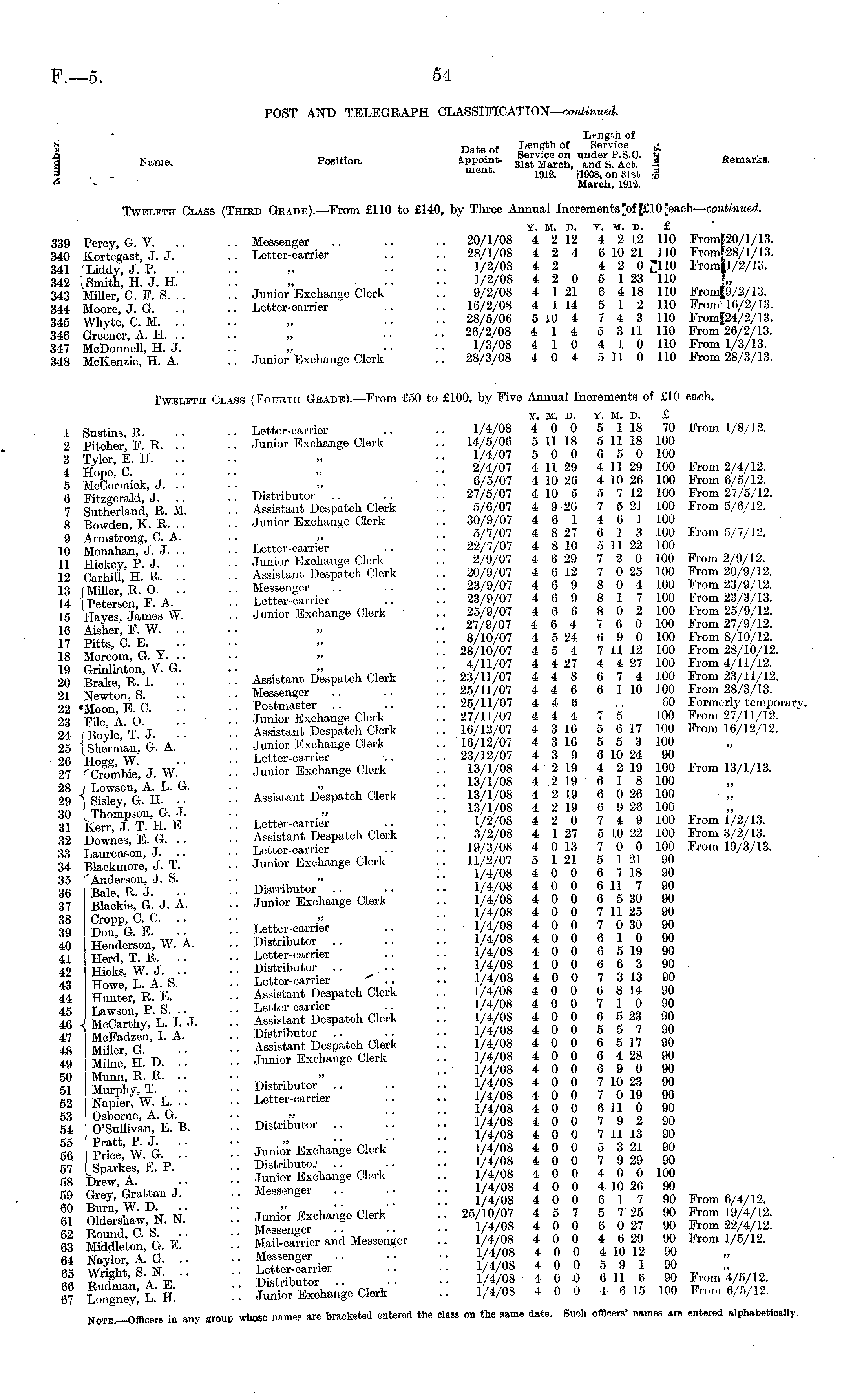 POST AND TELEGRAPH CLASSIFICATION— continued. Length of S Date of Length of Service £ 1 Name. Position. .Appoint- Ser™ | Remark 3. 3 . . ment - 1912. 11908, on 31st & <* - March, 1912. Twelfth Class (Third Grade).—From £110 to £140, by Three Annual Increments'of [£10'each — continued.. Y. M. D. Y. M. D. £ 339 Percy, G. V Messenger 20/1/08 4 212 4 212 UO From|2o/1/13. 340 Kortegast, J. J. .. Letter-carrier .. .. 28/1/08 4 2 4 610 21 110 From|2B/l/13. 341 (Liddy.J.P „ •• •• V 2/08 4 2 4 2 Fromll/2/13. 342 Smith H. J. H. .. „ •• •• 1/2/08 42 0 5 123 110 f„ 343 MiDer GF.S... .. Junior Exchange Clerk .. 9/2/08 41 21 64 18 110 From[9/2/13. 344 Moore J G Letter-carrier .. .. 16/2/08 4 114 5 1 2 UO From 16/2/13. 345 WhyteCM „ •• •• 28/5/06 510 4 7 4 3 UO Froml24/2/13. 346 Greener AH „ .... 26/2/08 414 5 311 UO From 26/2/13. 347 McDonnell'h'J' „ •• •• 1/3/08 4 10 4 1 0 110 From 1/3/13. 348 McKenzie, H. A. .. Junior Exchange Clerk .. 28/3/08 4 0 4 511 0 UO From 28/3/13. Twelfth Class (Fourth Grade).—From £50 to £100, by Five Annual Increments of £10 each. Y. M. D. y. M. D. £ 1 Sustins R .. ■• Letter-carrier .. .. 1/4/08 40 0 5 118 70 From 1/8/12. 2 Pitcher F R Junior Exchange Clerk .. 14/5/06 511 18 511 18 100 3 Tyler EH „ •• WO7 50 0 65 0 100 4 TrfoneC ■• 2/4/07 4 1129 4 1129 100 From 2/4/12. I McCormick J " " „ • • 6 / 5 / 07 410 26 410 26 100 From 6/5/12. 6 Fitzgerald J. '.'. .. Distributor 27/5/07 410 5 5 712 100 From 27/5/12. 7 Sutherland RM. .. Assistant Despatch Clerk .. 5/6/07 4 920 75 21 100 From 5/6/12. 8 Bowden X R Junior Exchange Clerk .. 30/9/07 4 6 1 4 6 1 100 9 Irmstrong,CA. .. „ •• 5/7/07 4827 6 1 3 100 From 5/7/12. 10 Monahan J. J Letter-carrier .. .. 22/7/07 4 810 5 1122 100 11 ffickev P J •• Junior Exchange Clerk .. 2/9/07 46 29 72 0 100 From 2/9/12. 12 SHE •• Assistant Despatch Clerk .. 20/9/07 4 612 7 025 100 From 20/9/12. 13 (Muler RO' '.. .. Messenger 23/9/07 4 6 9 8 0 4 100 From 23/9/12. 14 PetersenFA .. Letter-carrier .. .. 23/9/07 4 6 9 8 I 7 100 From 23/3/13. 15 HayesJames W. .. Junior Exchange Clerk .. 25/9/07 4 6 6 8 0 2 100 From 25/9/12. 16 AkherF W •• .. •• 27 / 9 / 07 4 6 4 7 6 0 100 From 27/9/12. 17 Zr V „ ■■ 8/10/07 4 524 6 9 0 100 From 8/10/12. 18 Morc'om G V " '.'. „ ■■ 28/10/07 4 5 4 711 12 100 From 28/10/12. 9 SnVG. .. „ •• 4/11/07 4 427 4 427 100 From 4/11/12. 20 Brale R I •• Assistant Despatch Clerk .. 23/11/07 4 4 8 6 7 4 100 From 23/11/12. 21 Newton S ' '.'. .. Messenger 25/11/07 4 4 6 6 110 100 From 28/3/13. 22 ♦Moon EC . •• Postmaster 25/11/07 4 4 6 .. 60 Formerly temporary. 23 Fit A O ' •• Junior Exchange Clerk .. 27/11/07 44 4 7 5 100 From 27/11/12. 24 (BovleTJ " ■• Assistant Despatch Clerk .. 16/12/07 4 316 5 617 100 From 16/12/12. 25 Sherman G A.' .. Junior Exchange Clerk .. 16/12/07 4 316 5 5 3 100 26 HoS W' •• • Letter-carrier .. .. 23/12/07 43 9 610 24 90 ll K',J.W, •■ Junior Exchange Clerk .. 13/1/08 4 219 4 219 100 From 13/1/13. 9ft T nn A T G •■ 13/1/08 4 219 6 18 100 „ 29 i Sislev GH ' ' '.'. Assistant Despatch Clerk .. 13/1/08 42 19 60 26 100 on ti! y r T , ■• 13/1/08 4 219 6 926 100 31 Kerr J T HE' '.'. Letter-carrier .. .. 1/2/08 42 0 74 9 100 From 1/2/13. 32 Dowries' EG .. Assistant Despatch Clerk .. 3/2/08 4 127 510 22 100 From 3/2/13. 33 .. Letter-carrier .. .. 19/3/08 4 013 7 0 0 100 From 19/3/13. 34 Hackmore JT. .. Junior Exchange Clerk .. 11/2/07 5 121 5 121 90 tt ff c f more ' J - .. 1/4/08 40 0 67 18 90 35 [Anderson, J. &. •• » /,/,„„ . „ n „,, n an 36 T?ale R J •• Distributor .. .. .. 1/4/08 40 0 611 7 90 37 Blackie' GJ A. .. Junior Exchange Clerk .. 1/4/08 4 0 0 6 530 90 H £ lackle p % , .. 1/4/08 4 0 0 711 25 90 39 Don G E " '■'■ Letter-carrier .. .. ■ 1/4/08 4 0 0 7 030 90 40 Henderson W'A. .. Distributor 1/4/08 4 0 0 6 10 90 « ierdTß •■ Letter-carrier .. .. 1/4/08 40 0 65 19 90 42 Hicks W J ' ■• Distributor 1/4/08 4 0 0 6 6 3 90 « Howe LA'S .. Letter-carrier '.. .. 1/4/08 40 0 73 13 90 Z ilunter,RE.' .. Assistant Despatch Clerk .. 1/4/08 40 0 68 14 90 45 Tawinn PS •• Letter-carrier .. .. 1/4/08 40 0 710 90 tL McCarthy LI J. .. Assistant Despatch Clerk .. 1/4/08 40065 23 90 ;S «w a y t A Distributor 1/4/08 4 0 0 5 5 7 90 47 McFadzen, I. A. .. uiscriouroi •• ■• Ma ma A ft ft ti Kl7 Oft 48 Miller G • • Assistant Despatch Clerk .. 1/4/08 4 0 0 b 517 90 % MhieHD .. Junior Exchange Clerk .. 1/4/08 40 0 64 28 90 to « ' b'r • • 1/4/08 4 0 0 6 9 0 90 50 Munn R. R Distributor" 1/4/08 4 0 0 710 23 90 52 ffiwi" Starrier .. .. 1/4/08 40070 19 90 3, 7\? in • ■ • • 1/4/08 40 0 611 0 90 53 Osborne, AG .. £ ,^ OB 40 0 79 2 90 54 O'Sullivan E. B. .. Distributor q q ? 56 IricC'w.G. :: :: wos *o o 5 321 90 kh a„„L TCP .. Distributor .. .. • • 1/4/08 4 0 0 7 y I'd yo 58 Drew A Junior Exchange Clerk .. 1/4/08 40 0 40 0 100 58 Drew, A. ■• Messenger . •• •• 1/4/08 40 0 410 26 90 59 Grey, Grattan J. .. Messenger q q g x ? 6/4/12 _ I! Clerk .. 25/10/07 4 5 7 5 725 90 From 19/4/12. Se£|.E'.' ii MaU carrierand Messenger 1/4/08 4004* 29 90 From 1/5/12. tl '.'. Junior Exchange Clerk .. 1/4/08 40 0 46 15 100 From 6/5/12. NOTE.—Officers in any group whose names are bracketed entered the class on the same date. Such officers' names are entered alphabetically.