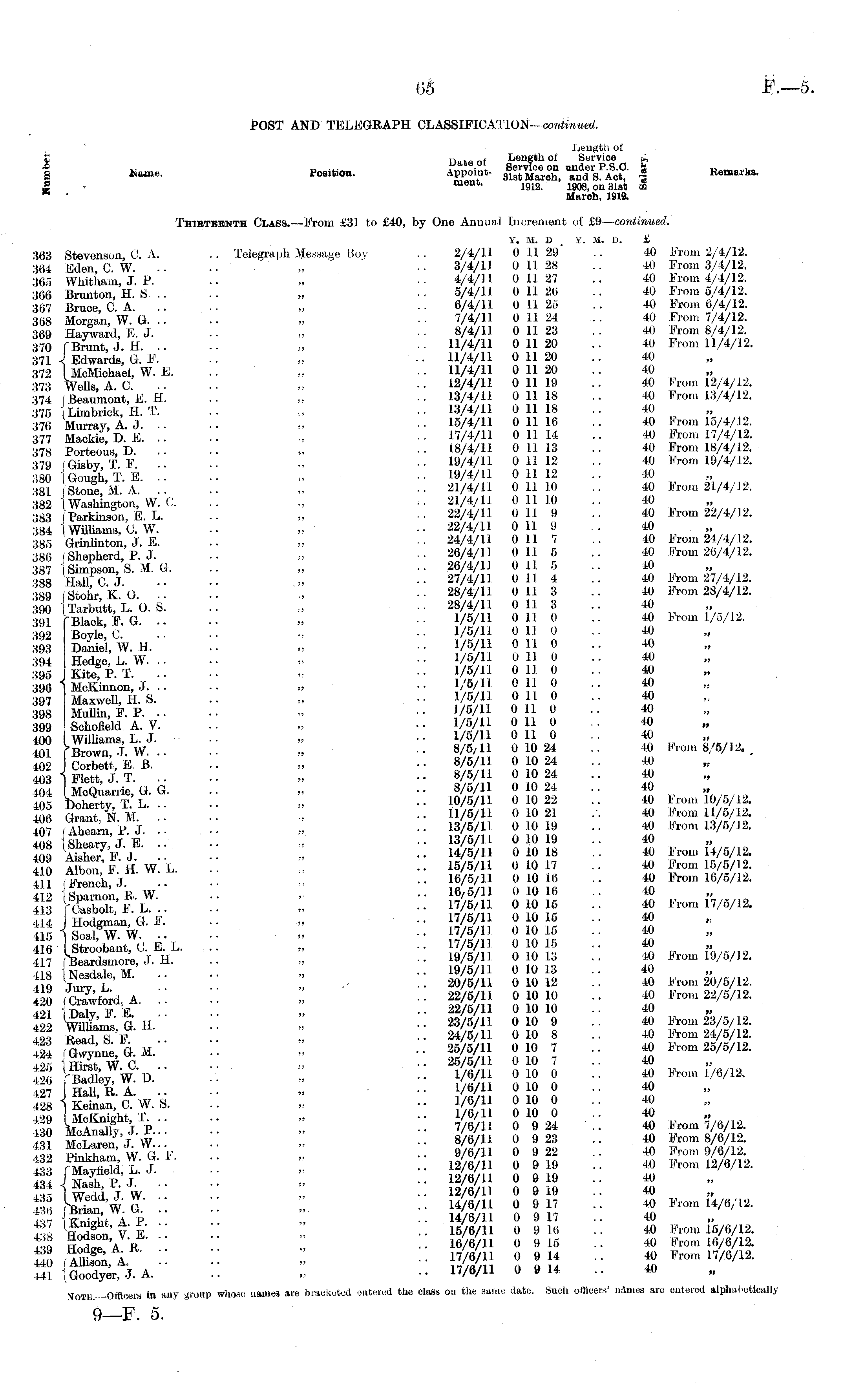 POST AND TELEGRAPH CLASSIFICATION— continued. Length of t jjata of Length of Service iA 1 N»e, Position. Appoint- | Keraar**. £ ment - 1912. 1908, on 31st m 16 March, 1918. Thirteenth Class.—From £31 to £40, by One Annual Increment of £9— continued. V, M. D Y. M. D. £ 363 Stevenson, CA. .. Telegraph Message Boy .. 2/4/11 011 29' .. 40 From 2/4/12. 364 Eden, 0. W „ • • 3/4/11 011 28 .. 40 From 3/4/12. 365 Whitham, J. P. .. „ ■• 4/4/11 0 1127 .. 40 From 4/4/12. 366 Brunton, H. S „ •• 5/4/11 0 1126 .. 40 From 5/4/12. 367 Bruce, C A „ ■• 6/4/11 0 1125 .. 40 From 6/4/12. 368 Morgan, W. G „ • • 7/4/11 011 24 .. 40 From 7/4/12. 369 Hayward, E. J. .. „ • ■ 8/4/11 011 23 .. 40 From 8/4/12. 370 [Brant, J. H „ ■■ 11/4/U 0 1120 .. 40 From 11/4/12. 371 I Edwards, G. F. .. „ -. "/*/" 011 20 .. 40 372 1 McMichael, W. E. .. ~ .. U/4/11 0 1120 .. 40 373 Wells AC • • ,- • • 12/4/U 011 19 .. 40 From 12/4/12. 374 (Beaumont,'E. H. .. „ .. 13/4/11 0 1118 .. 40 From 13/4/12. 375 (Limbrick, H. T. .. „ •• 13/4/11 0 1118 .. 40 376 Murray, A. J „ •■ 15/4/11 0 1116 .. 40 From 15/4/12. 377 Mackie,D. E , -■ 17/4/11 0 1114 .. 40 From 17/4/12. 378 Porteous, D „ • • 18/4/11 011 13 .. 40 From 18/4/12. 379 (GisbyT. F ~ -• 19/4/11 0 1112 .. 40 From 19/4/12. •180 Cough, T. E „ •• 19/4/11 0 1112 .. 40 381 (Stone, M. A „ -• 21/4/11 OHIO .. 40 From 21/4/12. 382 "(Washington, W C .. ~ •• 21/4/11 OHIO .. 40 383 i Parkinson, E. L. .. „ •• 22/4/11 011 9 .. 40 From 22/4/12. 384 (Williams, CW. .. ~ •• 22/4/11 011 9 .. 40 385 Grinlinton, J. E. .. , -- 24/4/11 011 7 .. 40 From 24/4/12. 386 'Shepherd, P. J. .. „ ■■ -»/*/" 011 5 .. 40 From 20/4/12. 387 "(Simpson, S. M. G. .. „ ■• 26/4/11 011 5 .. 40 Hall 0 J •• „ ■• 27/4/11 011 4 .. 40 From 27/4/12. 389 (Stonr,k.'o ~ ■• 28/*/" 0U 3 " 40 *>om 28/4/12. 390 i Tarbutt, L. 0. S. .. .-, 28/4/11 011 3 .. 40 „ 391 [Black, F.G „ -■ 1/5/" 011 0 40 From 1/5/12. 92 Boyle C , ■• W" 0 U 0 40 393 Danie, W. H. .. „ • • 1/5/" 0 110 .. 40 394 Hedge L. W „ • • W" 011 0 .. 40 „ ■• 1/5/11 010.. 40 396 1 McKinnon, J „ ■• \/W\ 011 0 .. 40 397 Maxwell, H. S. .. „ •• W" 0" 0 40 398 Muilin,F.P ~ •• W" 011 0 .. 40 399 ' Schofield A. V. .. „ •• V 5/" 011 0 .. 40 400 i Wilhams, L. J. » ■• W" 011 0 40 401 f Brown, J. W ~ •• 8/5,11 010 24 .. 40 From 8/5/12. . Z Joorbett.E.B. .. „ •■ 8/5/11 010 24 .. 40 403 1 Flett, J. T ~ ■• 8/5/1 010 24 .. 40 SISWfS? :: :; " «!! 2K2 :: % i^io m I.»K Grant N M •• "/5/H 010 21 .'. 40 From 11/5/12. :: .:: , .. wu 01019 « if™ 13/5/12. An« Shearv J E . . . „ • • 13/5/11 010 19 . . 40 „ 409 Srf/-j■ :: .. ;: •• ;wn owm .. « 410 Albon'F H. W. L. .. , ■■ 15/5/11 010 17 .. 40 From 15/5/12. tu (French J - - W5/U «}« 16 40 From 16/5/12. 419 Smrnon R W .. „ •• 16/5/11 010 16 .. 40 « &":. -• « - \im 0W« .. *0 Froml7/5/12. 414 I Hodgman, G. F. .. .„ •• W 00 5 .. 40 W CE.-L. .. "„ W S 2182 .. Z I %\gZ££ttlL •• : - W5/1I 010 13 40 From 19/5/12. " 8 9 W ,M :; :: wii SiSS :: 2*« & /vu . «ofSford,A. :: :. „ •■ |f/5/l] 010 10 .. 40 From 22/5/12. 491 Dalv FE. .. • • it ■■ 22/5/11 010 10 .. 40 „ 4 2 MtaGH .. •• 23/5/" 010 9 .. 40 From 23/5/12. T SeadSF . •• •■ W«/U 010 8 .. 40 From 24/5/12. SlcSaii -- « -W" 0J»? 40 From 25/5/12. 4.95 1 Hirst, W C ■■. ■ • 25/5/11 010 / .. 40 „ W W-D. .. „ - WFloloO 40 From 1/6/12. 427 J Hall, R. A „ •• W" 010 0 .. 40 428 1 Keinan, CW. S. .. „ •• W" 010 0 .. 40 420, UlcKniaht, T. .... ~ •• 1/6/" 010 0 .. 40 «n feS P •• 7/6/" 09 24 .. 40 From 7/6/12. 43? McLaren Jw" V. •■ 8/6/11 09 23 .. 40 From 8/6/12. 5 Sham VG F. . '. •• »/«/" 0» 22 •• *° From 9/6/12. a/SSI:?-. .. :; ■■_*&!! S3 " : I,romlwli SA X .. •■ 16/6/" 09 15 .. 40 From 16/6/12. tlo ;SA, A A. X - - •• „ Wn llu « *>om 17/6/12. 441 (Goodyer, J. A. .. „ •• 17/6/11 09 14 .. 40 Note -Officers in any group whose names are bracketed entered the class on the same date. Such officers' names arc entered alphabetically
