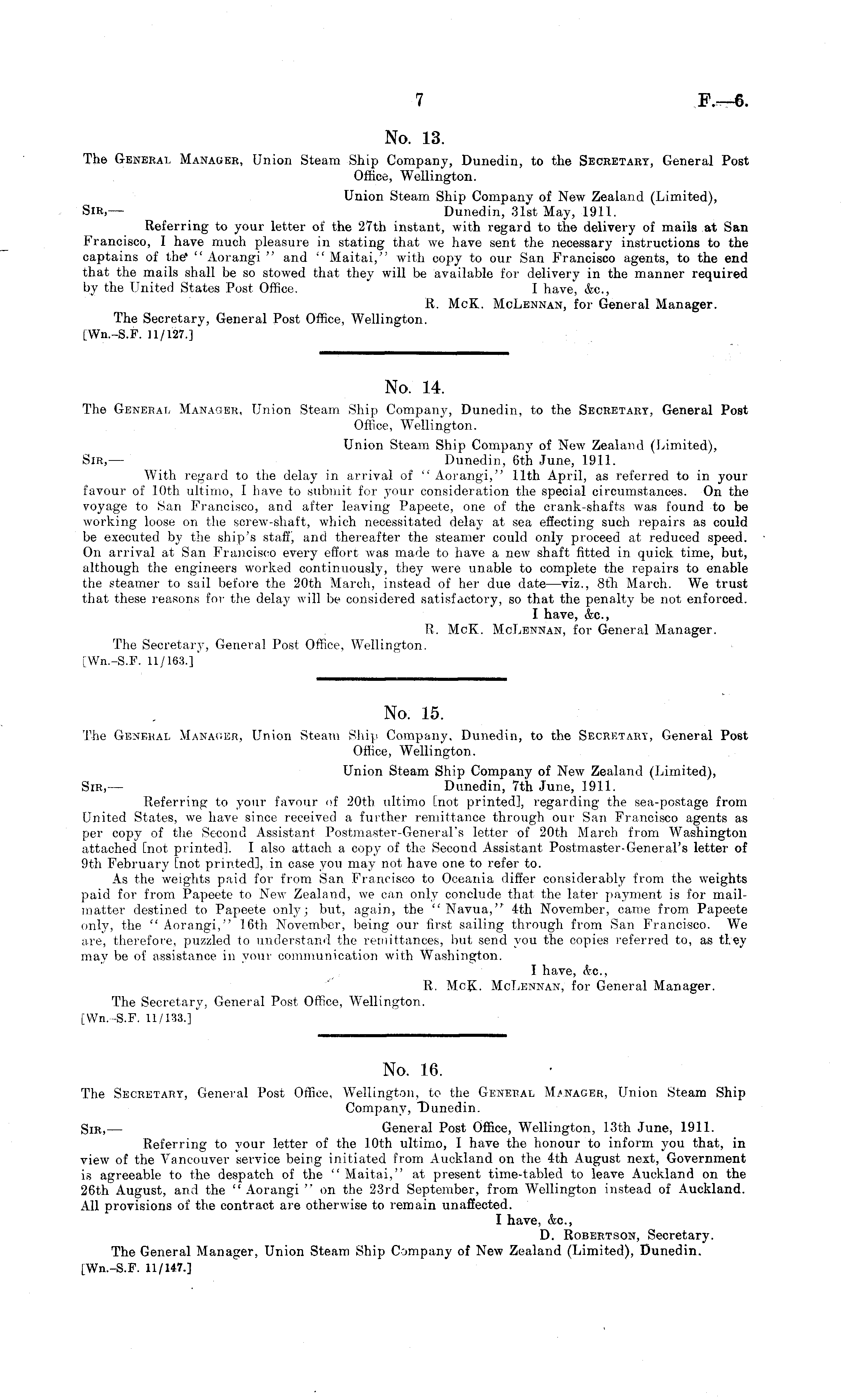 No. 14. The General Manager, Union Steam Ship Company, Dunedin, to the Secretary, General Post Office, Wellington. Union Steam Ship Company of New Zealand (Limited), Sir, — Dunedin, 6th June, 1911. With regard to the delay in arrival of " Aorangi," 11th April, as referred to in your favour of 10th ultimo, I have to submit for your consideration the special circumstances. On the voyage to San Francisco, and after leaving Papeete, one of the crank-shafts was found to be working loose on the screw-shaft, which necessitated delay at sea effecting such repairs as could be executed by the ship's staff, and thereafter the steamer could only proceed at reduced speed. On arrival at San Francisco every effort was made to have a new shaft fitted in quick time, but, although the engineers worked continuously, they were unable to complete the repairs to enable the steamer to sail before the 20th March, instead of her due date —viz., Bth March. We trust that these reasons for the delay will be considered satisfactory, so that the penalty be not enforced. I have, &c, R. McK. McLennan, for General Manager. The Secretary, General Post Office, Wellington. [Wn.-S.F. 11/163.]'