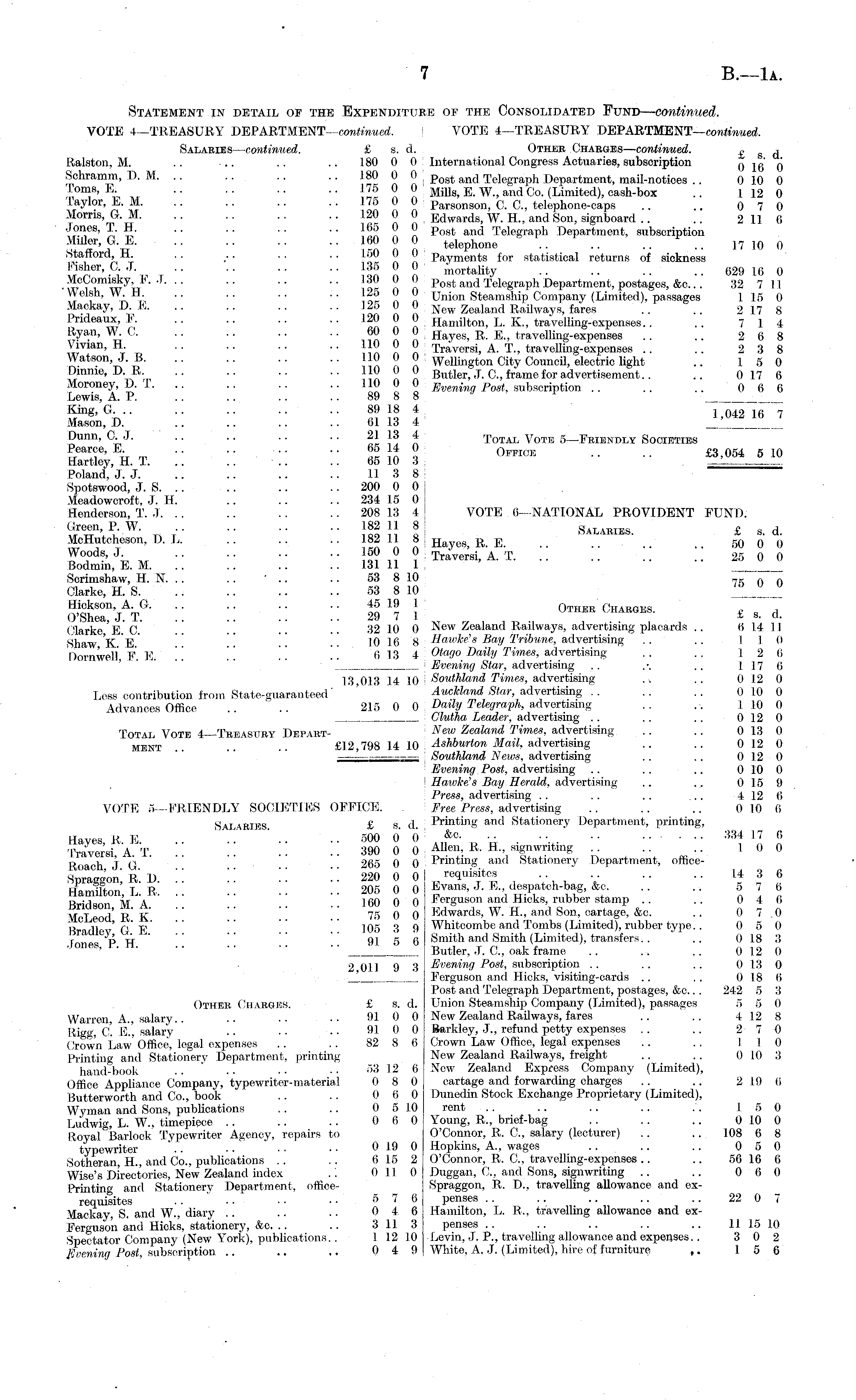 Statement in detail of the Expenditure op the Consolidated Fund— continued. VOTE 4—TREASURY DEPARTMENT— continued. VOTE 4—TREASURY DEPARTMENT— continued. Salaries— continued. £ s. d. Other Charges— continued. £ s d Ralston, M. .. ■.. .. .. 180 0 0 International Congress Actuaries, subscription 016 0 Schramm, D. M. .. .. .. 180 0 0 , p ost and Telegraph Department, mail-notices .. 010 0 Toms, E. .. .. .. .. 175 0 0 M m S; c. W., and Co .(Limited), cash-box .. 112 0 Taylor, E. M .. .. 175 0 0 p argonsO n. C. C, telephone-caps .. .. 0 7 0 Morris, G. M. .. .. .. .. 120 0 0 Edwards, W. H., and Son, signboard .. 211 6 Jones, T. H. .. .. . . 165 0 0 p ost and Telegraph Department, subscription Miller, GE 160 0 0 te i ephone ~ 17 10 0 .Stattord, H. . . .. .. .. 150 0 U Payments for statistical returns of sickness lusher, 0. J 35 0 0 mOTta]ity 629 lf) () McComisky b\ J. . . .. .. .. 130 0 0 p O st and Telegraph Department, postages, &c... 32 711 Welsh, W. H. .. .. .. .. 125 0 0 Union Steamship Company (Limited), passages 115 0 Mackay, D. X .. .. .. 125 0 0 e w Zealand Railways, fares .. .. 217 8 Prideaux, F. .. .. .. .. 120 0 0 Hamilton, L. X., travelling-expenses. . .. 714 Ryan, W. C. .. .. .. .. 60 0 0 Hayes, R. E., travelling-expenses .. .. 2 6 8 \ivian, H. .. .. .. 110 0 0 Traversi, A. T., travelling-expenses .. .. 2 3 8 Watson, J. B. .. .. .. 110 0 0 Wellington City Council, electric light .. 15 0 Dmme, D. R, .. .. .. .. 110 0 0 Butler, J, C, frame for advertisement.. .. 017 6 Aloroney, D. T. .. .. .. 110 0 0 g wem Post subscription .. .. .. 0 6 6 Lewis, A. P. . . .. .. .. 89 8 8 J l King, G 89 18 4 1 042 16 7 Mason, D. .. 61 13 4 _I___l___ Dunn, C. ,T. .. .. .. . . 21 13 4 Total Vote s—Friendly Societies Pearoe, E. 65 14 0 OrFIOE __ £3 og4 g 1Q Hartley, H. T. .. .. .. .. 65 10 3 Poland, J. J. .. .. .. .. 11 3 8 Spotswood, J. S. .. .. .. .. 200 0 0 Meadowcroft, J. H. .. .. .. 234 15 0 Henderson, T. J. .. .. . . 208 13 4 i VOTE 6—NATIONAL PROVIDENT FUND. Green, P. W. .. .. .. .. 182 11 8 Salaries £ s d McHuteheson, D. L. 182 11 8! H E _ _ ..''.. .. 50 0 6 ?°? d !> J - „ J?) 0 ? Traversi, A. T 25 0 0 Bodmin, E. M. .. .. .. 131 11 1 Scrimshaw, H. N. .. ...... 53 8 10 7fi n ft Clarke, H. S 53 8 10 _„_._ Hickson, A. G. . . . . . . . . 45 19 1 ("iTm™ Cirißmre O'Shea J. T 29 7 1 J EX ° HAB(as - £ s. d. Clarke EC .. 32 10 0 New Zealand Railways, advertising placards .. 614 11 Shaw X E 10 16 8 Hawke's Bay Tribune, advertising .. .. 110 Dornweli, F. E. '.'. '.'. '.'■ ■ ■ 013 4 Otago Daily Times, advertising .... 12 6 i Evening Star, advertising .. .-. .. 117 6 13 013 14 10 [ Southland Times, advertising ~ .. 0 12 0 Less contribution from State-guaranteed' Auckland Star, advertising .. .. .. 0 10 0 Advances Office .. .. 215 0 0 Daily Telegraph, advertising .. ~ 1 10 0 Glutha Leader, advertising . . .. .. 0 12 0 Total Vote 4—Treasury Depart- Zealand Times, advertising .. .. 013 0 MEKT £12,798 14 10 Ashburton Mail, advertising .. .. 0 12 0 Southland News, advertising .. .. 0 12 0 Evening Post, advertising .. .. .. 0 10 0 Hawke's Bay Herald, advertising .. .. 0 15 9 Press, advertising .. . . .. .. 4 12 6 VOTE 5 -FRIENDLY SOCIETIES OFFICE. Free Press, advertising .. .. .. 0 10 (i Sai <UUES £ s<l Printing and Stationery Department, printing, Haves, R, X .. '..'.. .. 500 0 0 ..f c - „ . ••. •• •• ••• 3S f " « Traversi, A. T 390 0 0 Allen, R. H. sigmvriting . 10 0 , j ,t 265 0 0 Printing and Stationery Department, officeSpraggon, R. D. '.'. '.'. '.'. !! 220 0 Ol requisites .. 14 3 6 H iltron I R 205 0 0 j Evans, J. h., despatch-bag, &c. .. .. o 7 6 Bridson M. A. '■'. '■'■ 160 00 ] Ferguson and Hicks, rubber stamp .. .. 04 6 \T>T l' Rk' 75 0 0 Edwards, W. H., and Son, cartage, &c. .. 0 7 0 R J ]l /of' 105 3 9 Whitcombe and Tombs (Limited), rubber type.. 0 5 0 ' -U v'■ •■ • ■ ■ y m jth and Smith (Limited), transfers.. .. 018 3 • lones ' V - n ■■ " 1 Butler, ,T. C, oak frame .. .. 012 0 2 011 9 3 Evening Post, subscription .. .. .. 0 13 0 _J_ Ferguson and Hicks, visiting-cards . . . . 0 18 6 Post and Telegraph Department, postages, &c... 242 5 3 Other Charges. £ s. d. Union Steamship Company (Limited), passages 5 5 0 Warren, A., salary.. .. .. .. 91 0 0 New Zealand Railways, fares .. .. 412 8 Rig", c! E.'. salary .. .. .. 91 0 0 Barkley, J., refund petty expenses .. .. 27 0 Crown Law' Office, legal expenses .. ..82 8 6 Crown Law Office, legal expenses .. . . 110 Printing and Stationery Department, printing New Zealand Railways, freight .. .. 0 10 3 hand-book .. •■ ■• ■■ 53 12 6 New Zealand Express Company (Limited), Office Appliance Company, typewriter-material 0 8 0 cartage and forwarding charges .. .. 219 6 Butterworth and Co., book .. .. 0 6 0 Dunedin Stock Exchange Proprietary (Limited), Wyman and Sons, publications .. .. 0 5 1.0 rent . . .. .. . . . . 15 0 Ludwig, L. W., timepiece .. .. .. 0 6 0 Young, R., brief-bag . . .. .. 010 0 Royal Barlock Typewriter Agency, repairs to O'Connor, R. C, salary (lecturer) .. .. 108 6 8 typewriter ' . .. ■■ •■ 0 19 0 Hopkins, A., wages .. .. .. 0 5 0 Sotheran, H., and Co., publications .. .. 615 2 O'Connor, R. C, travelling-expenses.. .. 56 16 6 Wise's Directories, New Zealand index .. 0 11 0 Duggau, C, and Sons, signwriting .. .. 0 6 0 Printing and Stationery Department, office- Spraggon, R. D., travelling allowance and exrequisites . ... ■ ■ • • 57 6 penses .. .. .. .. .. 22 0 7 Mackay S. and W., diary .. .. ■ ■ 0 4 6 Hamilton, L. R., travelling allowance and exFerguson and Hicks, stationery, &c. .. .. 3 113 penses .. .. .. .. .. 11 15 10 Spectator Company (New York), publications. . 1 12 10 Levin, J. P., travelling allowance and expenses.. 3 0 2 Evening Post, subscription .. .. ~ 04 9 White, A, J. (Limited), hire of furniture ~ 15 6