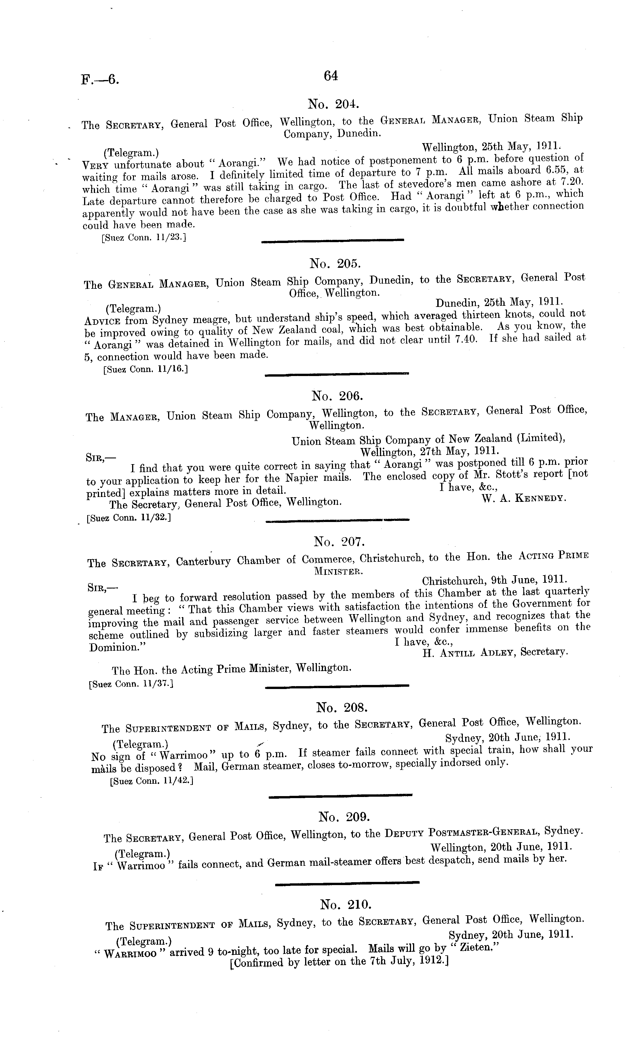 No. 205. The General Manager, Union Steam Ship Company, Dunedin, to the Secretary, General Post Office, Wellington. (Tele ram ) Dunedin, 25th May, 1911. Advice 6 feom Sydney meagre, but understand ship's speed, which averaged thirteen knots, could not be Improved owing to quality of New Zealand coal, which was best obtainable. As you know, the "Aorangi " was detained in Wellington for mails, and did not clear until 7.40. If she had sailed at 5, connection would have been made. [Suez Conn. 11/16.] __