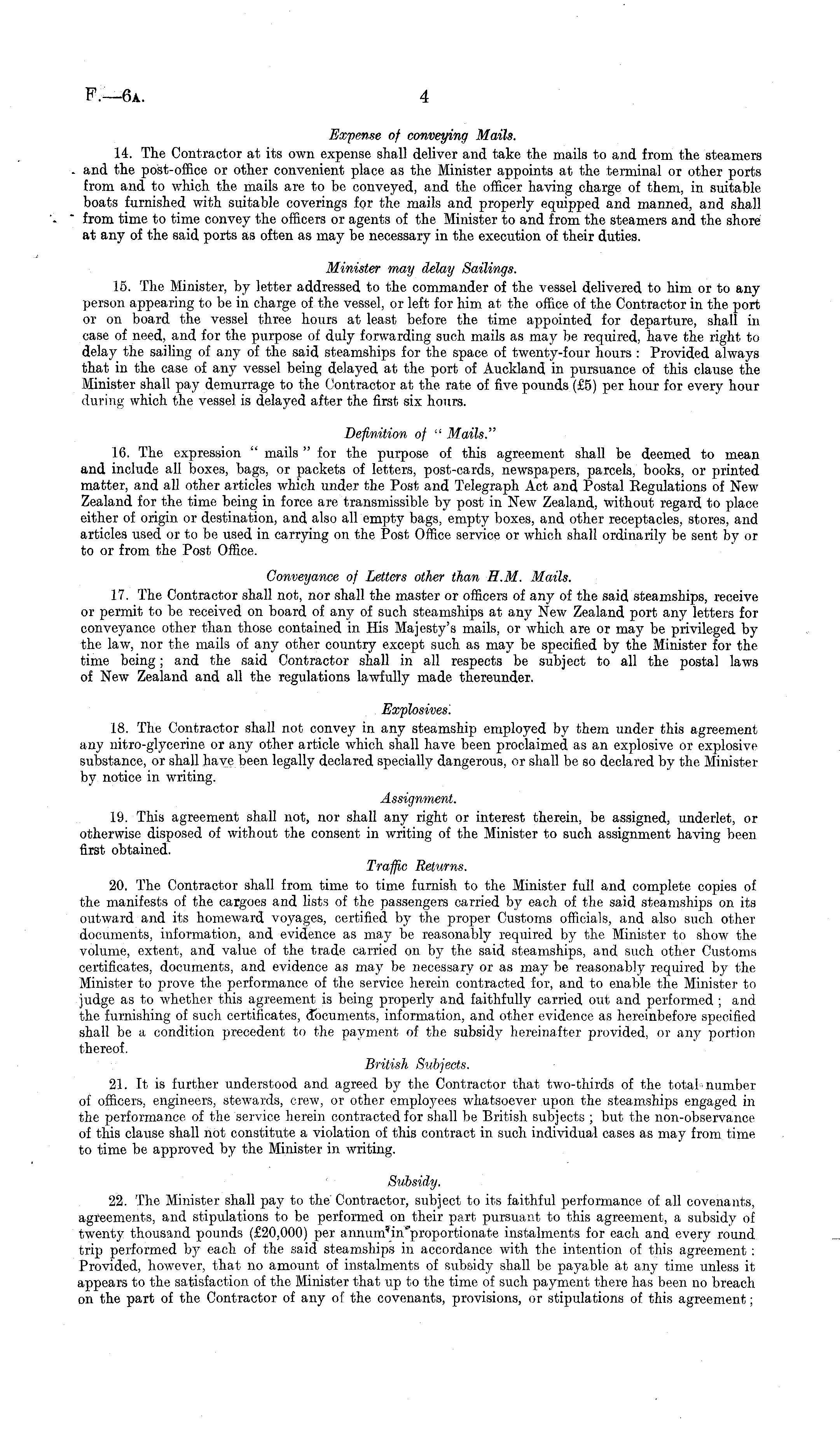 Expense of conveying Mails. 14. The Contractor at its own expense shall deliver and take the mails to and from the steamers and the post-office or other convenient place as the Minister appoints at the terminal or other ports from and to which the mails are to be conveyed, and the officer having charge of them, in suitable boats furnished with suitable coverings for the mails and properly equipped and manned, and shall from time to time convey the officers or agents of the Minister to and from the steamers and the shore at any of the said ports as often as may be necessary in the execution of their duties. Minister may delay Sailings. 15. The Minister, by letter addressed to the commander of the vessel delivered to him or to any person appearing to be in charge of the vessel, or left for him at the office of the Contractor in the port or on board the vessel three hours at least before the time appointed for departure, shall in case of need, and for the purpose of duly forwarding such mails as may be required, have the right to delay the sailing of any of the said steamships for the space of twenty-four hours : Provided always that in the case of any vessel being delayed at the port of Auckland in pursuance of this clause the Minister shall pay demurrage to the Contractor at the rate of five pounds (£5) per hour for every hour during which the vessel is delayed after the first six hours. Definition of " Mails." 16. The expression " mails " for the purpose of this agreement shall be deemed to mean and include all boxes, bags, or packets of letters, post-cards, newspapers, parcels, books, or printed matter, and all other articles which under the Post and Telegraph Act and Postal Regulations of New Zealand for the time being in force are transmissible by post in New Zealand, without regard to place either of origin or destination, and also all empty bags, empty boxes, and other receptacles, stores, and articles used or to be used in carrying on the Post Office service or which shall ordinarily be sent by or to or from the Post Office. Conveyance of Letters other than H.M. Mails. 17. The Contractor shall not, nor shall the master or officers of any of the said steamships, receive or permit to be received on board of any of such steamships at any New Zealand port any letters for conveyance other than those contained in His Majesty's mails, or which are or may be privileged by the law, nor the mails of any other country except such as may be specified by the Minister for the time being; and the said Contractor shall in all respects be subject to all the postal laws of New Zealand and all the regulations lawfully made thereunder. Explosives'. 18. The Contractor shall not convey in any steamship employed by them under this agreement any nitro-glycerine or any other article which shall have been proclaimed as an explosive or explosive substance, or shall have been legally declared specially dangerous, or shall be so declared by the Minister by notice in writing. Assignment. 19. This agreement shall not, nor shall any right or interest therein, be assigned, underlet, or otherwise disposed of without the consent in writing of the Minister to such assignment having been first obtained. Traffic Returns. 20. The Contractor shall from time to time furnish to the Minister full and complete copies of the manifests of the cargoes and lists of the passengers carried by each of the said steamships on its outward and its homeward voyages, certified, by the proper Customs officials, and also such other documents, information, and evidence as may be reasonably required by the Minister to show the volume, extent, and value of the trade carried on by the said steamships, and such other Customs certificates, documents, and evidence as may be necessary or as may be reasonably required by the Minister to prove the performance of the service herein contracted for, and to enable the Minister to judge as to whether this agreement is being properly and faithfully carried out and performed ; and the. furnishing of such certificates, documents, information, and other evidence as hereinbefore specified shall be a condition precedent to the payment of the subsidy hereinafter provided, or any portion thereof. British Subjects. 21. It is further understood and agreed by the Contractor that two-thirds of the total number of officers, engineers, stewards, crew, or other emplo} r ees whatsoever upon the steamships engaged in the performance of the service herein contracted for shall be British subjects ; but the non-observance of this clause shall not constitute a violation of this contract in such individual cases as may from time to time be approved by the Minister in writing. Subsidy. 22. The Minister shall pay to the Contractor, subject to its faithful performance of all covenants, agreements, and stipulations to be performed on their part pursuant to this agreement, a subsidy of twenty thousand pounds (£20,000) per annum f in i °proportionate instalments for each and every round trip performed by each of the said steamships in accordance with the intention of this agreement : Provided, however, that no amount of instalments of subsidy shall be payable at any time unless it appears to the satisfaction of the Minister that up to the time of such payment there has been no breach on the part of the Contractor of any of the covenants, provisions, or stipulations of this agreement;