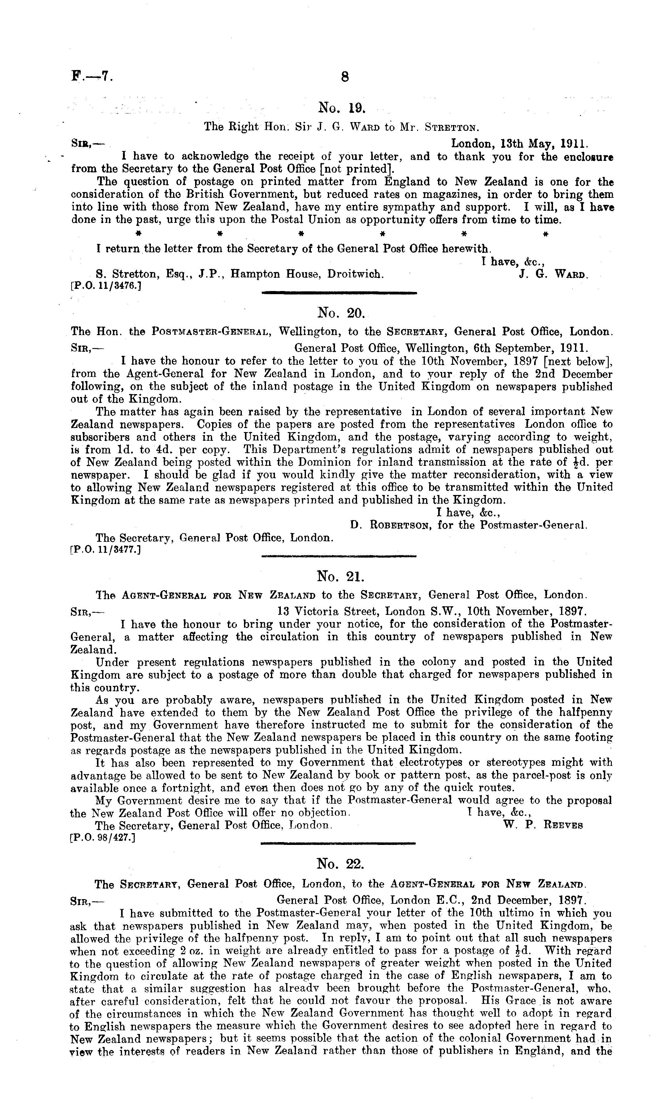 No. 19. The Right Hon: Sir J. G. Ward to Mr. Stretton. Sir,— London, 13th May, 1911. I have to acknowledge the receipt of your letter, and to thank you for the enclosure from the Secretary to the General Post Office [not printed]. The question of postage on printed matter from England to New Zealand is one for the consideration of the British Government, but reduced rates on magazines, in order to bring them into line with those from New Zealand, have my entire sympathy and support. I will, as I have done in the past, urge this upon the Postal Union as opportunity offers from time to time. • **#*» I return the letter from the Secretary of the General Post Office herewith. I have, &c, S. Stretton, Esq., J. P., Hampton House, Droitwich. J. G. Ward. [P.O. 11/3476.] —_»____»«««_»»__«___
