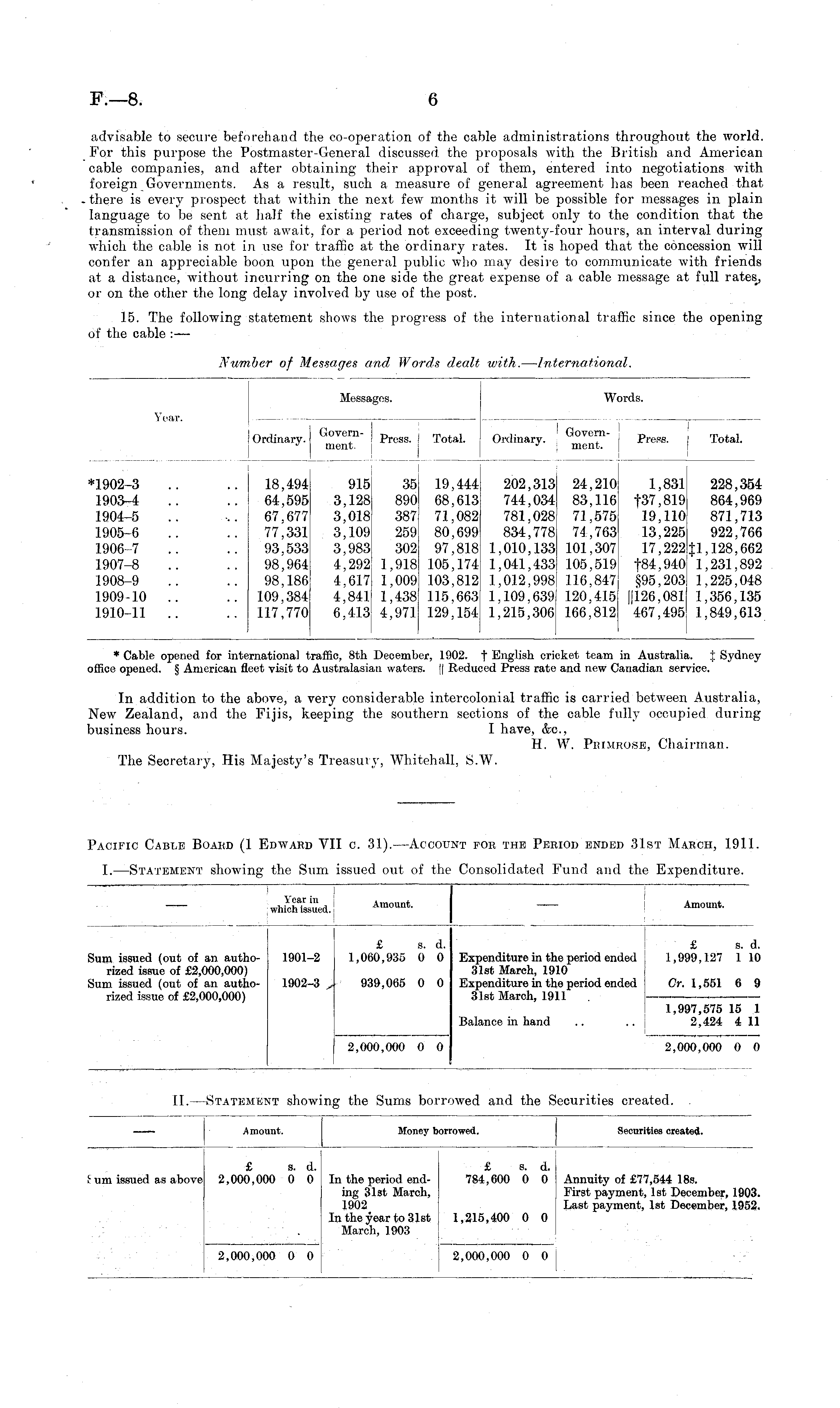 In addition to the above, a very considerable intercolonial traffic is carried between Australia, New Zealand, and the Fijis, keeping the southern sections of the cable fully occupied during business hours. I have, &c, H. W. Primrose, Chairman. The Secretary, His Majesty's Treasury, Whitehall, S.W.