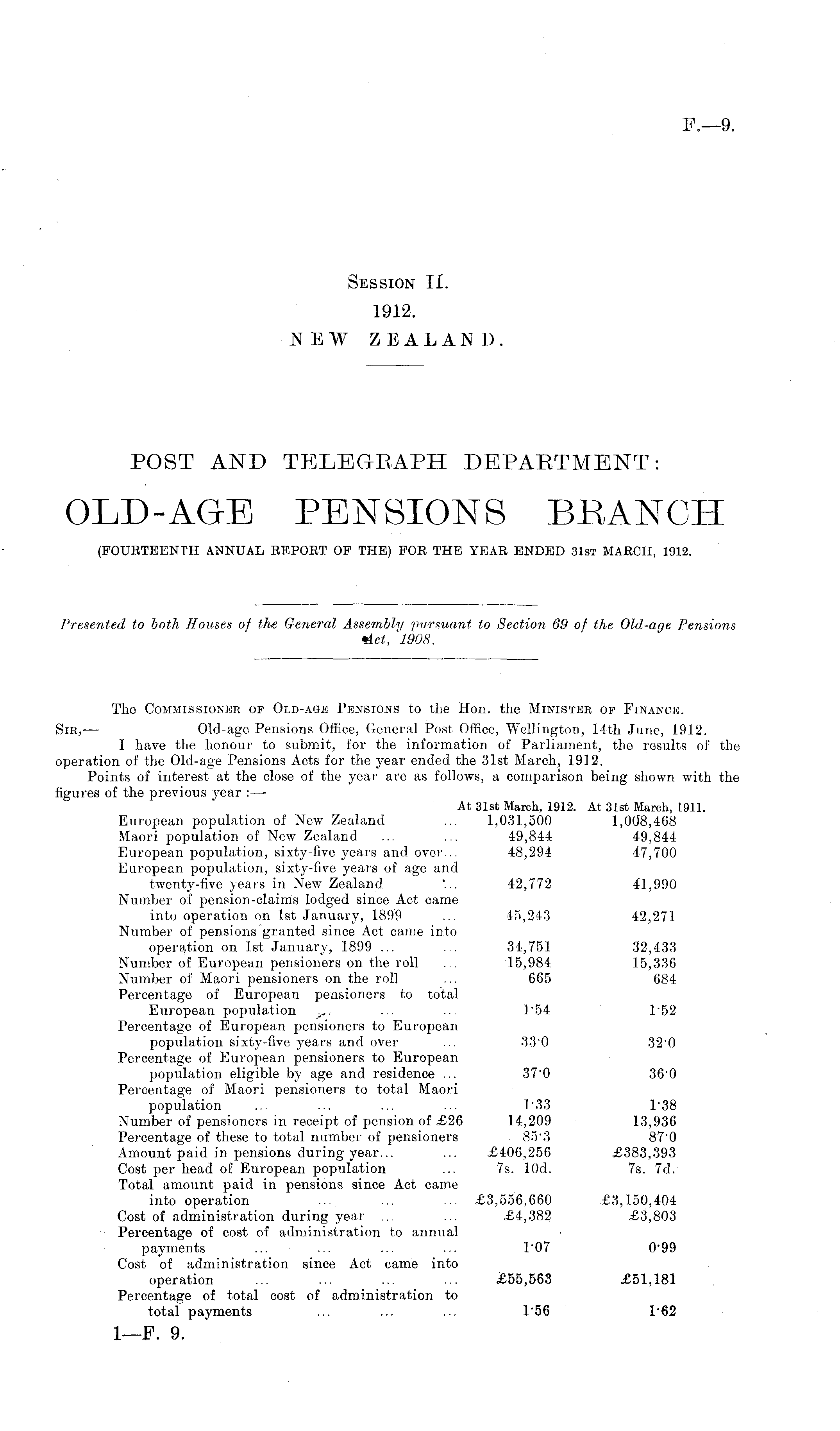 POST AND TELEGRAPH DEPARTMENT: OLD-AGE PENSIONS BRANCH (FOURTEENTH ANNUAL REPORT OF THE) FOR THE YEAR ENDED 31st MARCH, 1912.