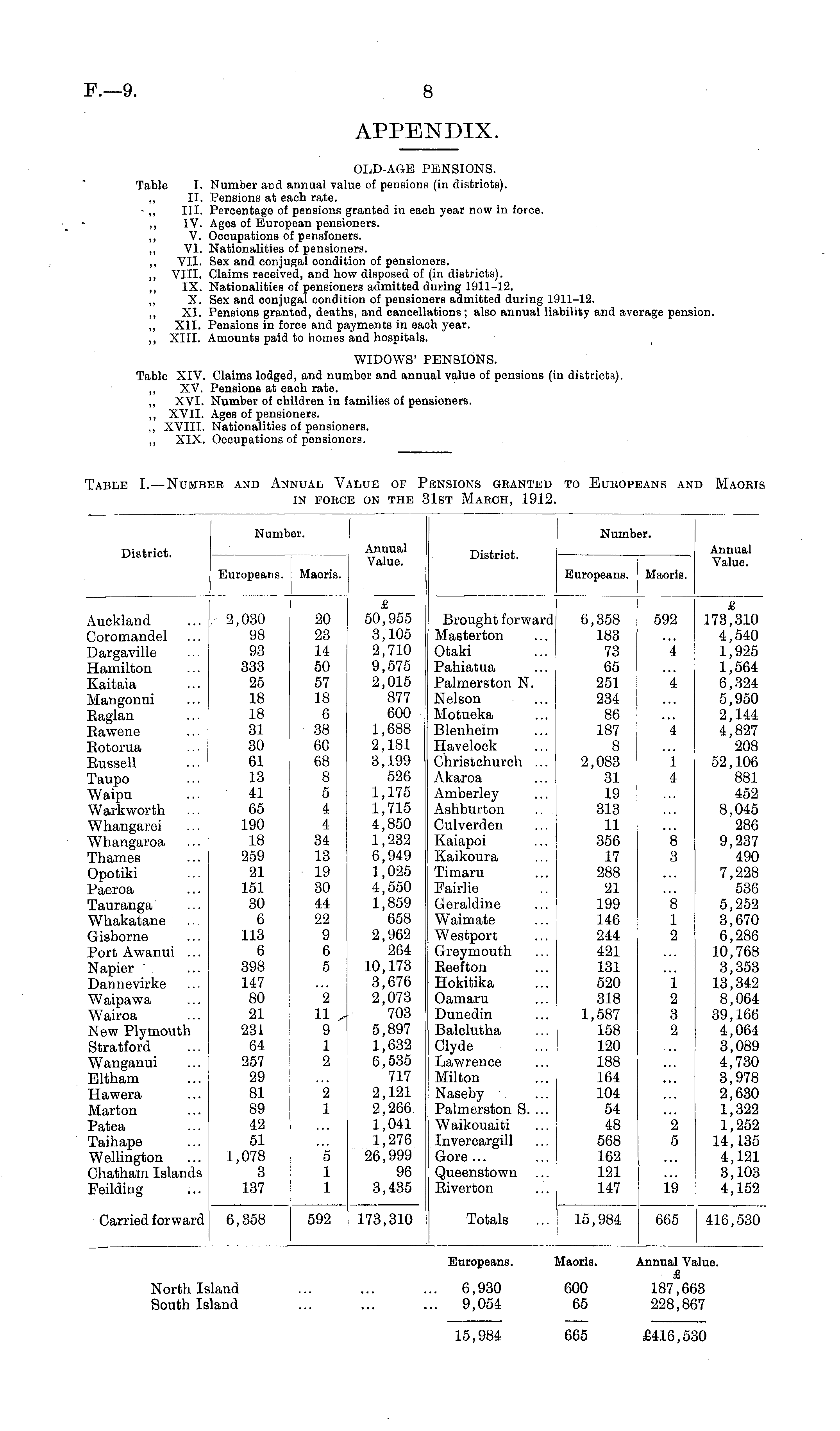 Table I. —Number and Annual Value of Pensions granted to Europeans and Maoris in force on the 31st March, 1912.